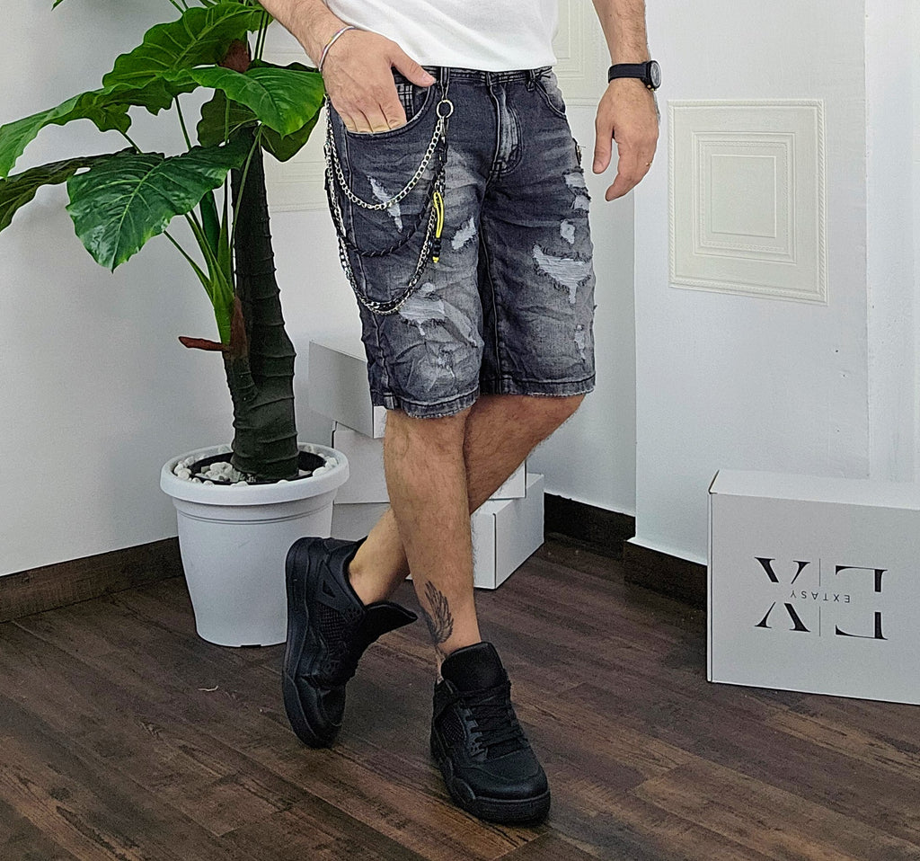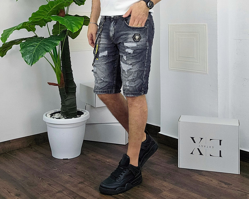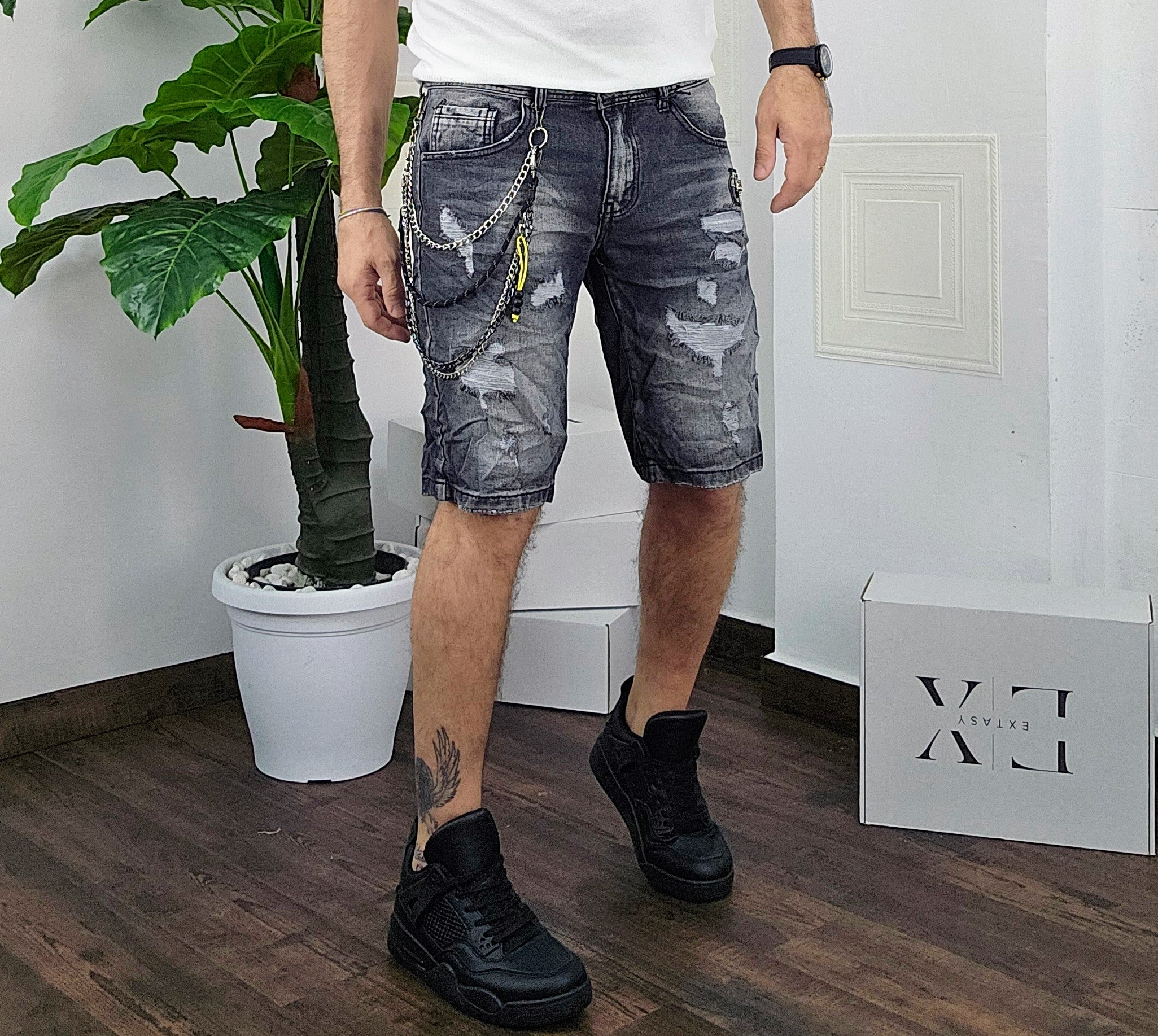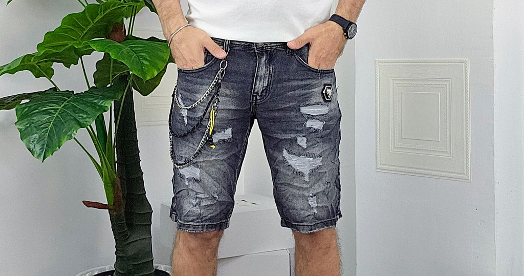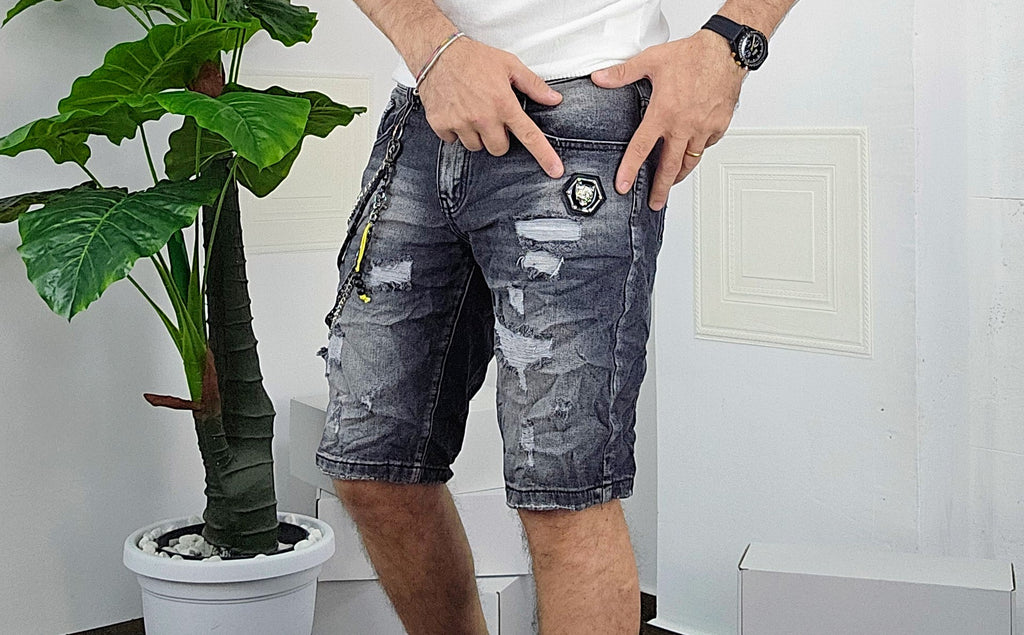 Bermuda 5 tasche sfumati con il grigio con strappi foderati e logo in rilievo lato sinistro dalla 42 alla 52,il modello in foto è alto 1.82x76kg è indossa una taglia 46.Prodotto Made in Italy