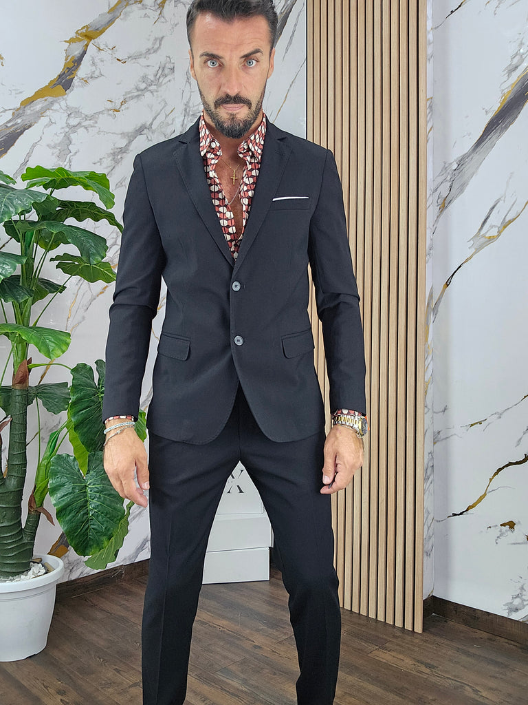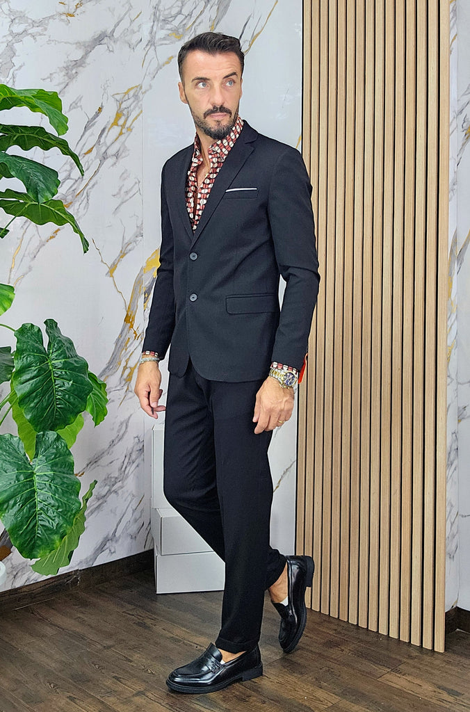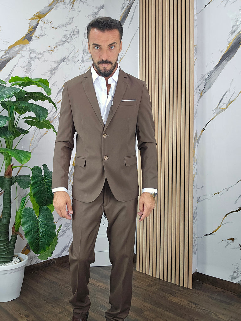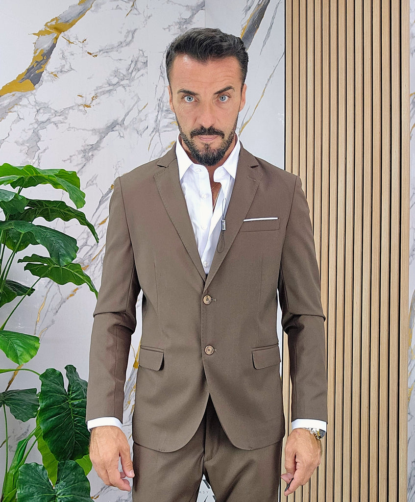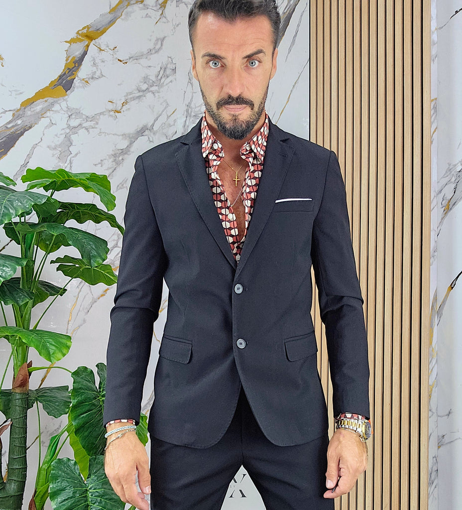 Abito slim fit elastico composto da una giacca chiusura 2 bottoni pantalone sartoriale con piega all'inglese dalla 44 alla 54,il modello in foto è alto 1.82x76kg è indossa una taglia 46.Prodotto Made in Italy