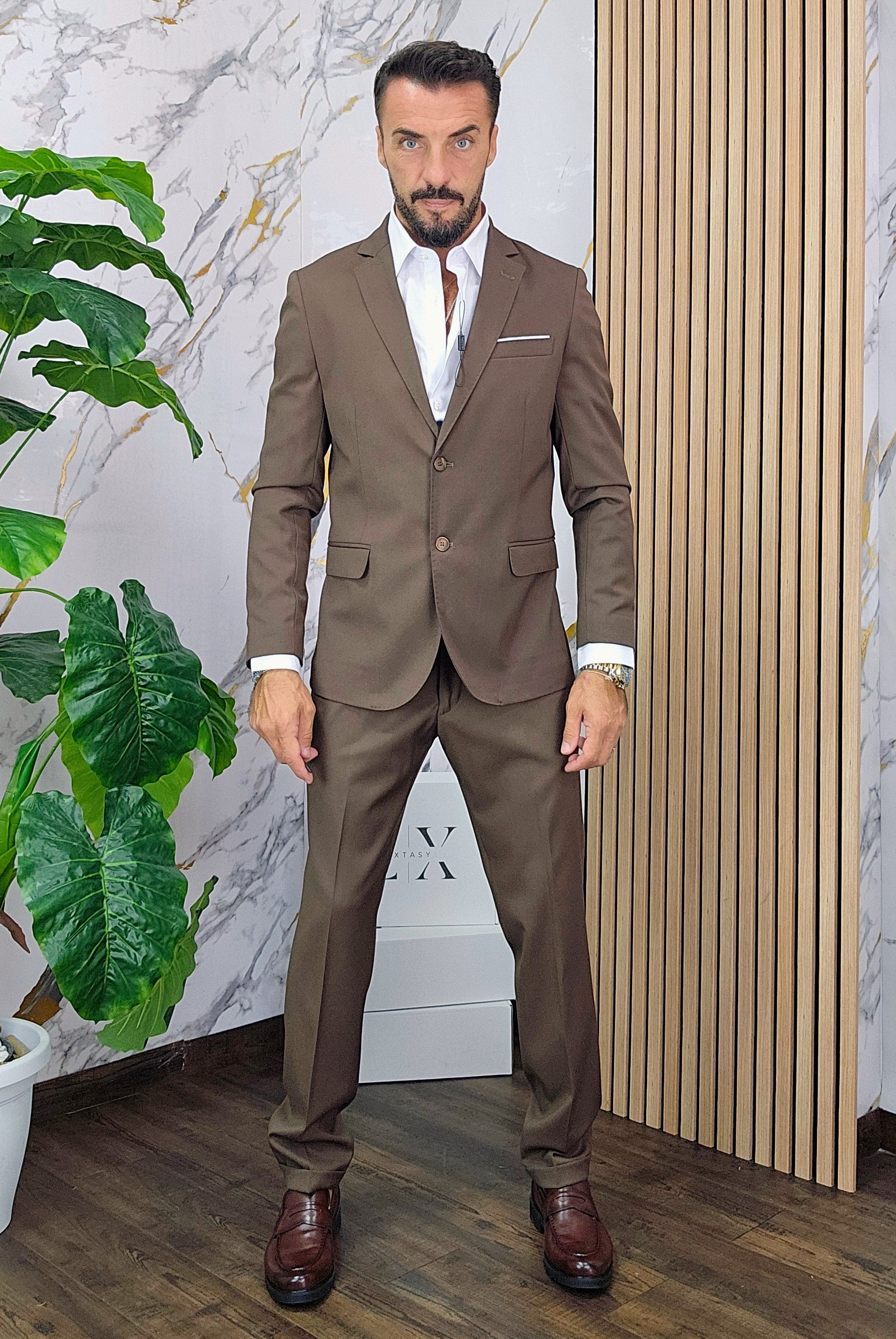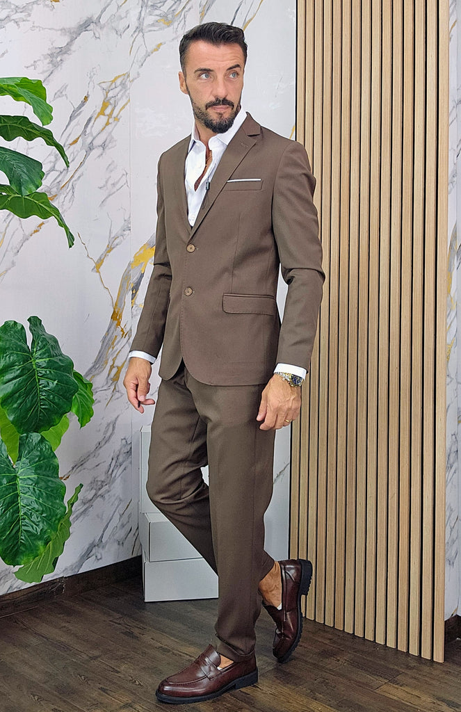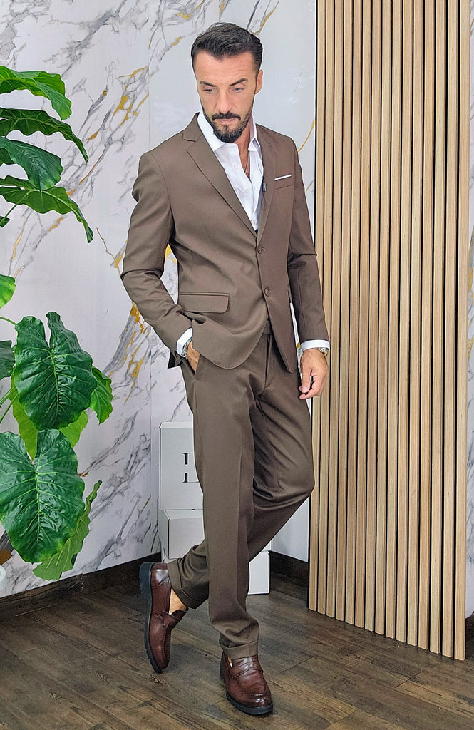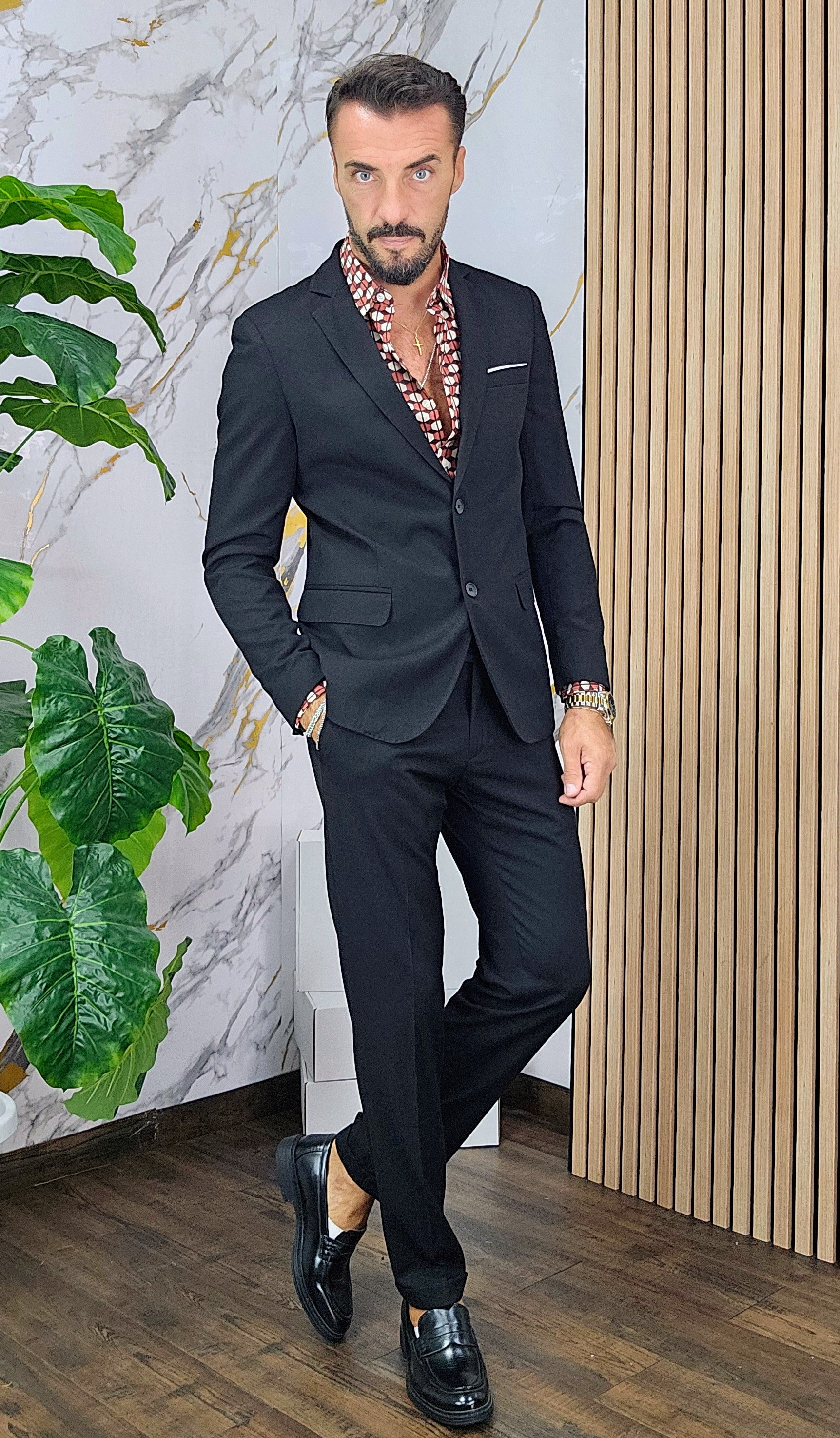 Abito slim fit elastico composto da una giacca chiusura 2 bottoni pantalone sartoriale con piega all'inglese dalla 44 alla 54,il modello in foto è alto 1.82x76kg è indossa una taglia 46.Prodotto Made in Italy