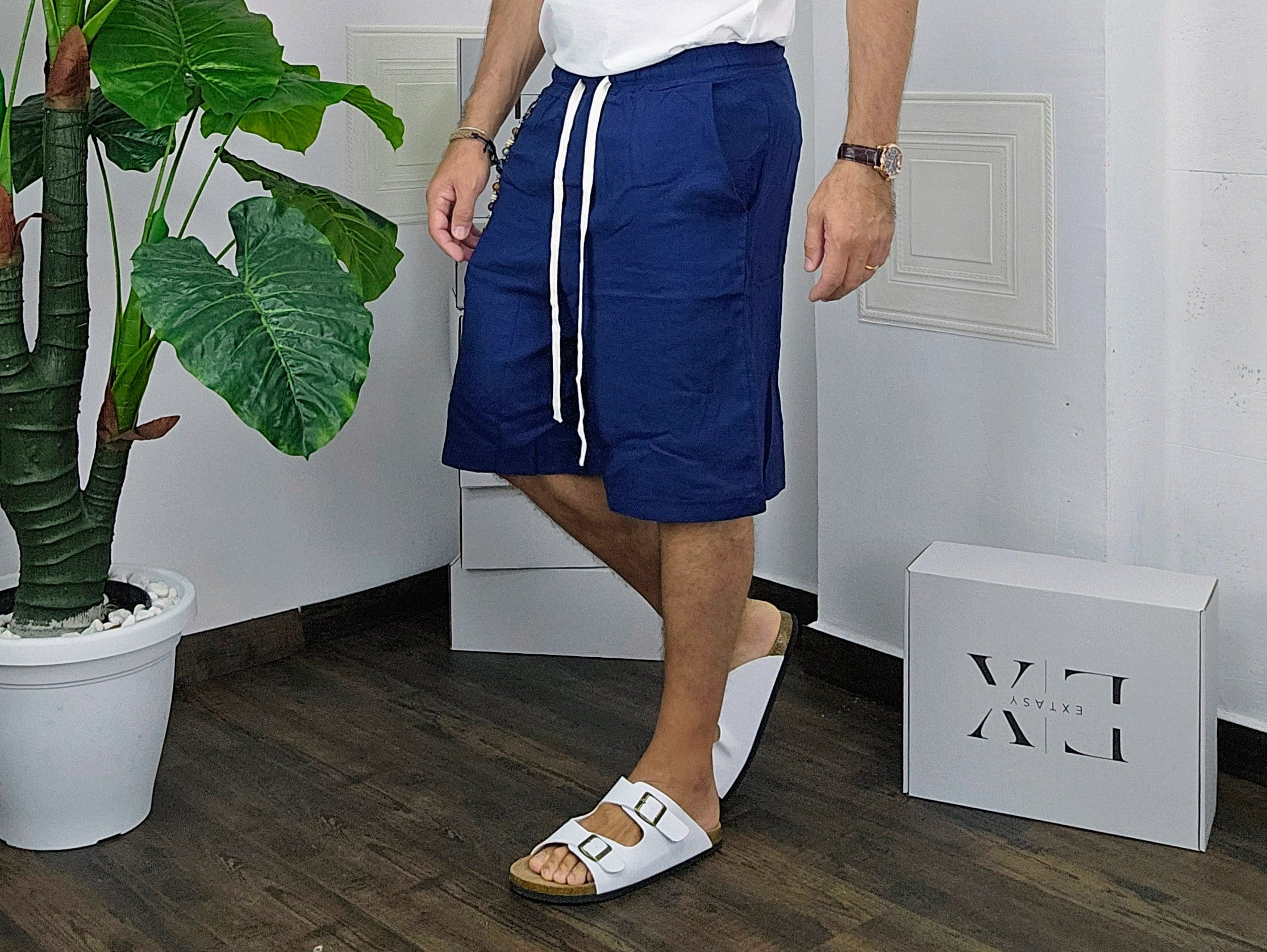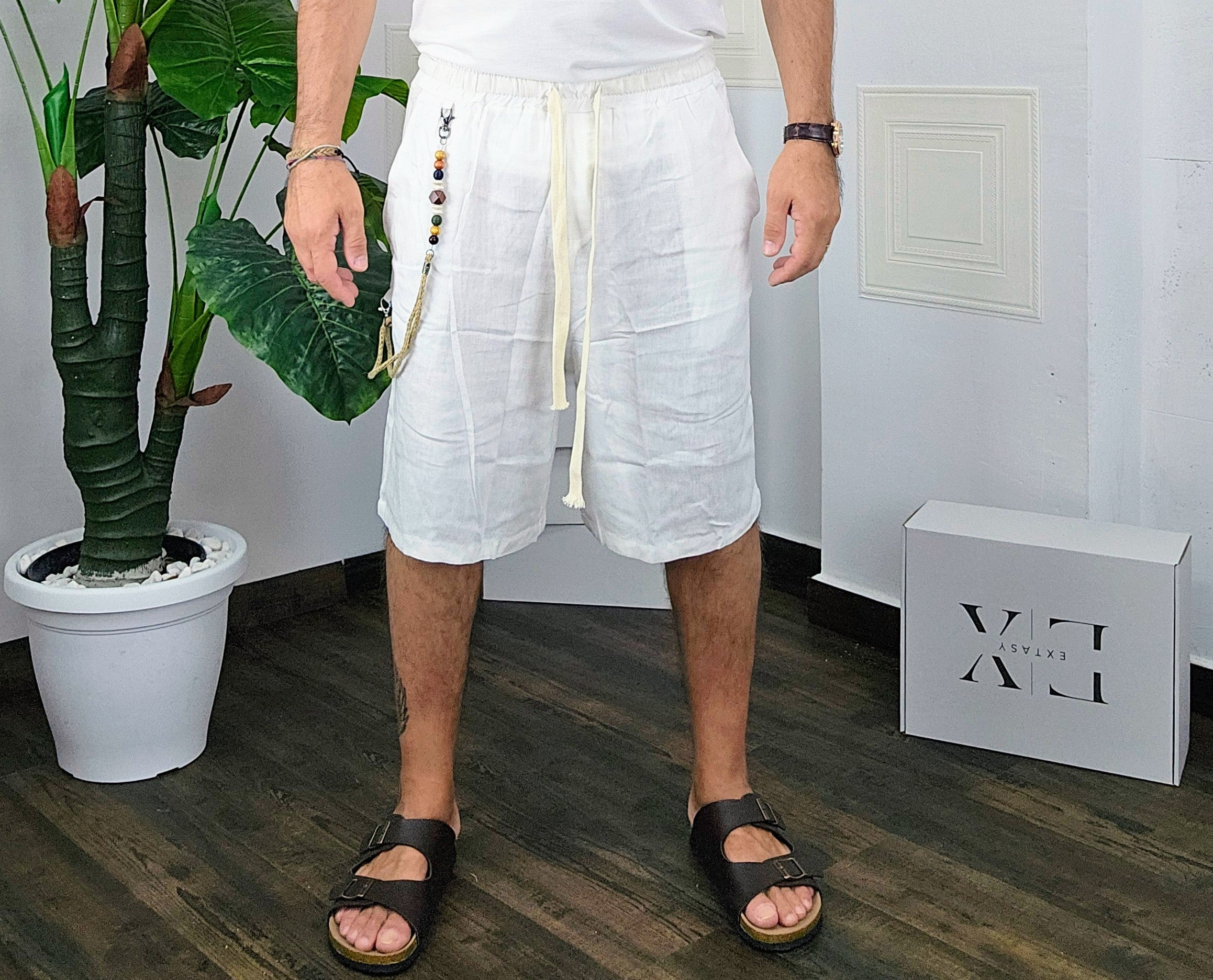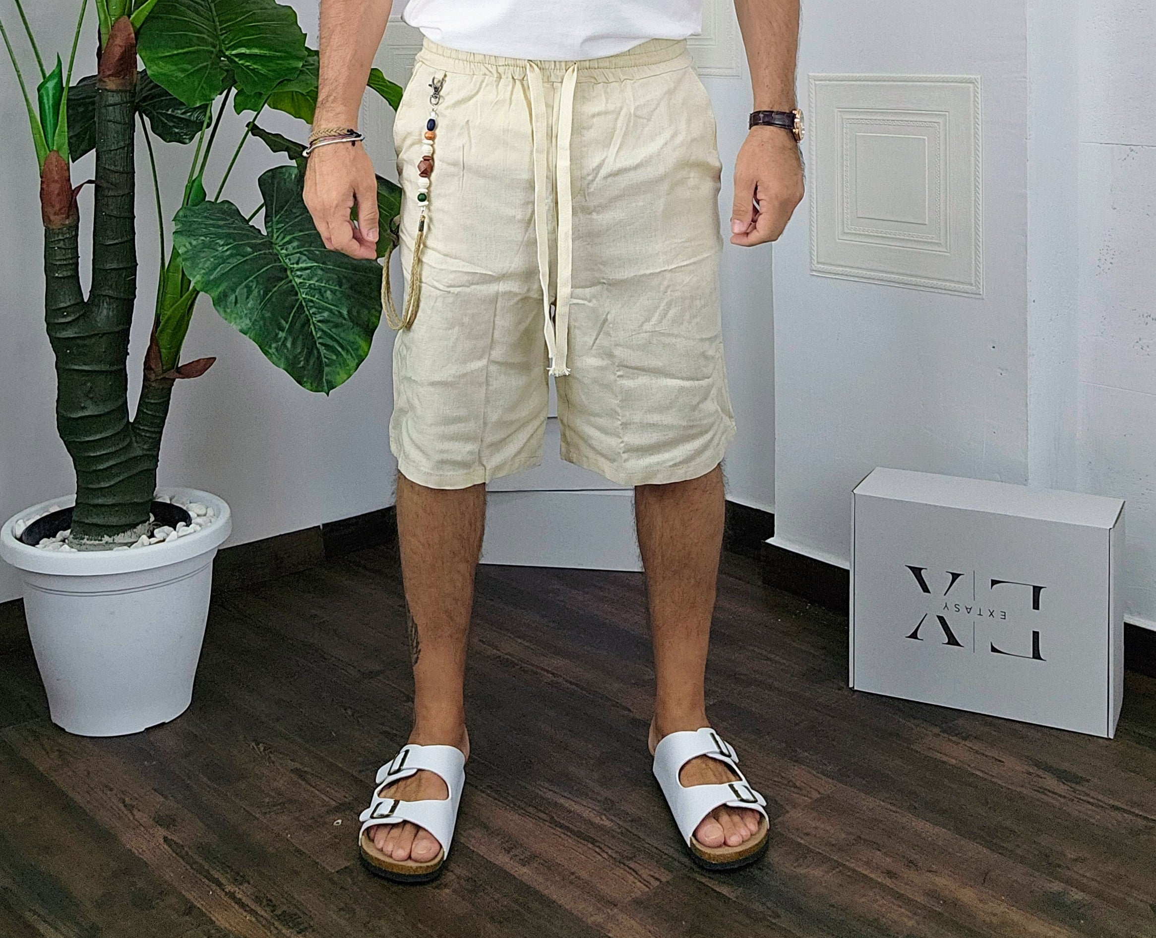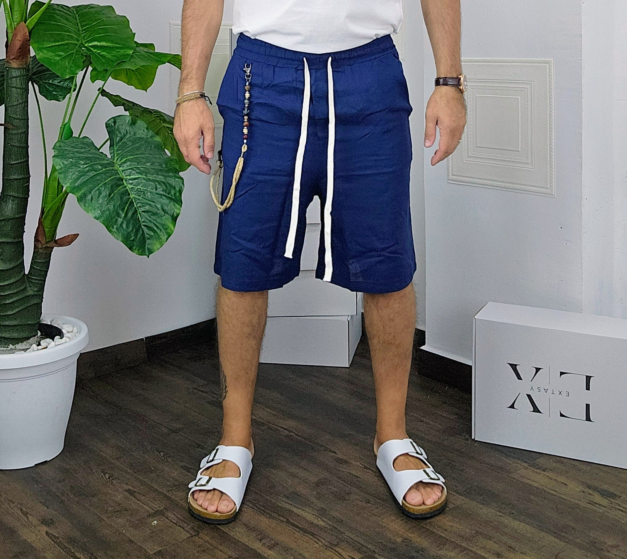 Bermuda in Lino calzata over con laccio regolabile dalla S alla XXL, il modello in foto è alto 1.82x76kg è indossa una taglia S.Prodotto Made in Italy
