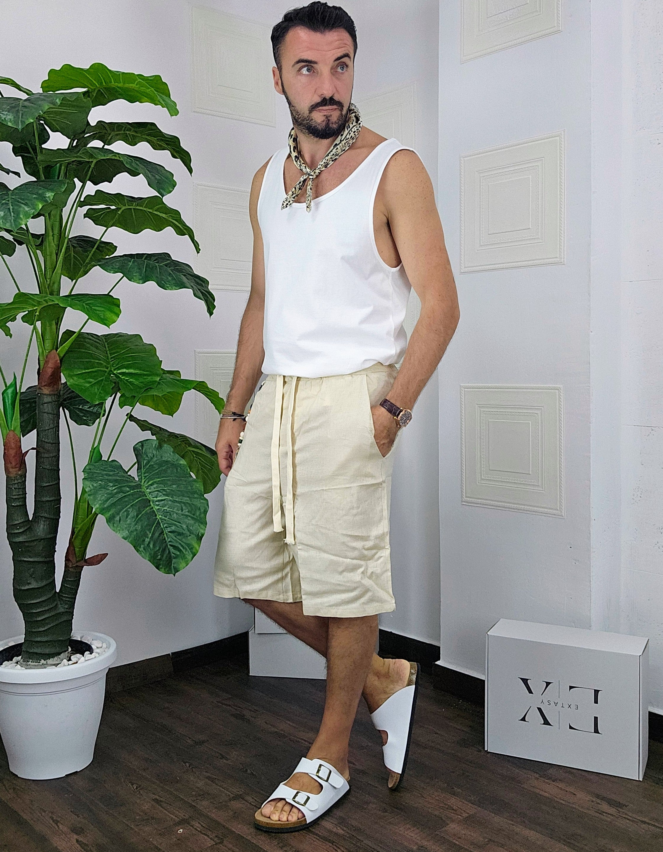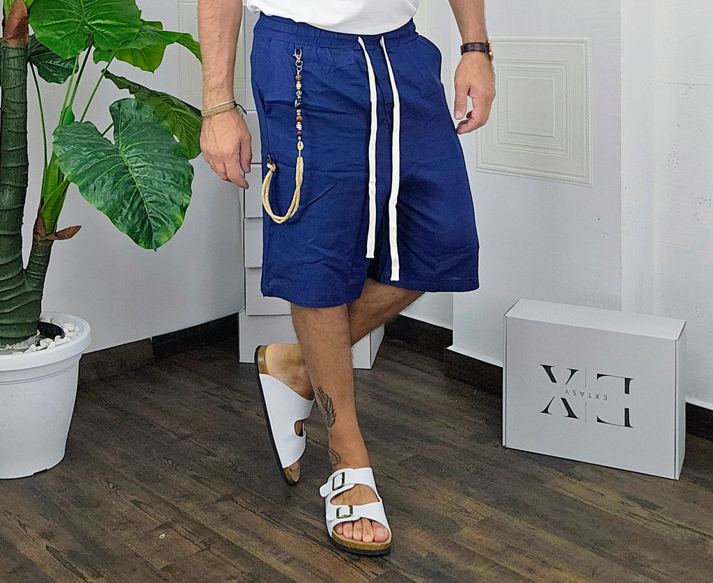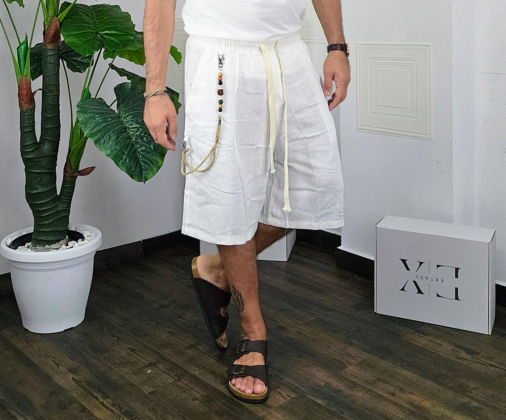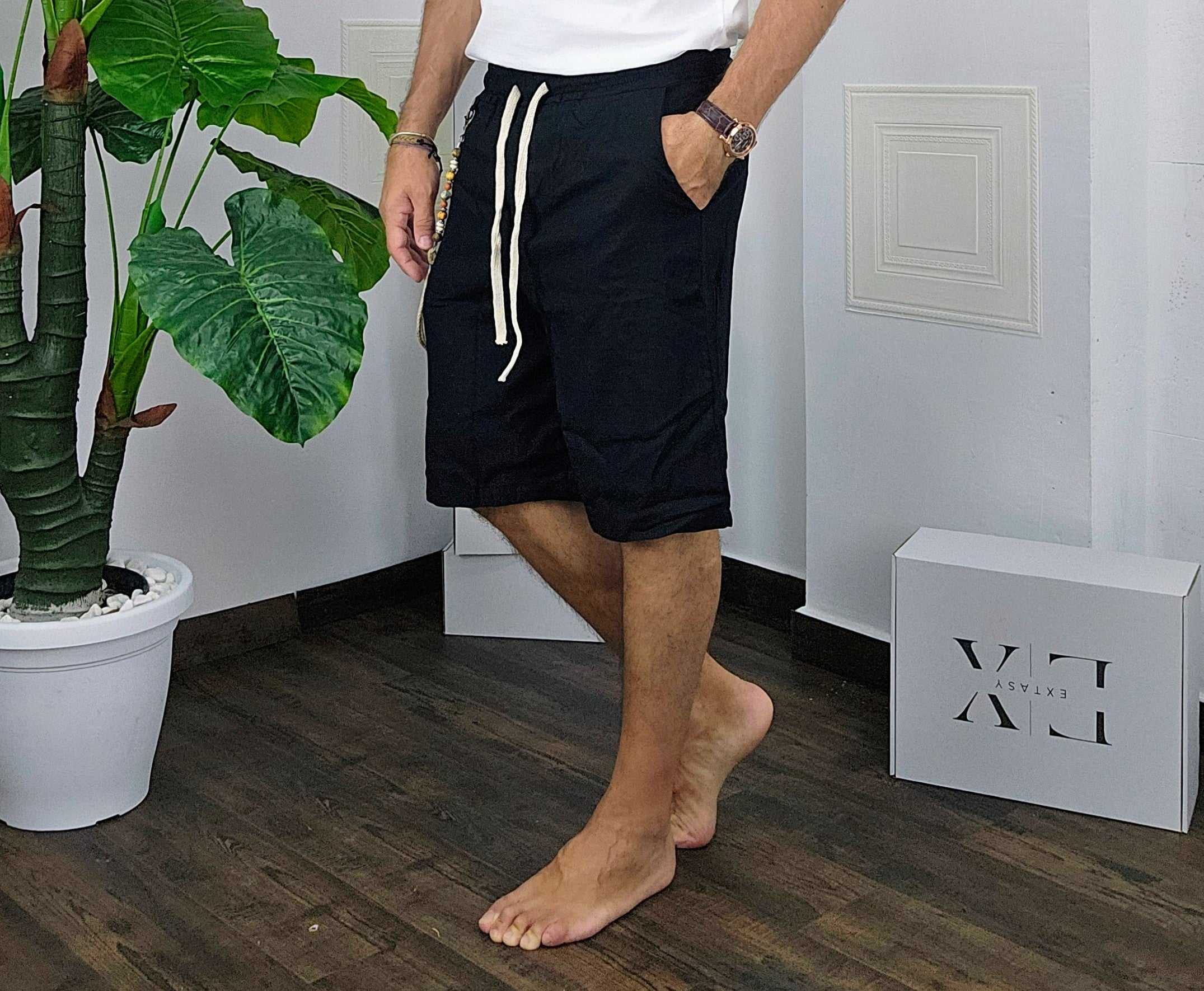 Bermuda in Lino calzata over con laccio regolabile dalla S alla XXL, il modello in foto è alto 1.82x76kg è indossa una taglia S.Prodotto Made in Italy