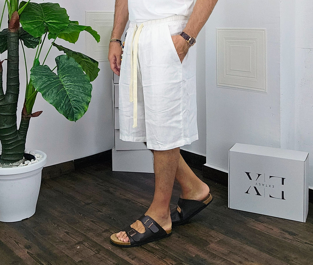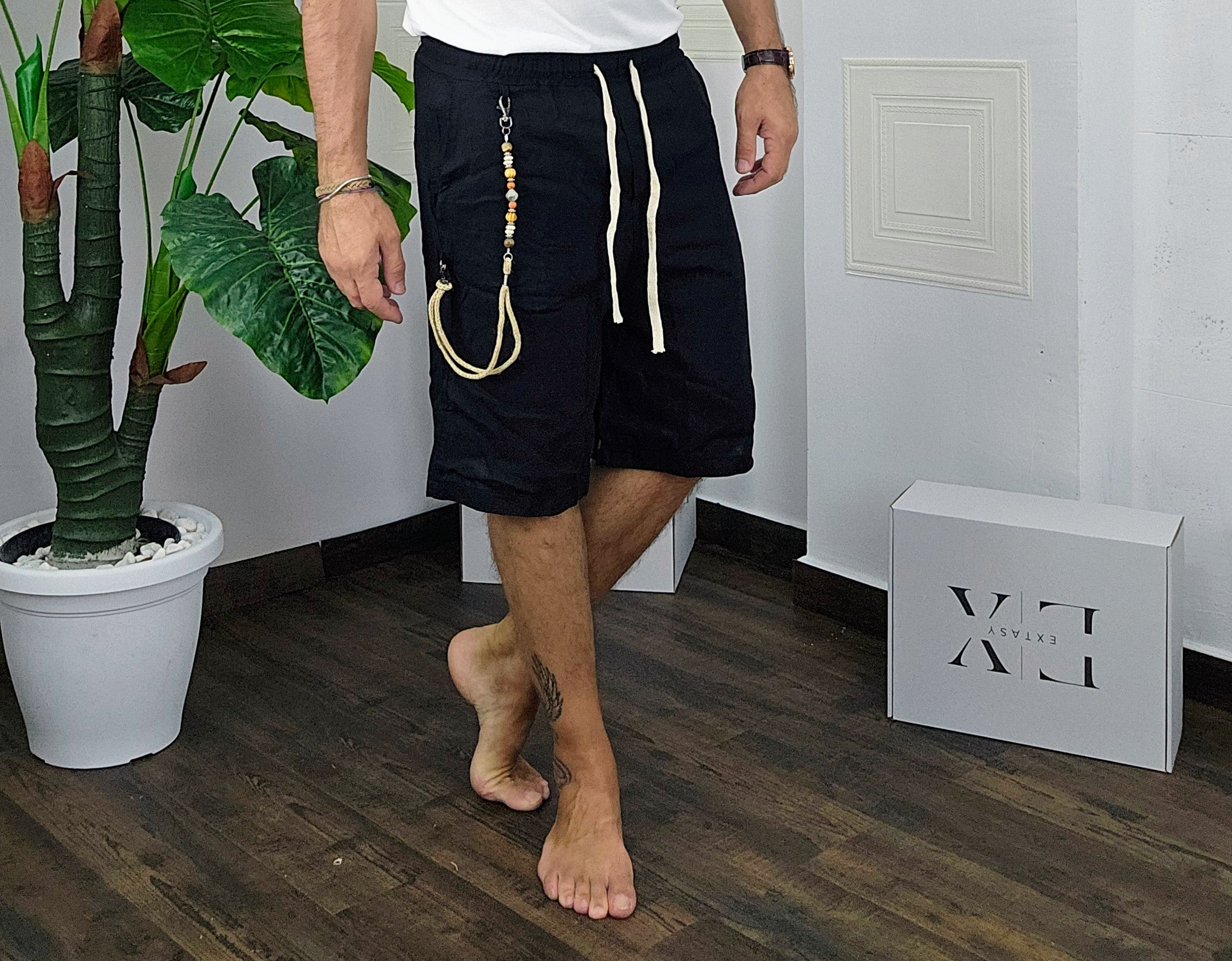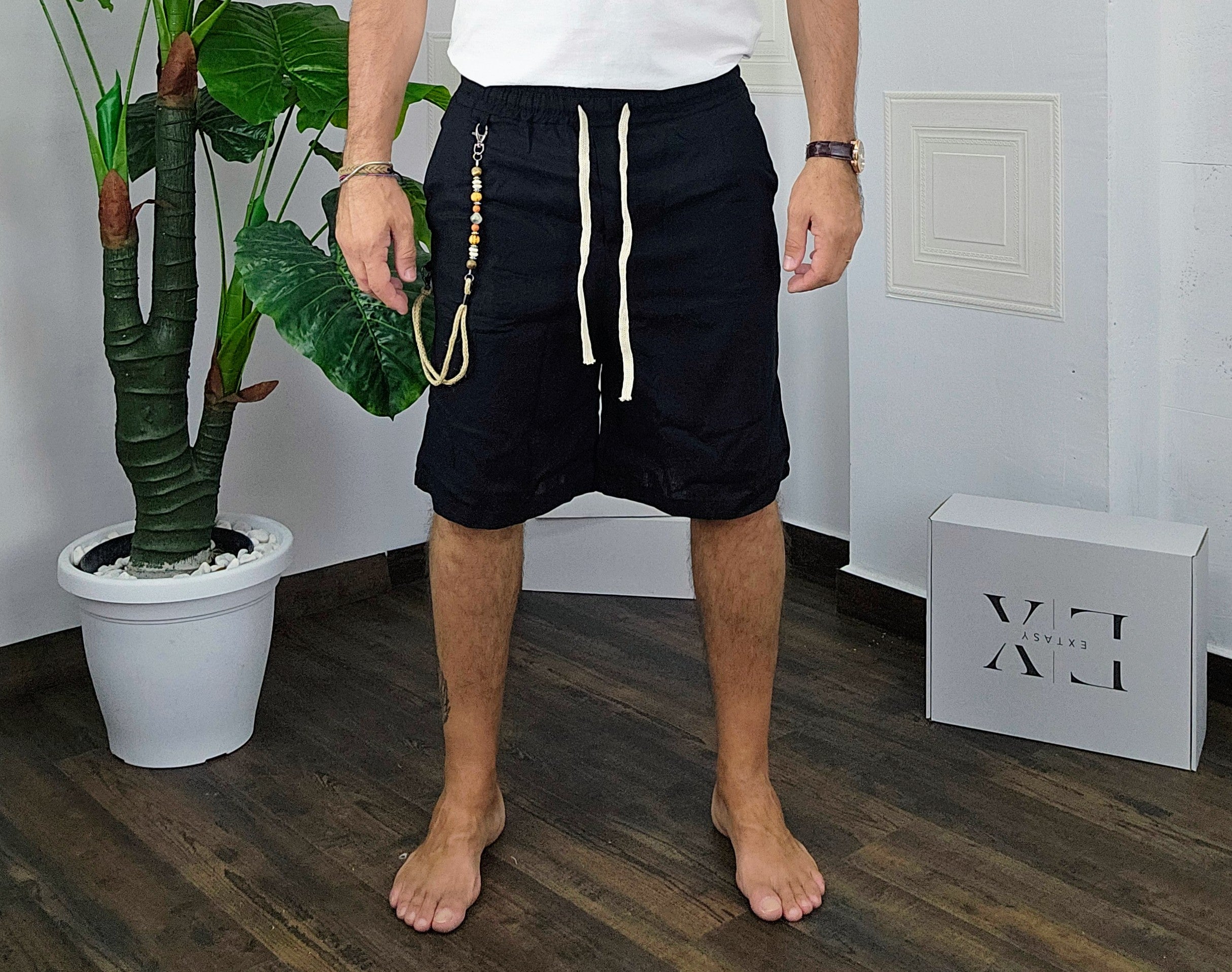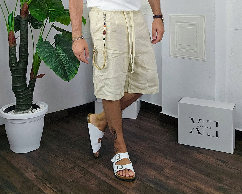 Bermuda in Lino calzata over con laccio regolabile dalla S alla XXL, il modello in foto è alto 1.82x76kg è indossa una taglia S.Prodotto Made in Italy
