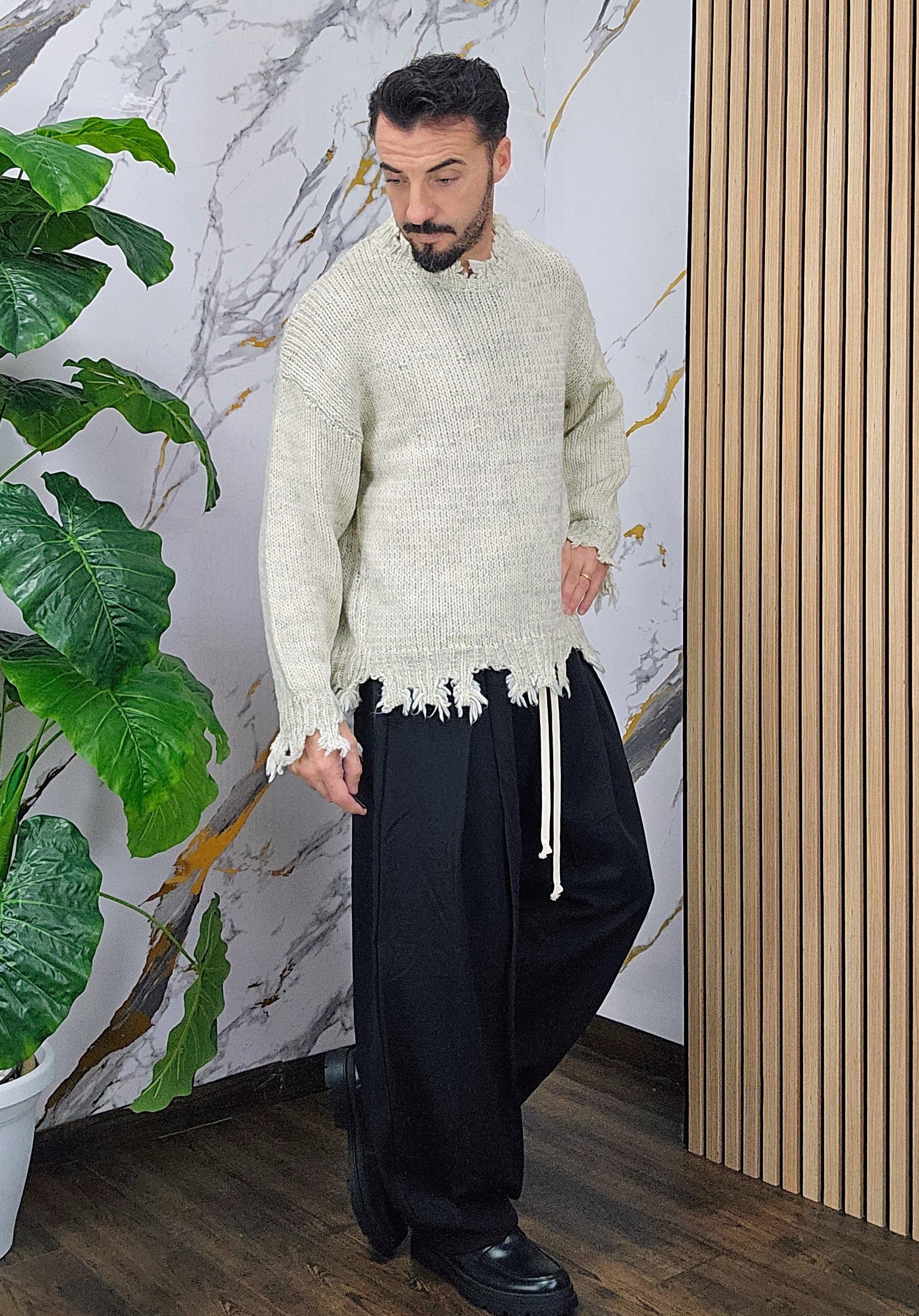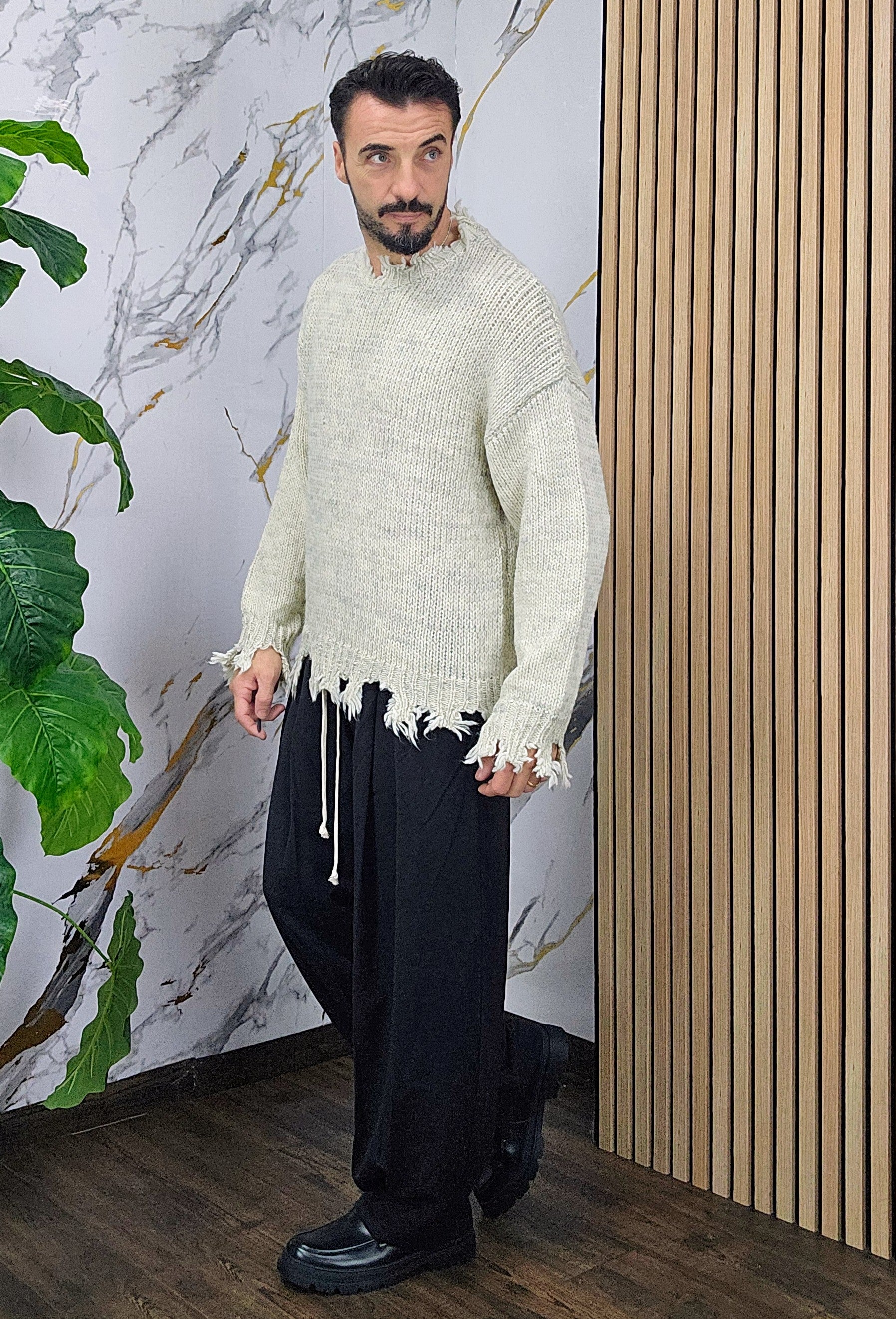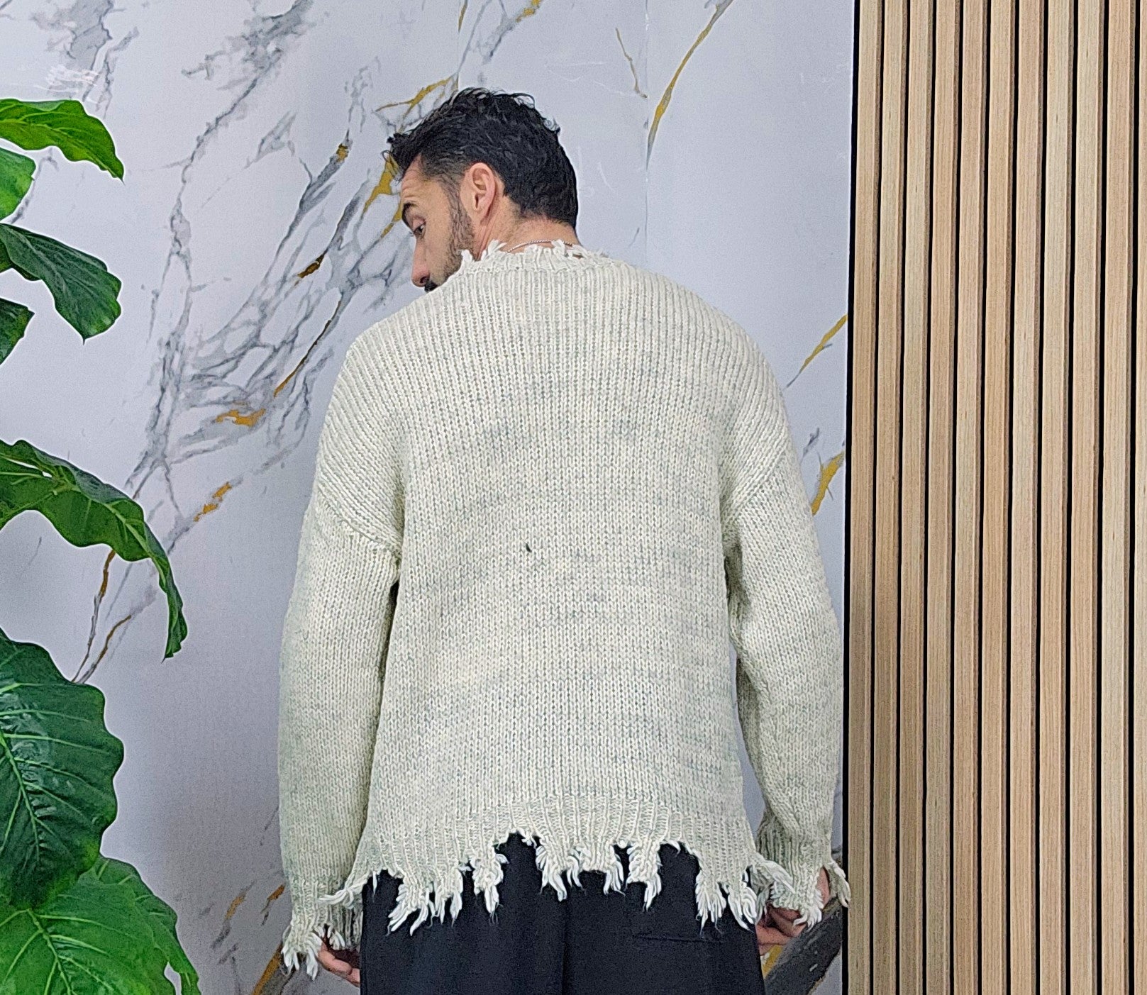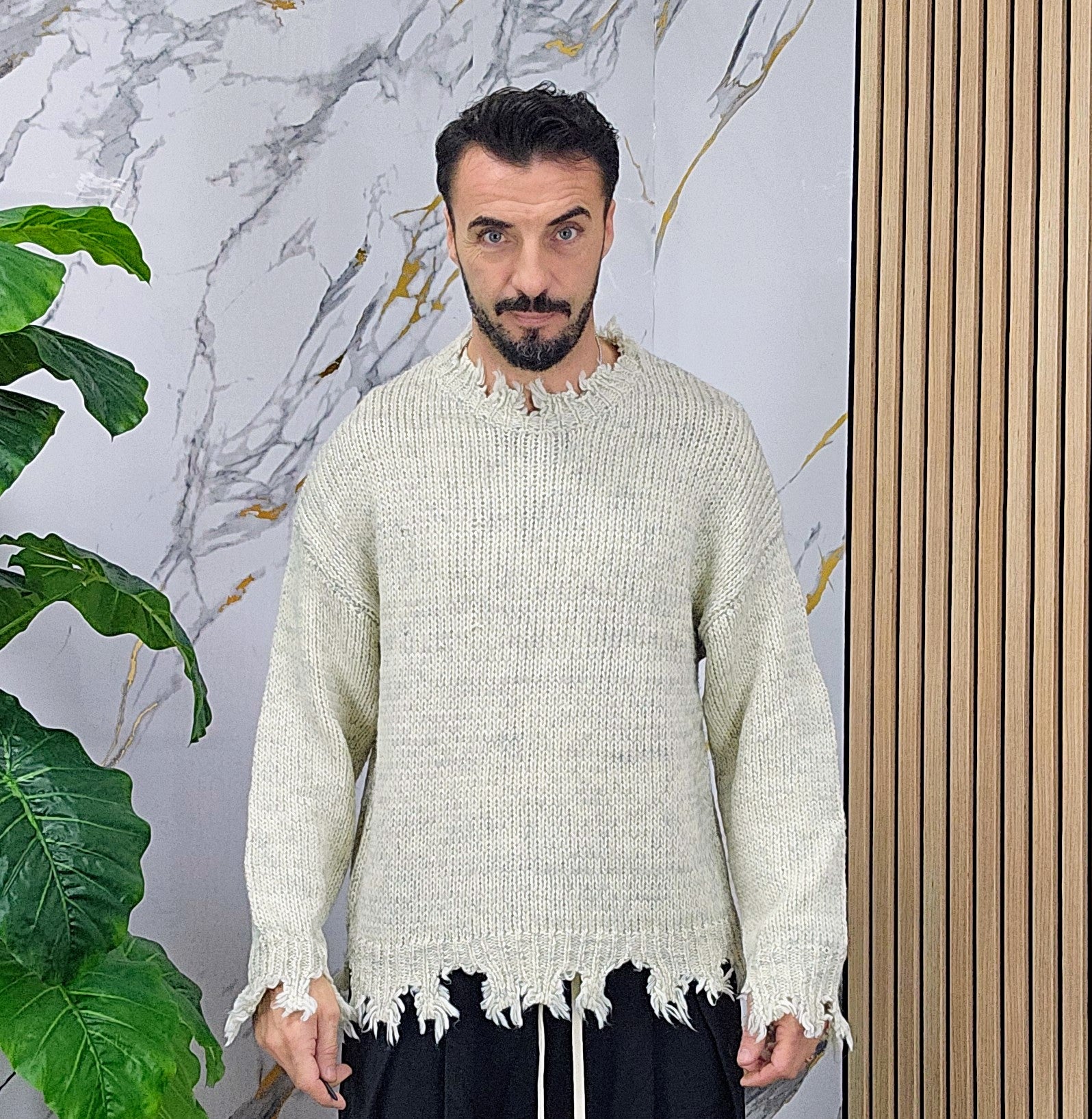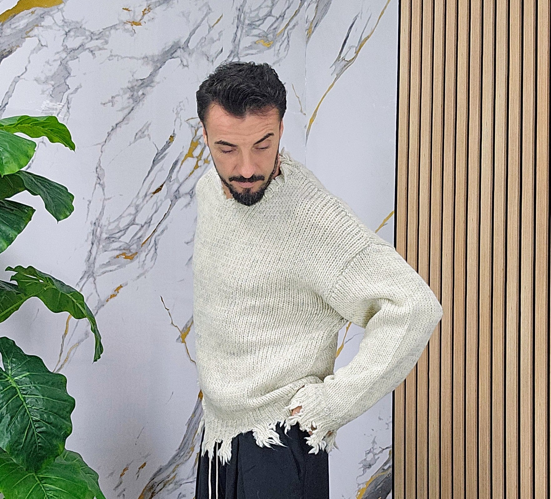 Maglione in lana intrecciato calzata over size con tagli sia sul polsino collo e finitura maglia dalla M alla XL, il modello in foto è alto 1.82x76kg è indossa una taglia M.Prodotto Made in Italy
