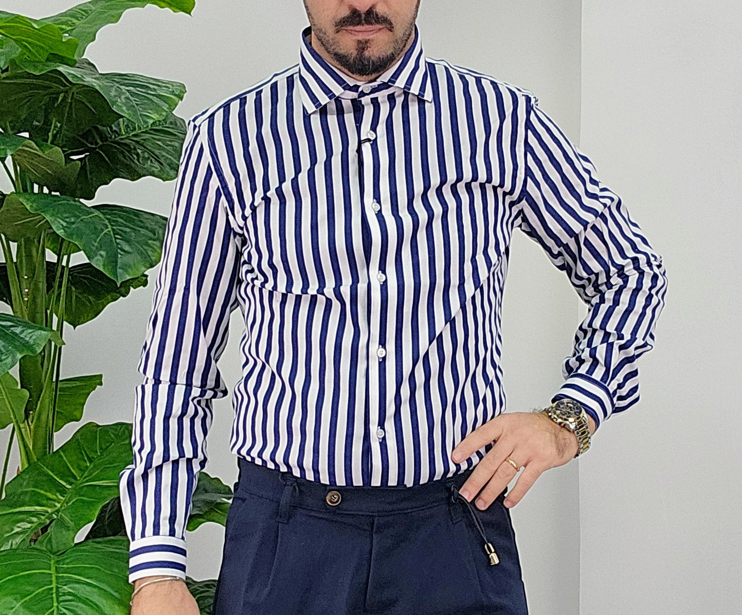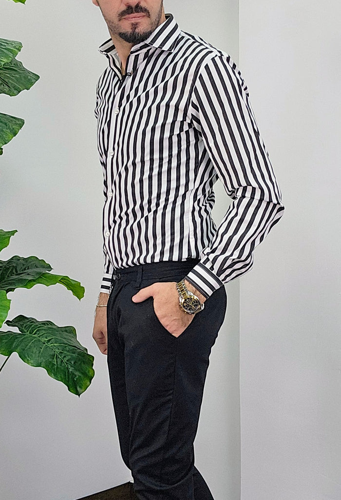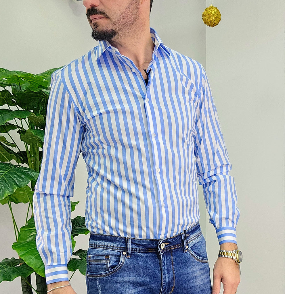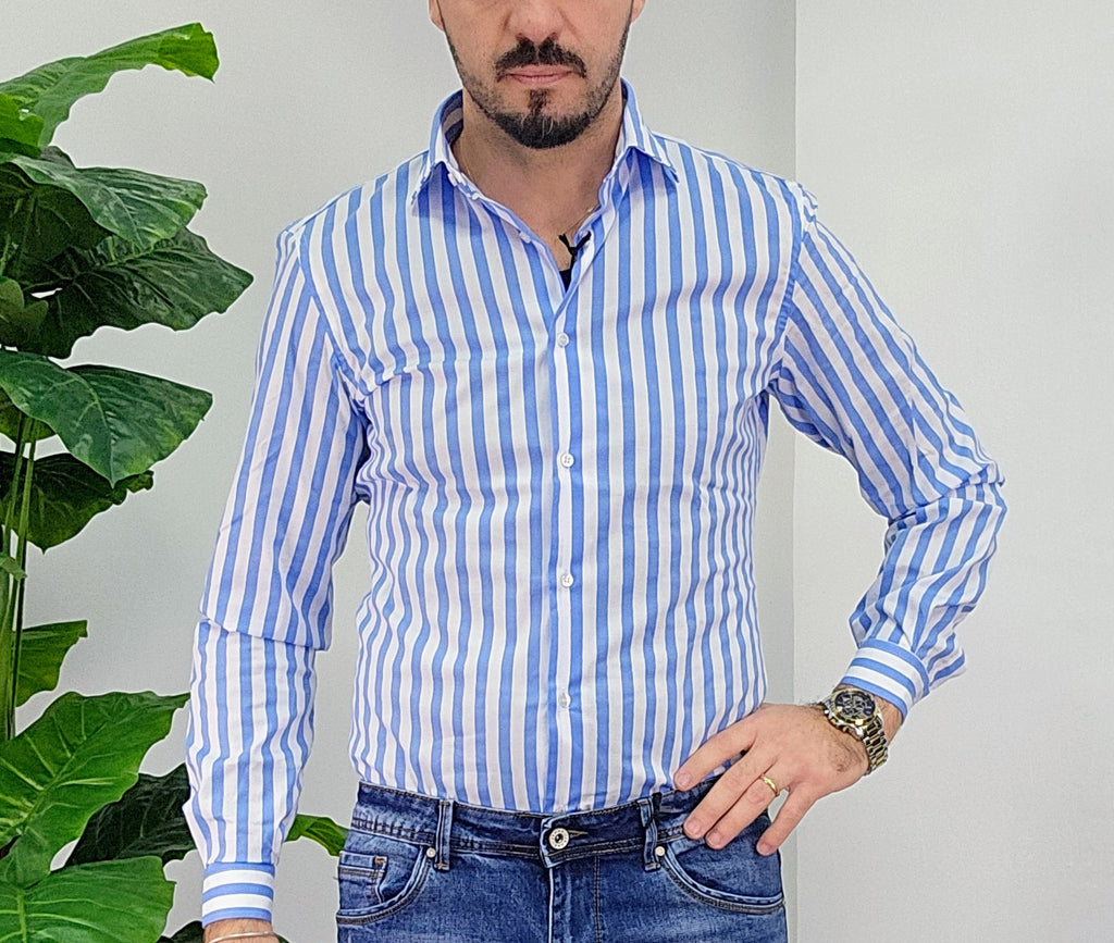 Camicia 100% cotone slim elastica vestibilità regolare dalla S alla XXL, il modello in foto è alto 1.82x76kg è indossa una taglia M,Made in Italy
