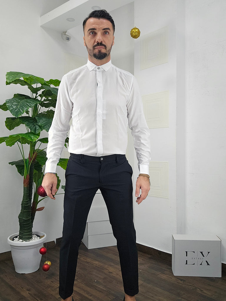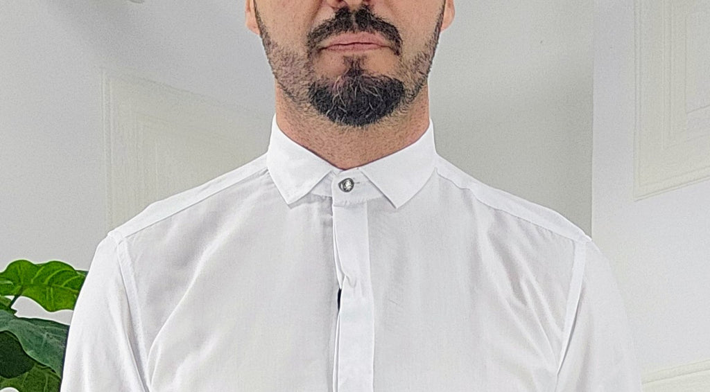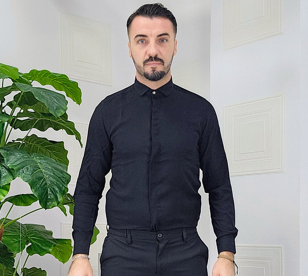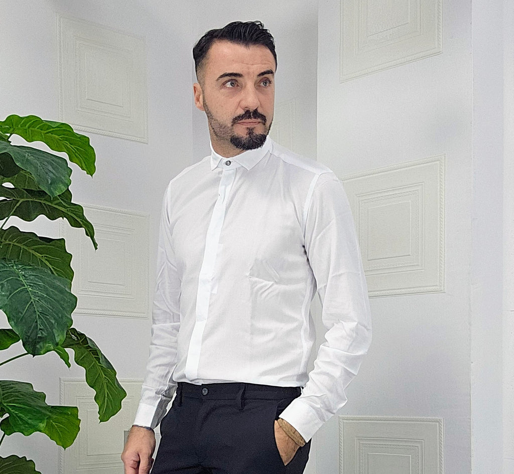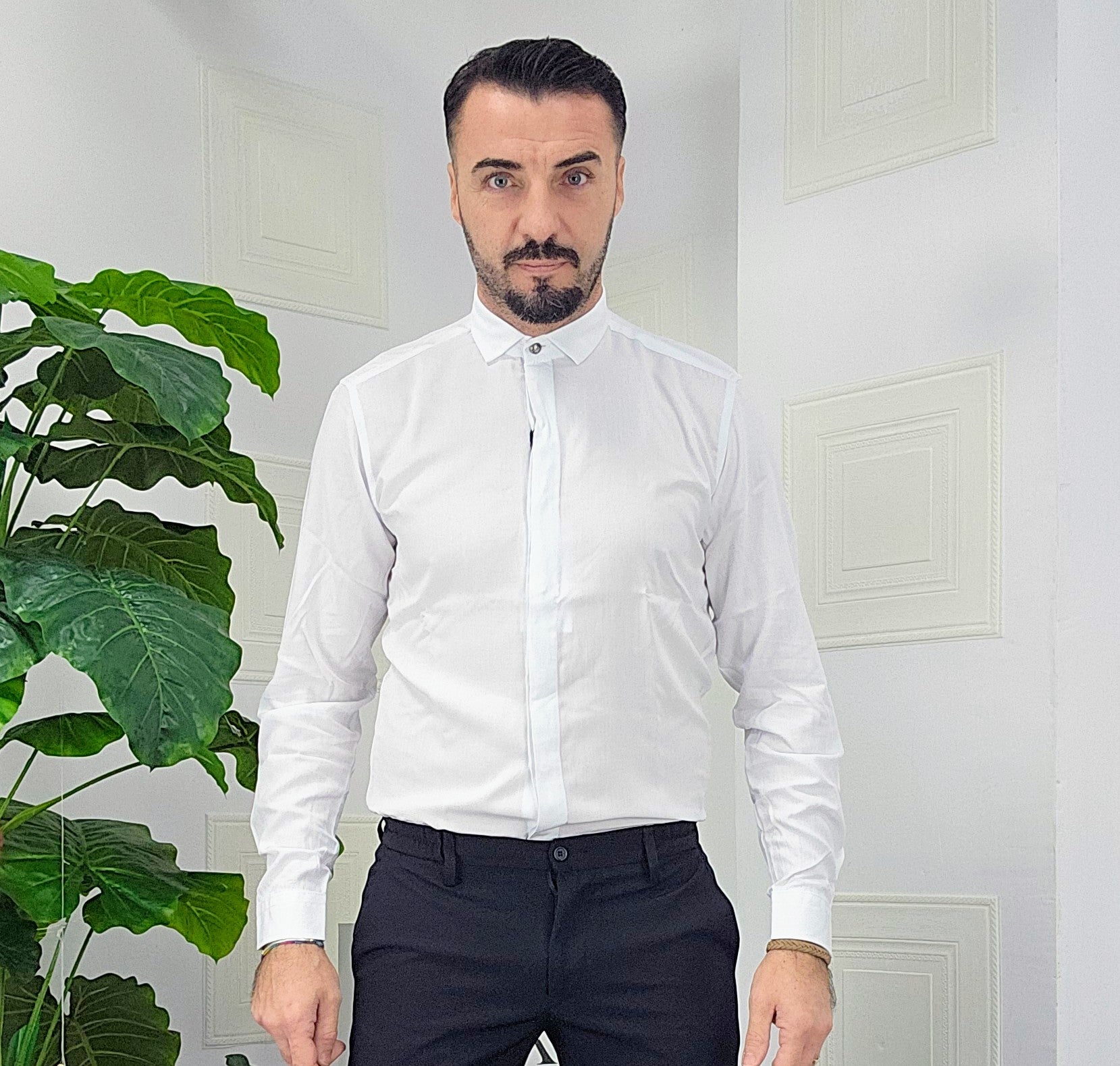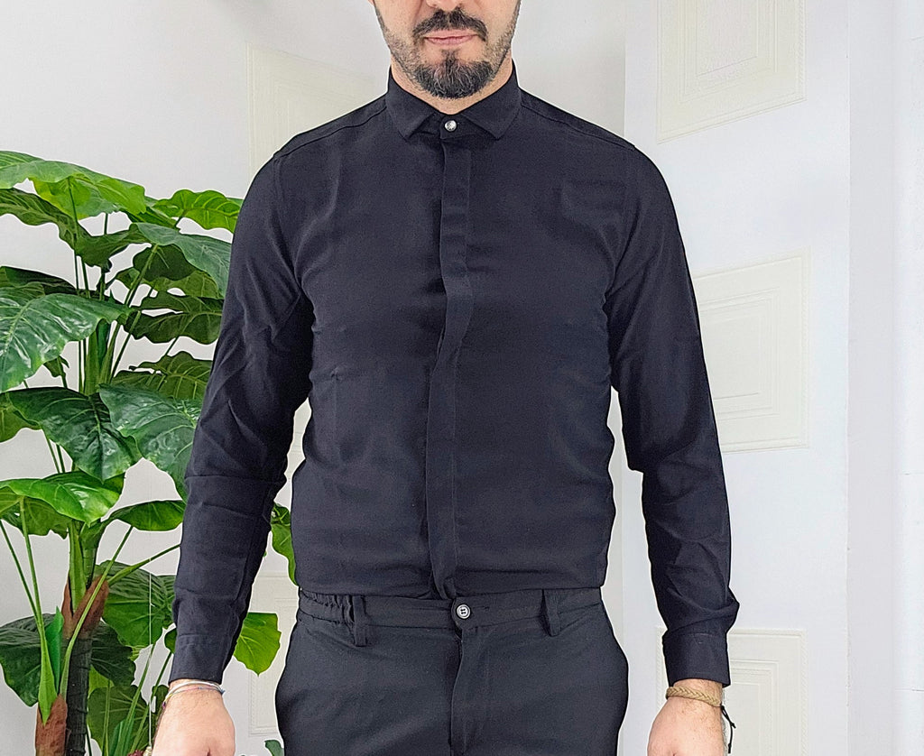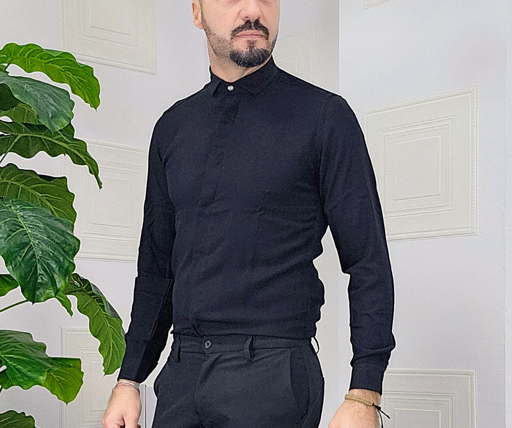 Camicia in viscosa con bottone gioiello bottoni a scomparsa dalla S alla XXL, il modello in foto è alto 1.82x76kg è indossa una taglia S.Prodotto Made in Italy