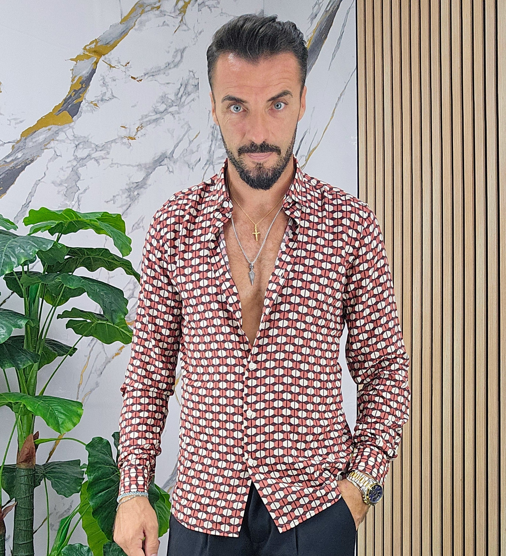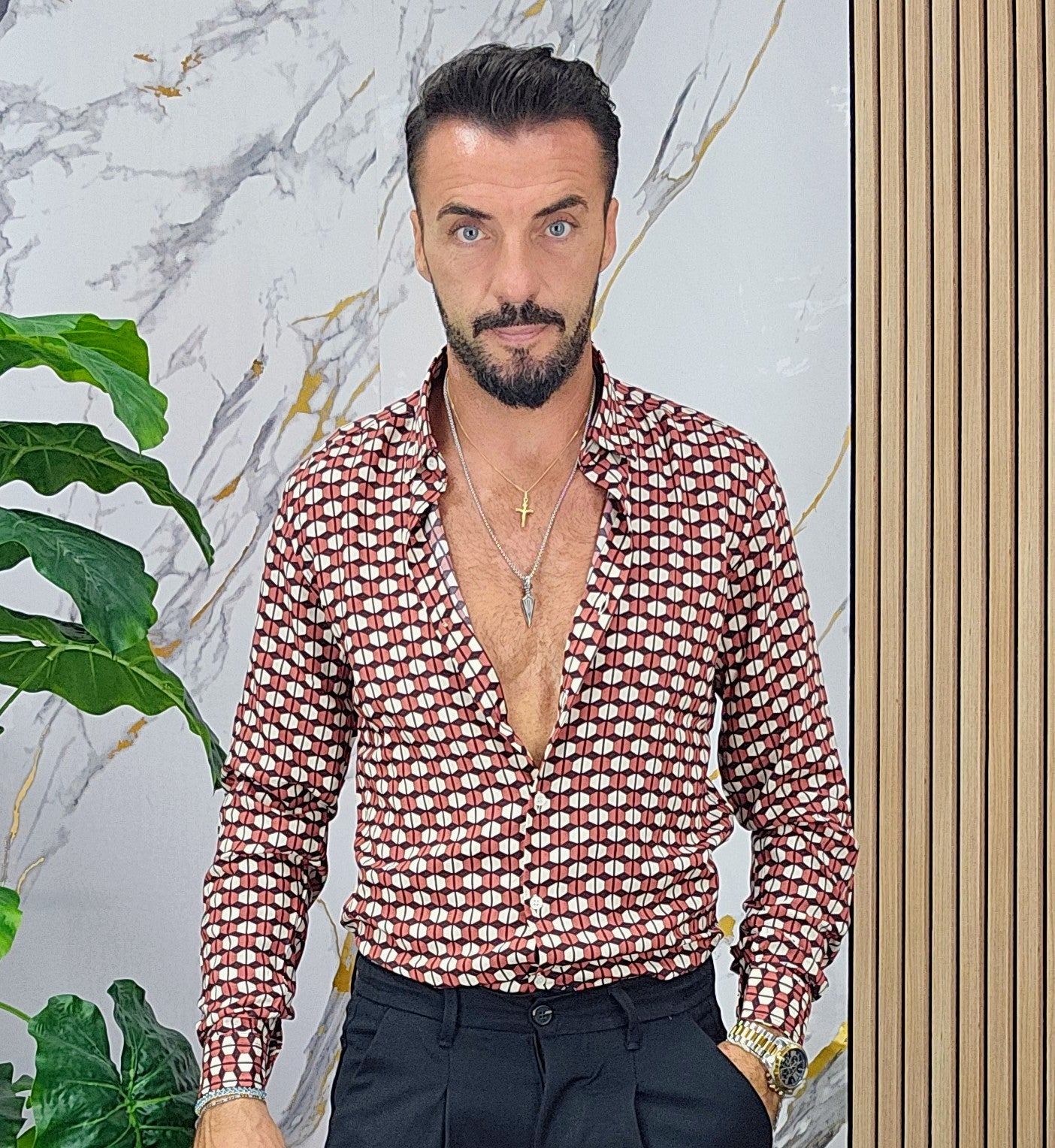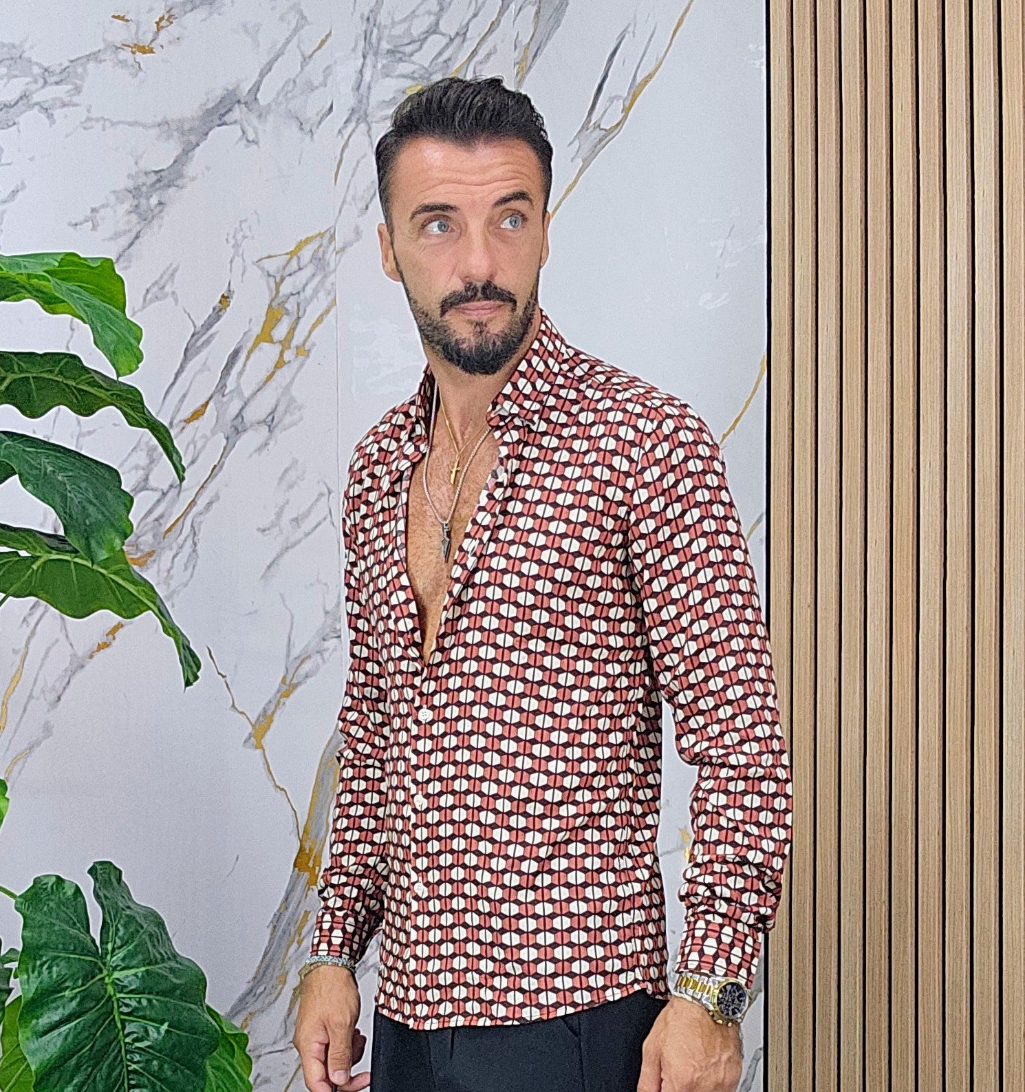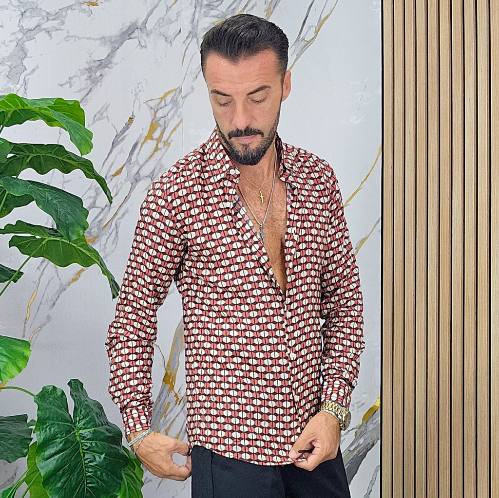Camicia fantasia in viscosa slim fit dalla S alla XXL, il modello in foto è alto 1.82x76kg è indossa una taglia S.Prodotto Made in Italy