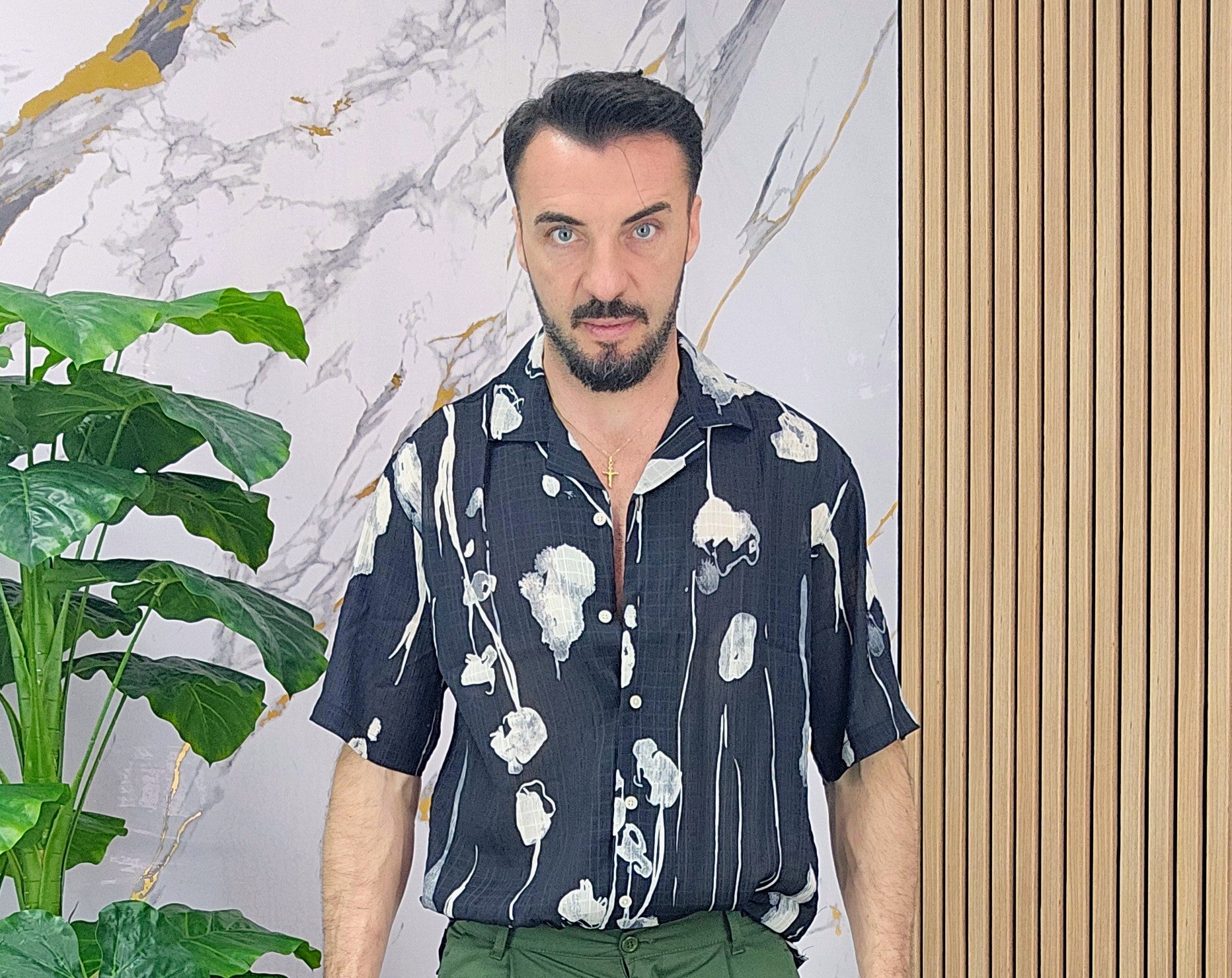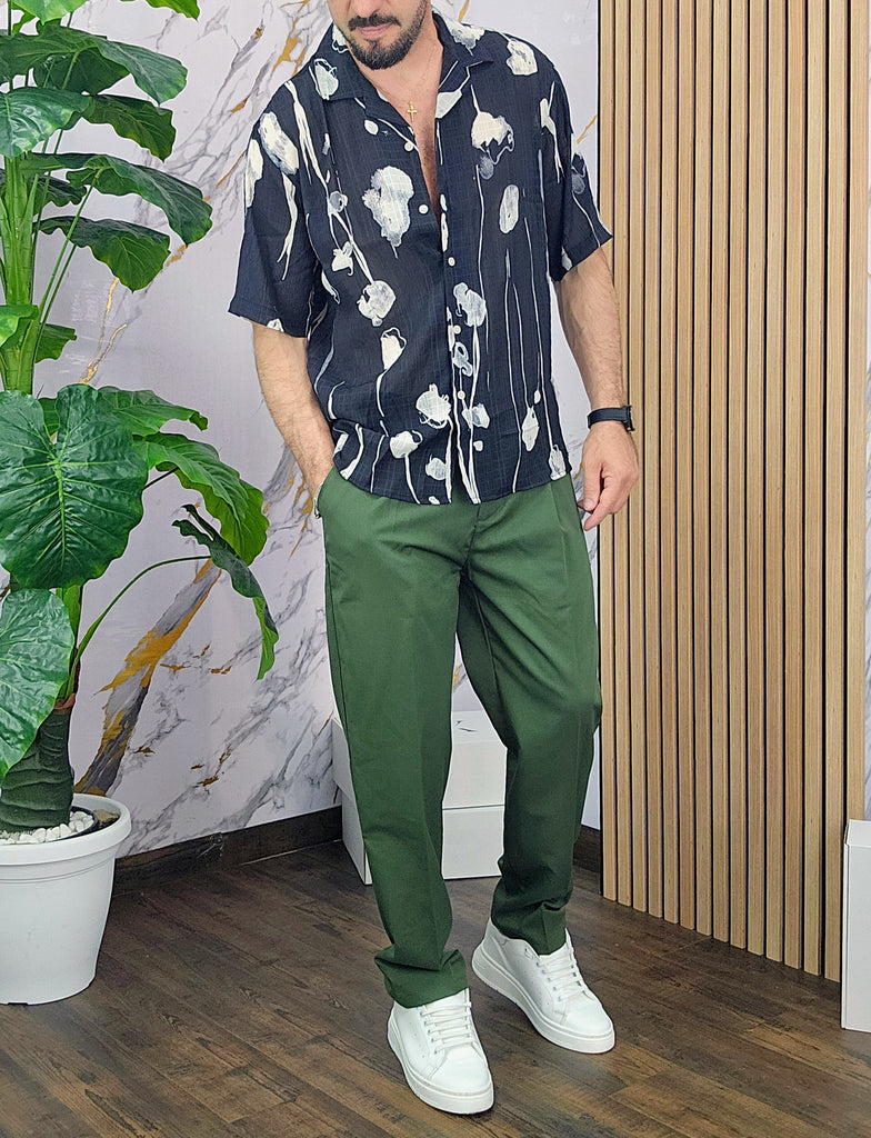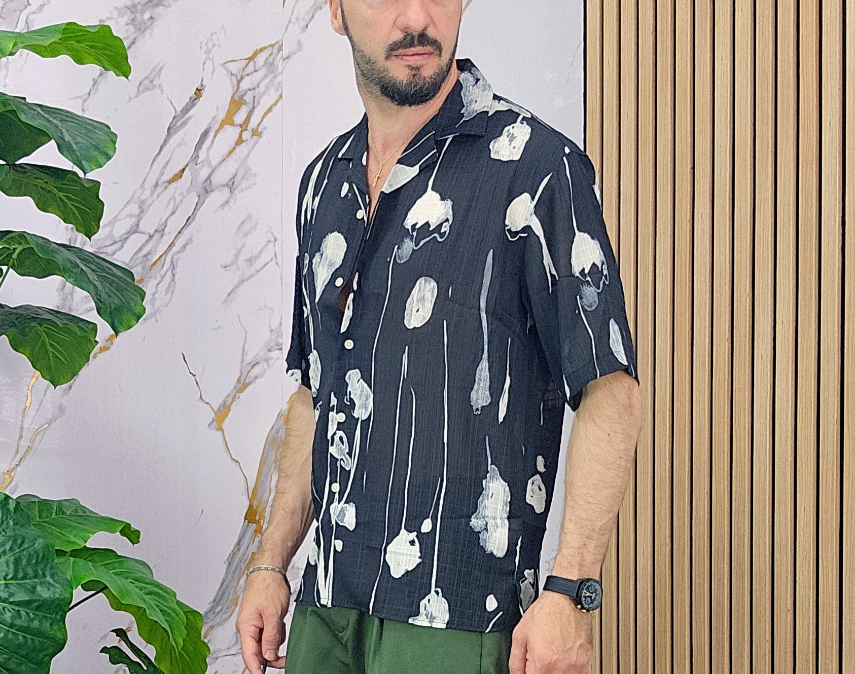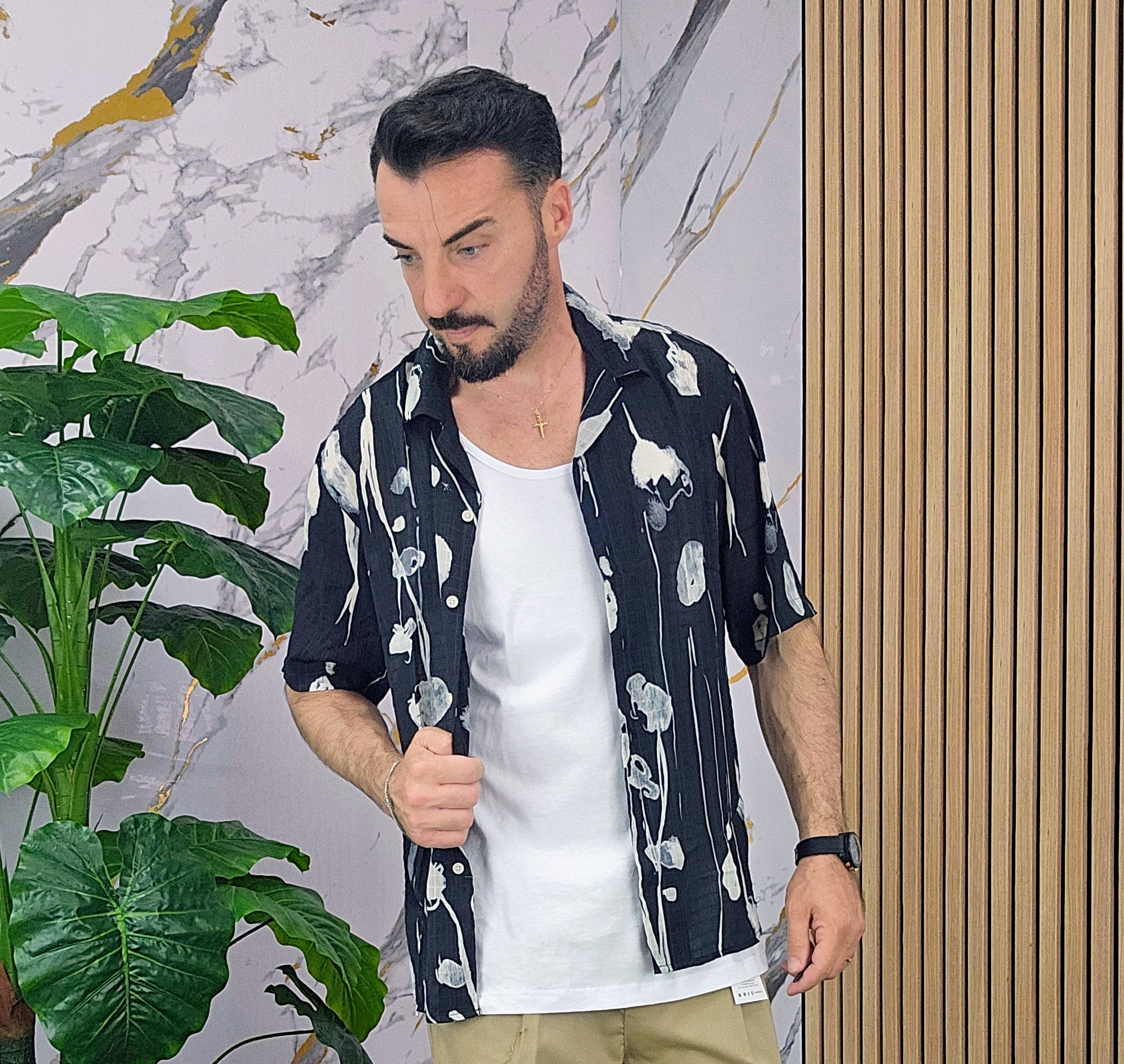Camicia leggerissima con sfondo nero disegni asimmetrico in contrasto con bianco vestibilità comoda dalla S alla XXL, il modello in foto è alto 1.82x76kg è indossa una taglia M.Prodotto Made in Italy