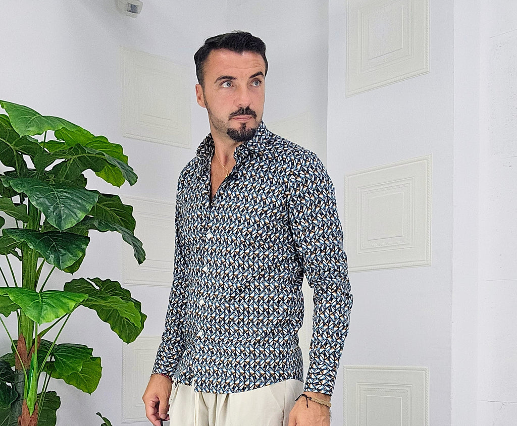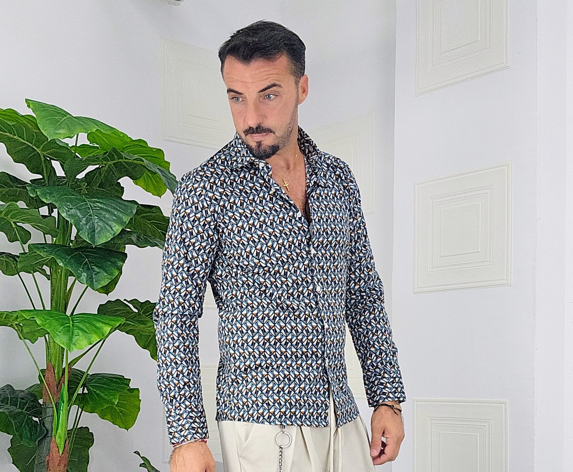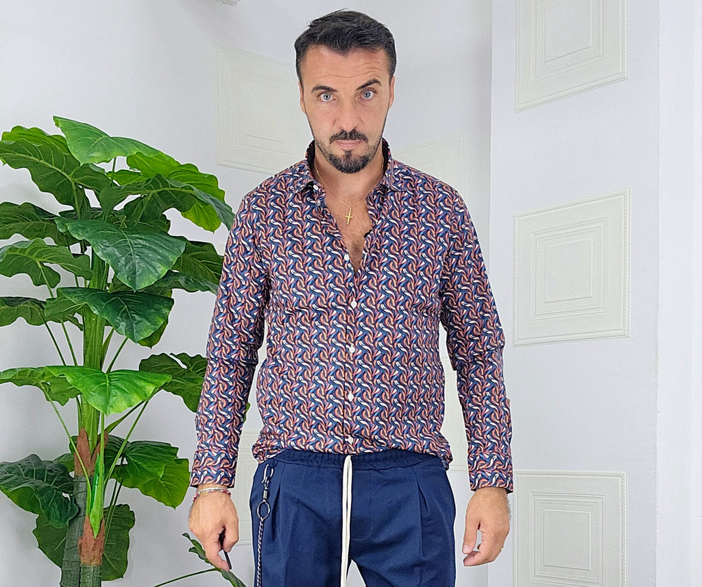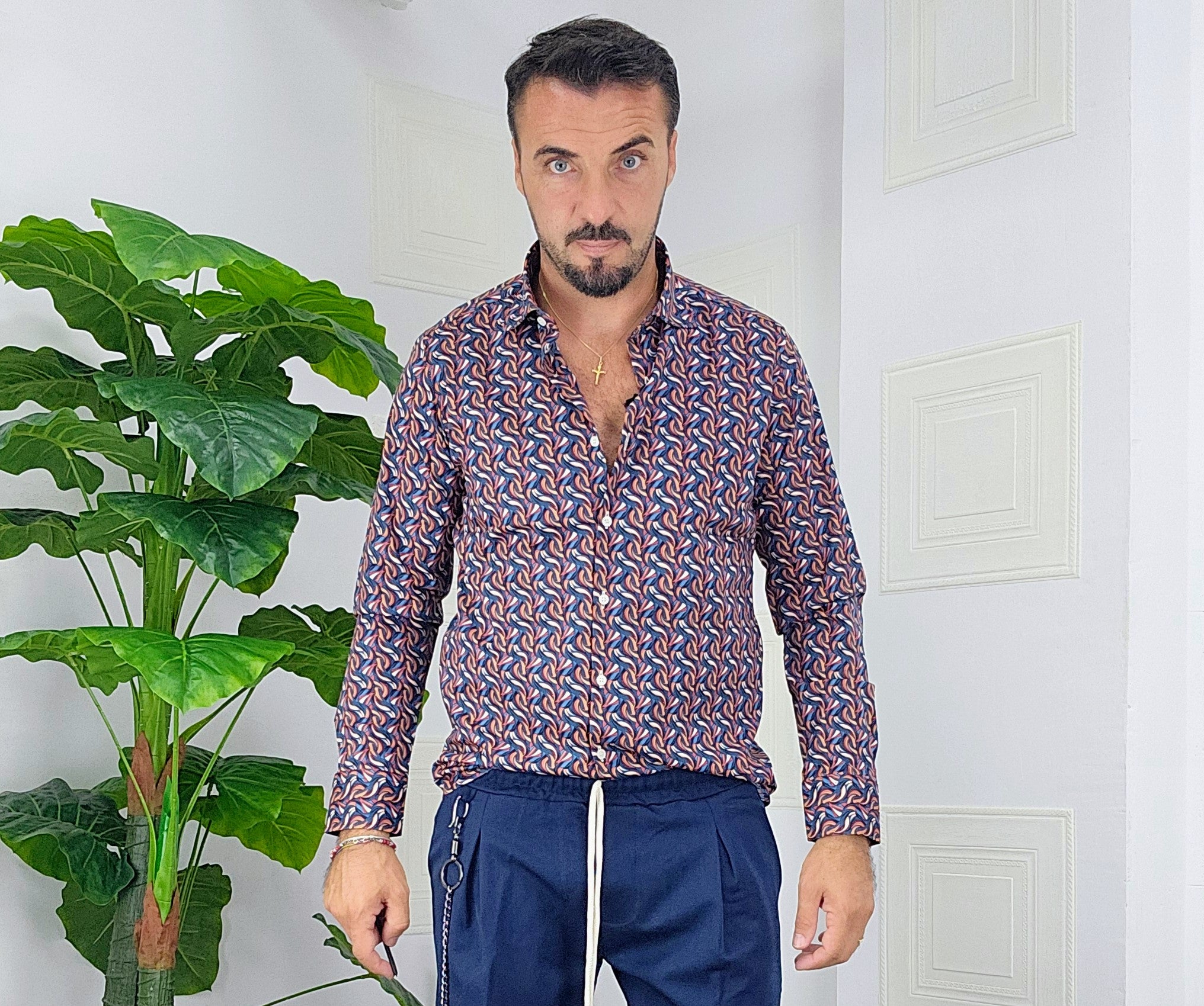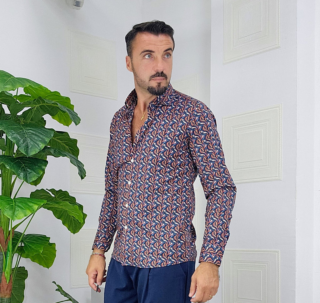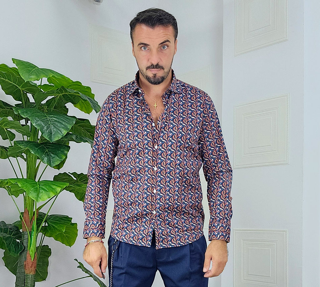 Camicia fantasia vestibilità regolare dalla S alla XXL, il modello in foto è alto 1.82x76kg è indossa una taglia S.Prodotto Made in Italy