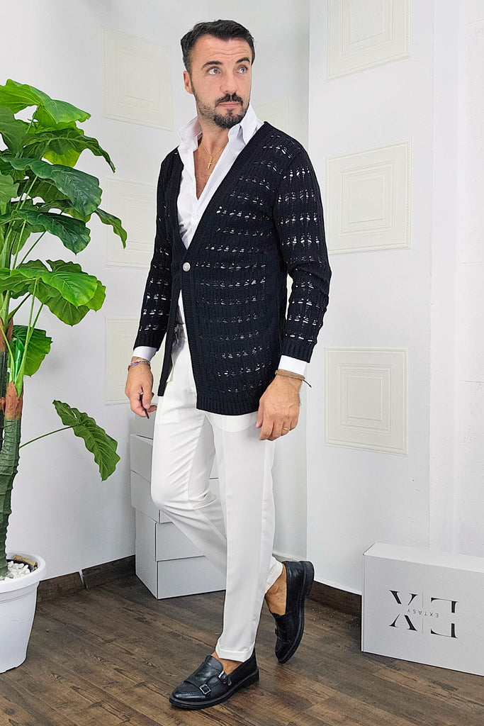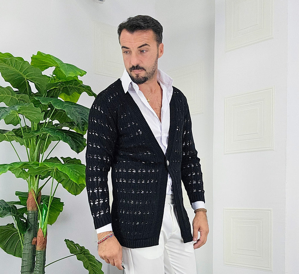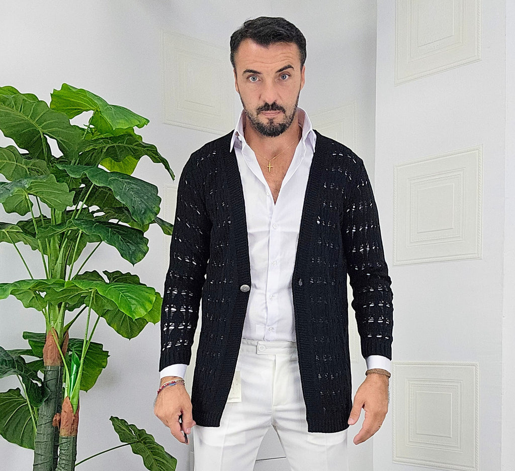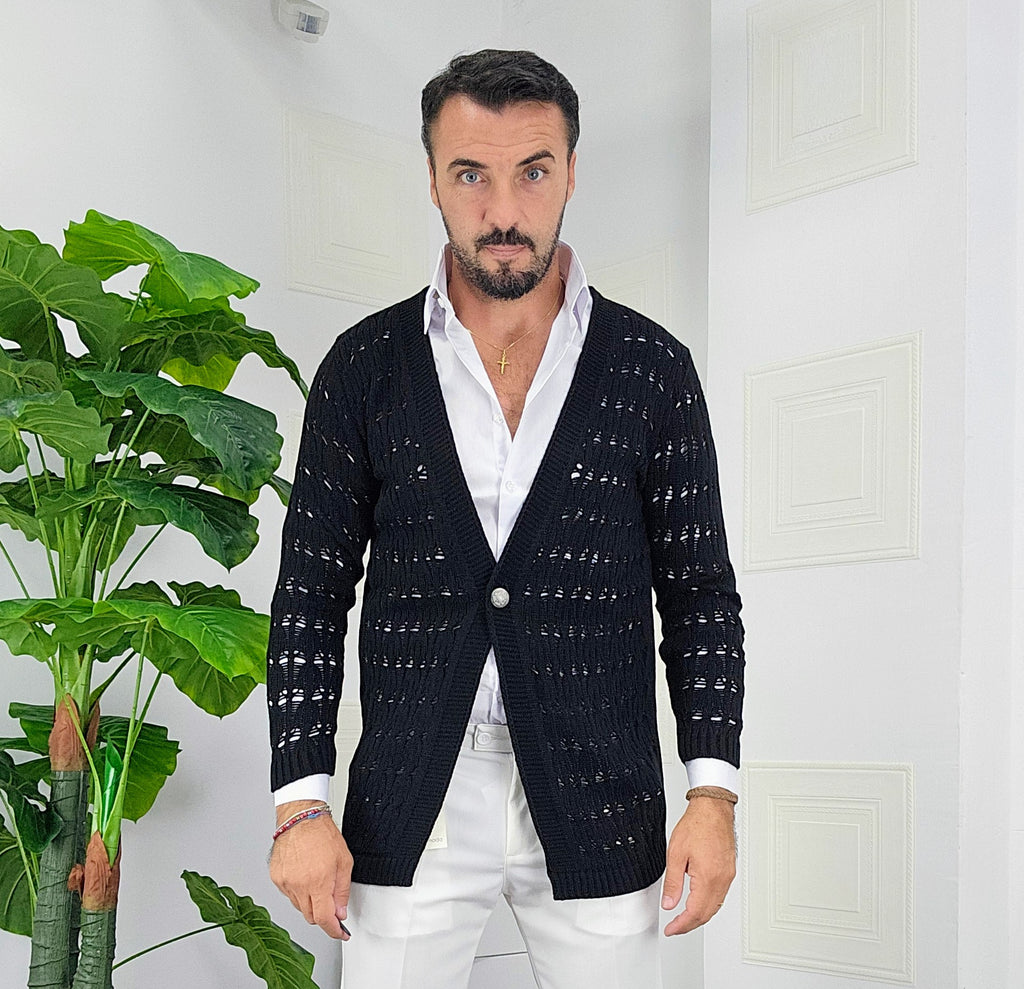 Cardigan chiusura un bottone in contrasto con argento traforato dalla S alla XXL, il modello in foto è alto 1.82x76kg è indossa una taglia S.Prodotto Made in Italy