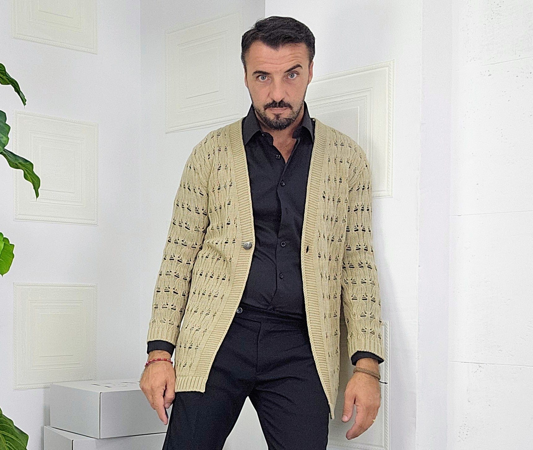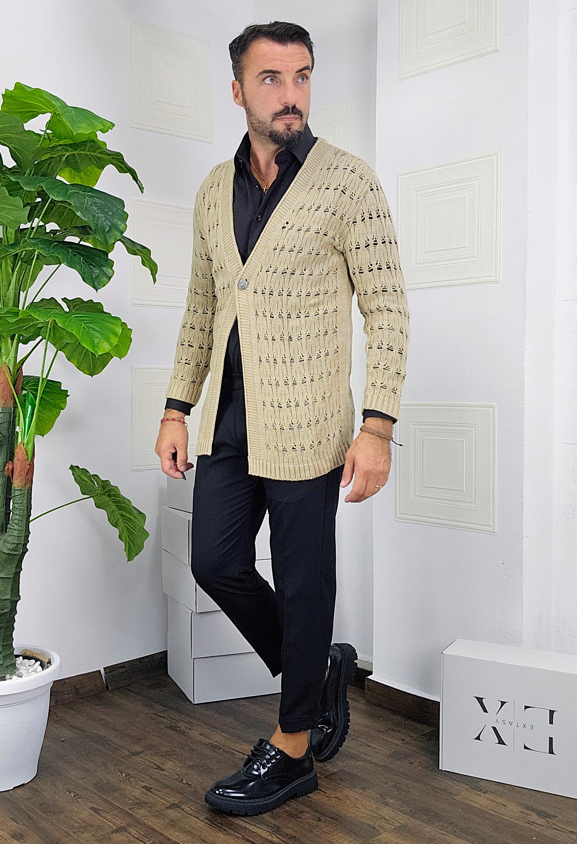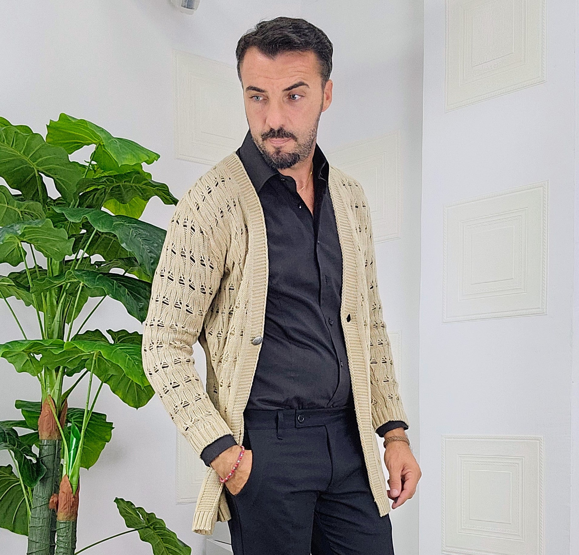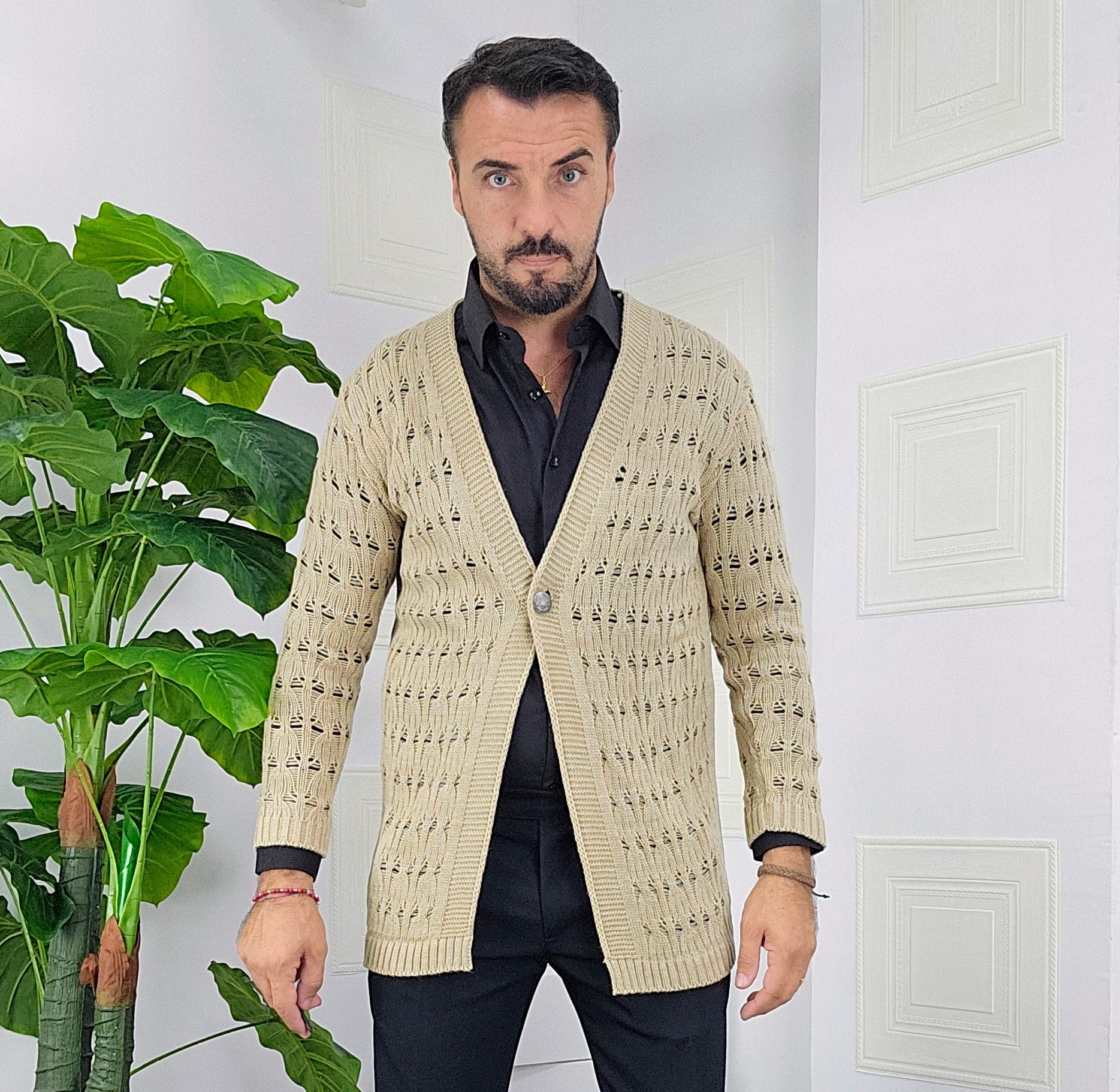 Cardigan chiusura un bottone in contrasto con argento traforato dalla S alla XXL, il modello in foto è alto 1.82x76kg è indossa una taglia S.Prodotto Made in Italy