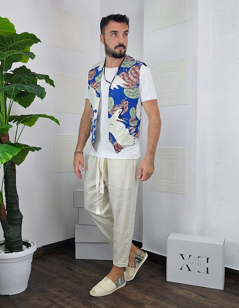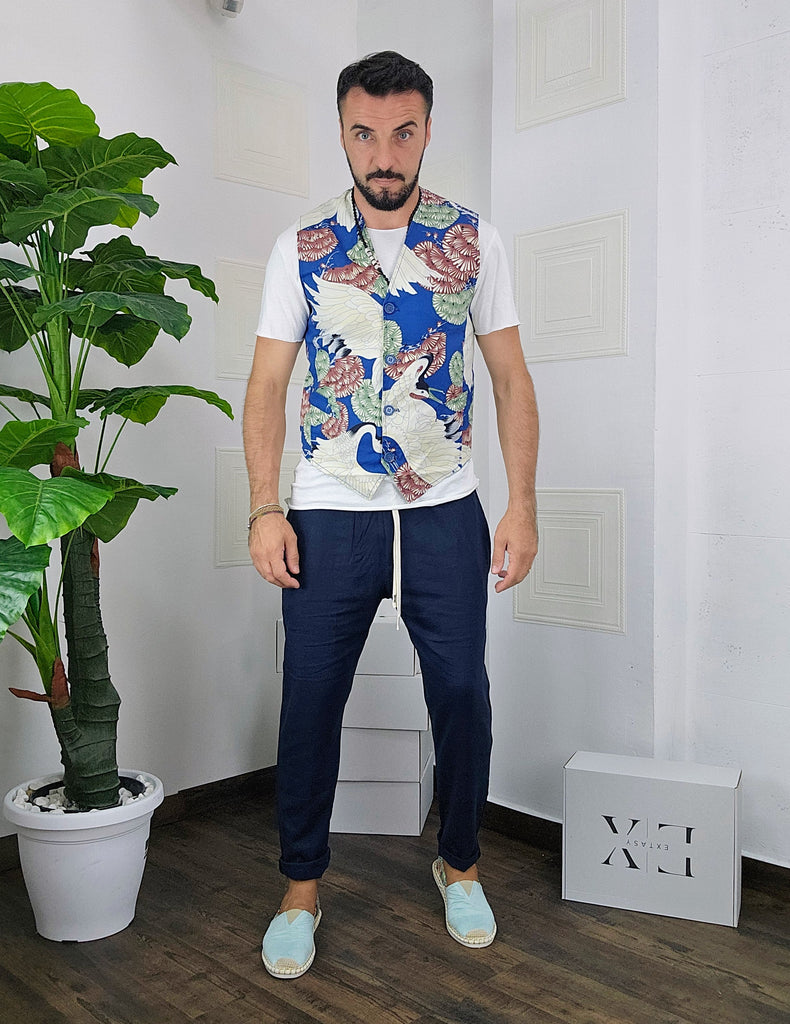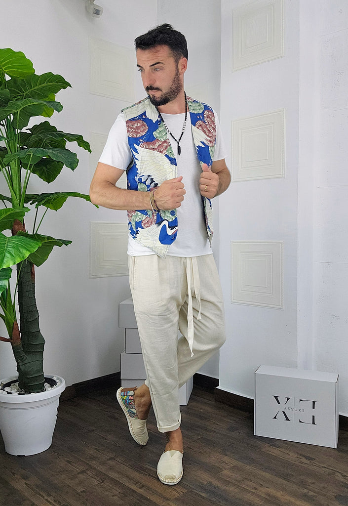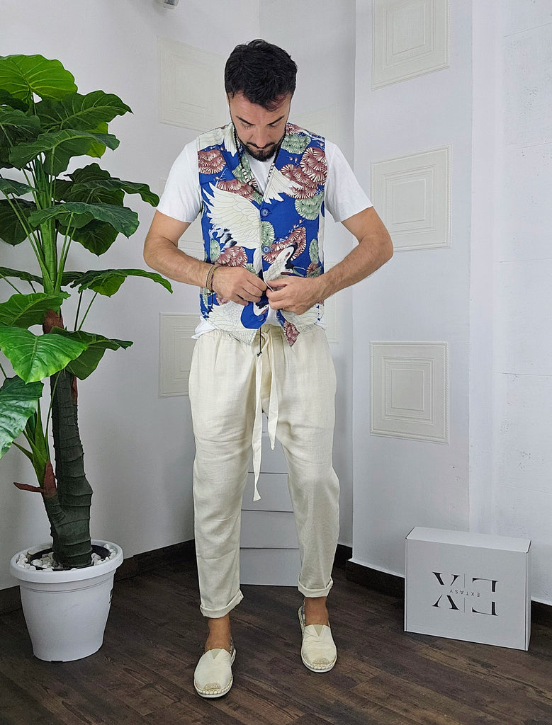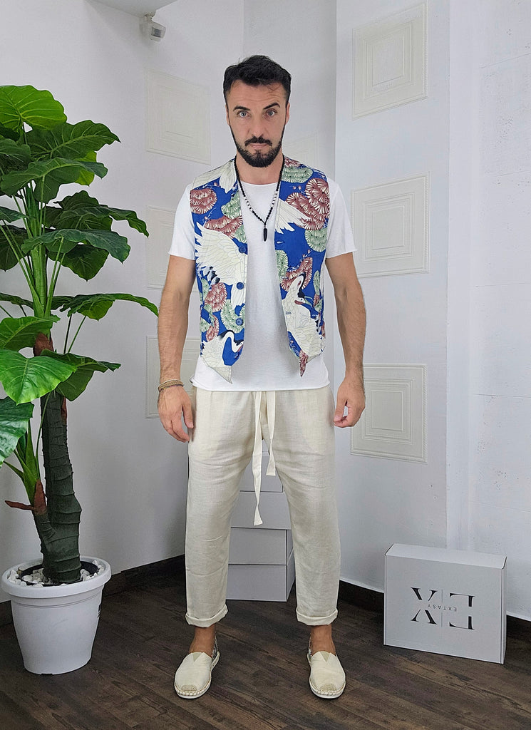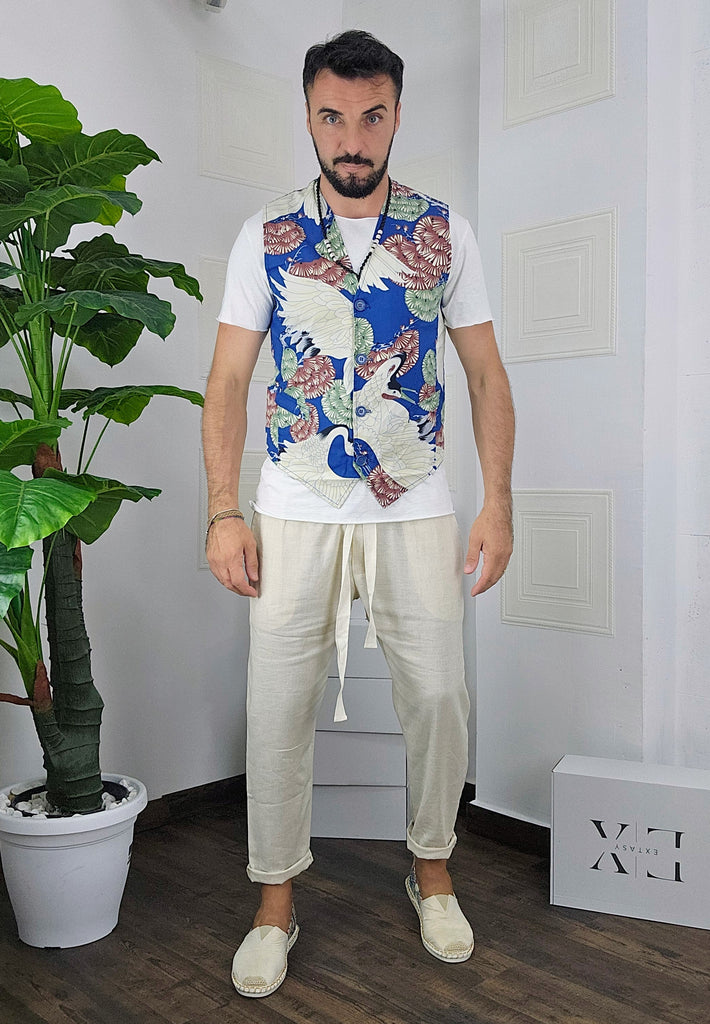 Completo composto da Gilet a fantasia + pantatuta in Lino dalla S alla XL, il modello in foto è alto 1.82x76kg è indossa una taglia M.Prodotto Made in Italy