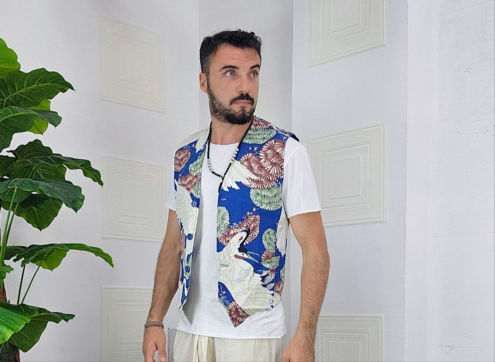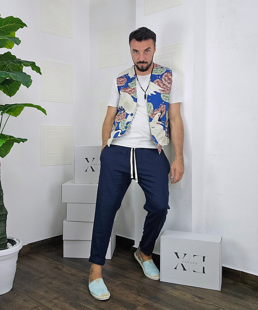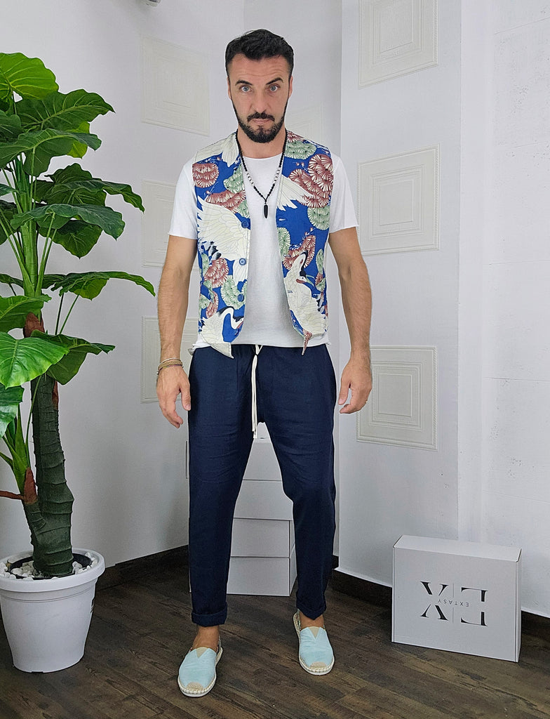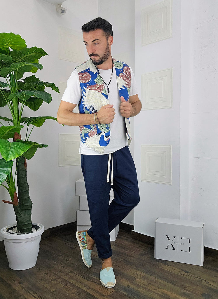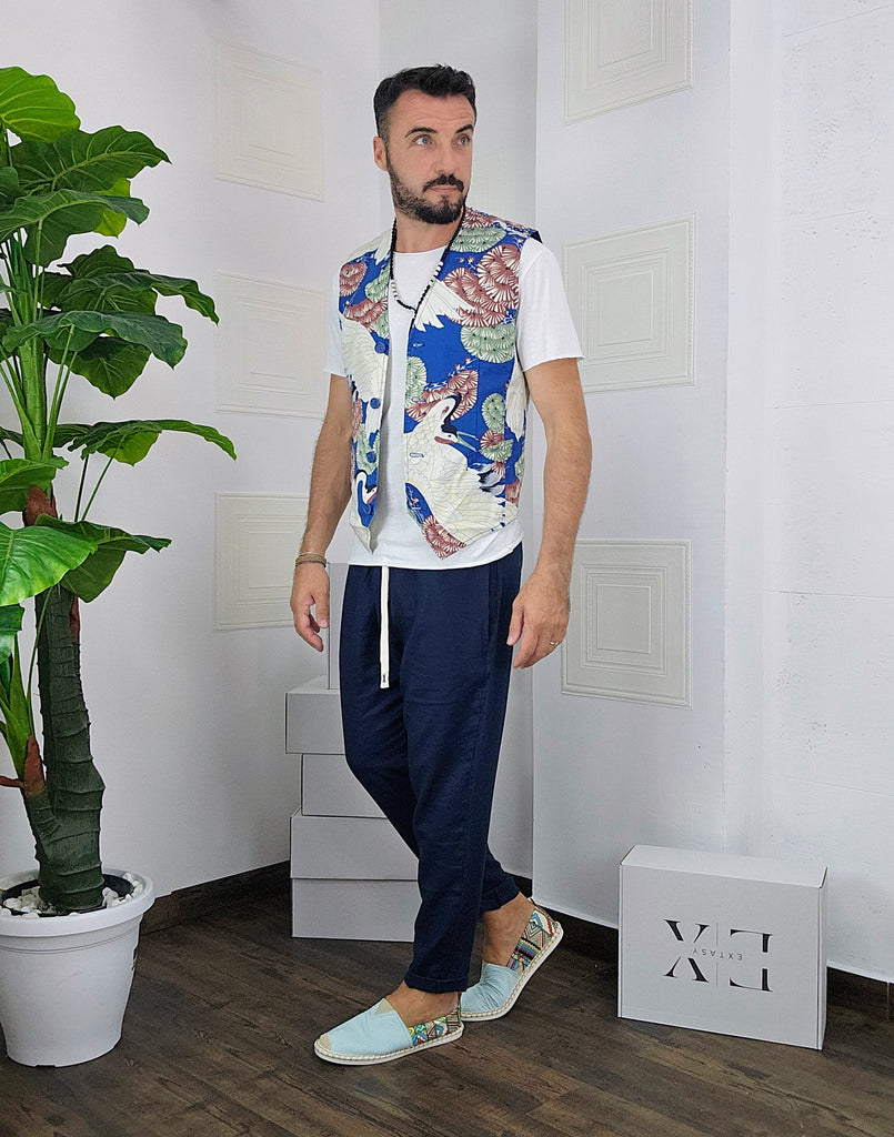 Completo composto da Gilet a fantasia + pantatuta in Lino dalla S alla XL, il modello in foto è alto 1.82x76kg è indossa una taglia M.Prodotto Made in Italy