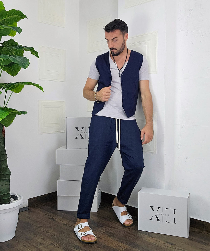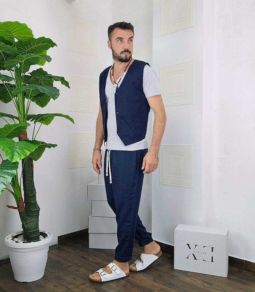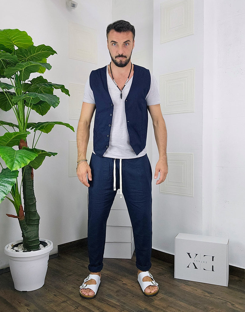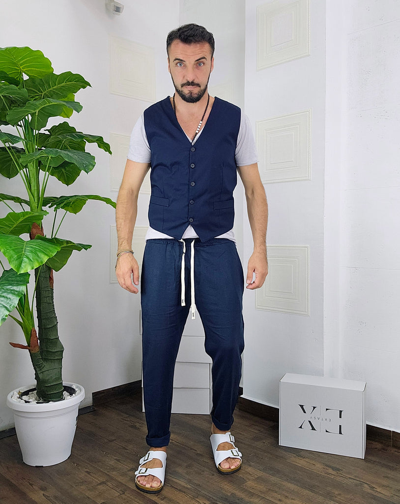 Coordinato composto da pantatuta e Gilet regolabile chiusura a 5 bottoni dalla S alla XL, il modello in foto è alto 1.82x76kg è indossa una taglia M.Prodotto Made in Italy