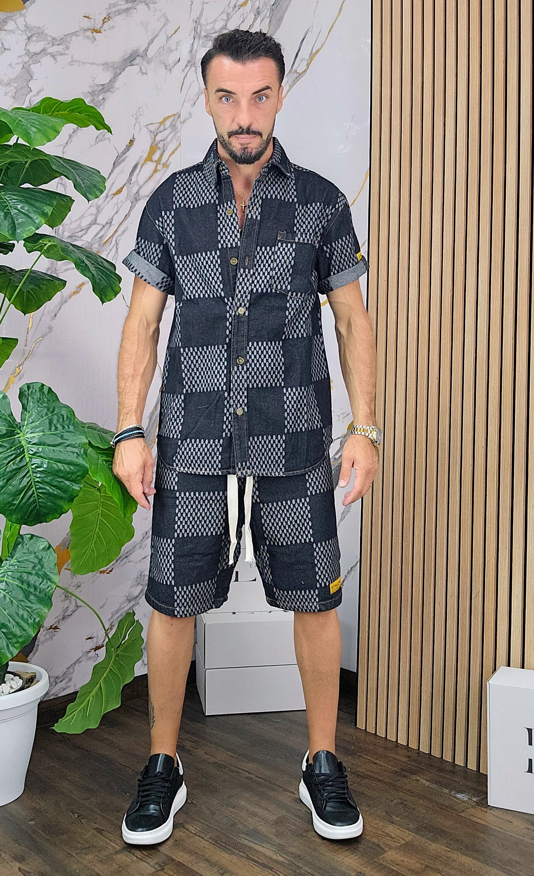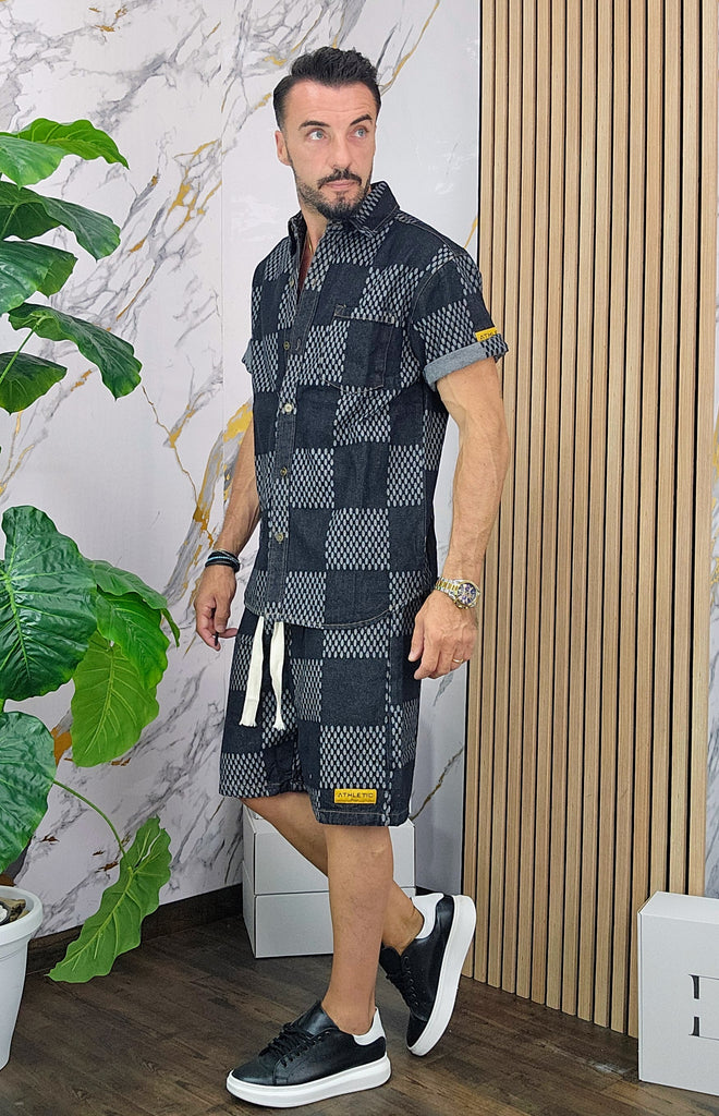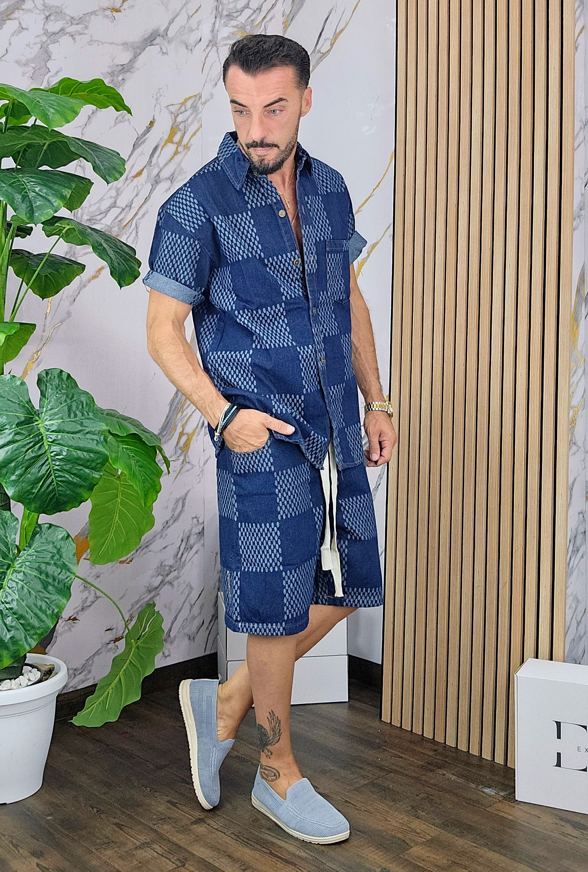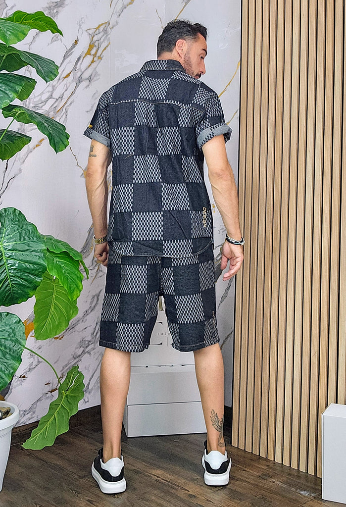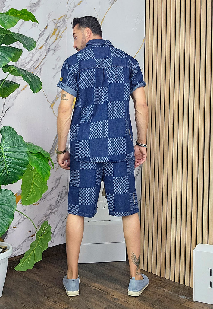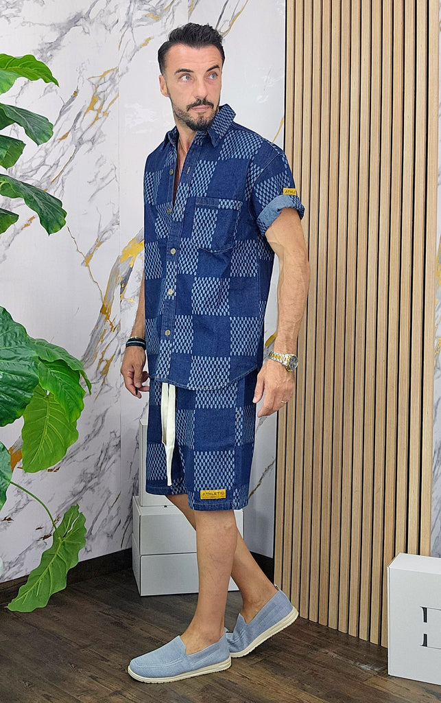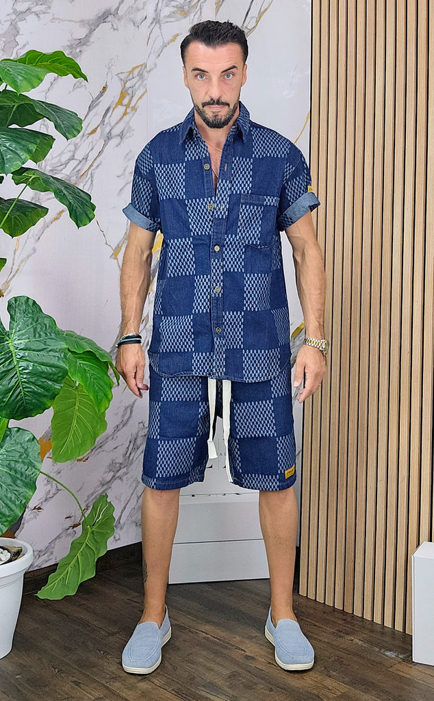 Completo in Jeans leggero vestibilità comoda composto da camicione chiusura bottoni centrale bermuda con elastico in vita laccio regolabile 2 tasche sul d'avanti laccio regolabile dalla M alla XXL, il modello in foto è alto 1.82x76kg è indossa una taglia M.Prodotto Made in Italy