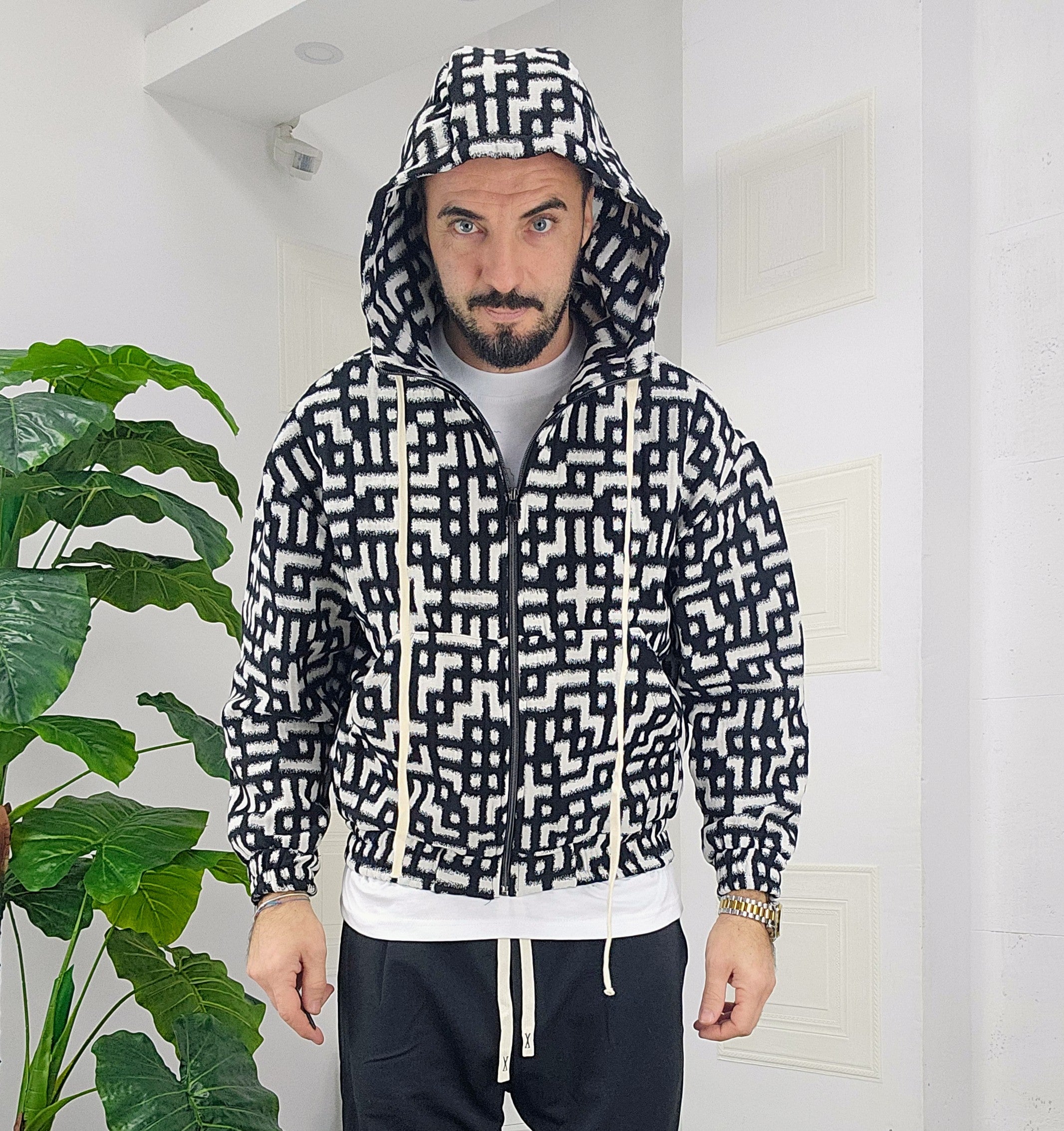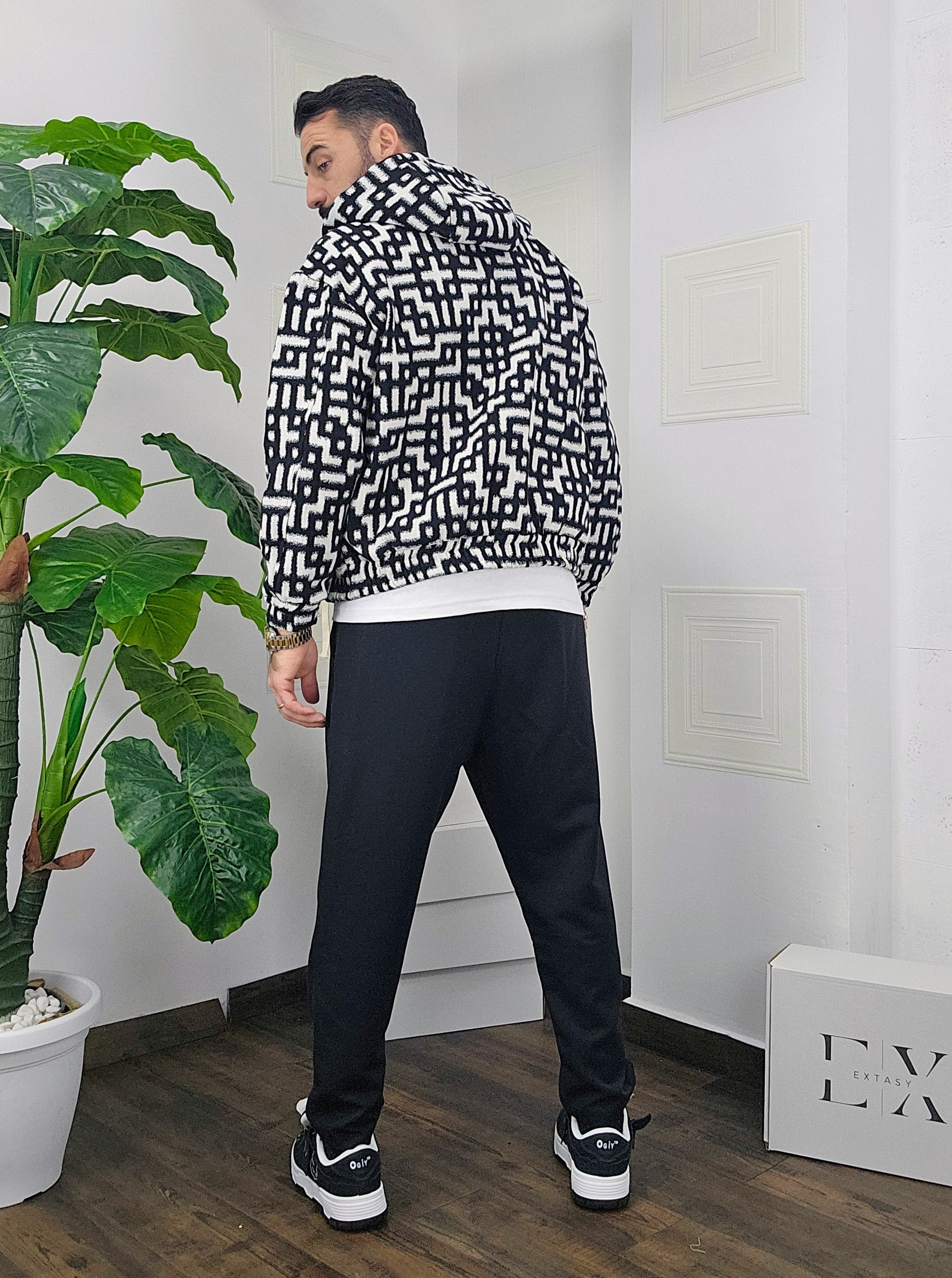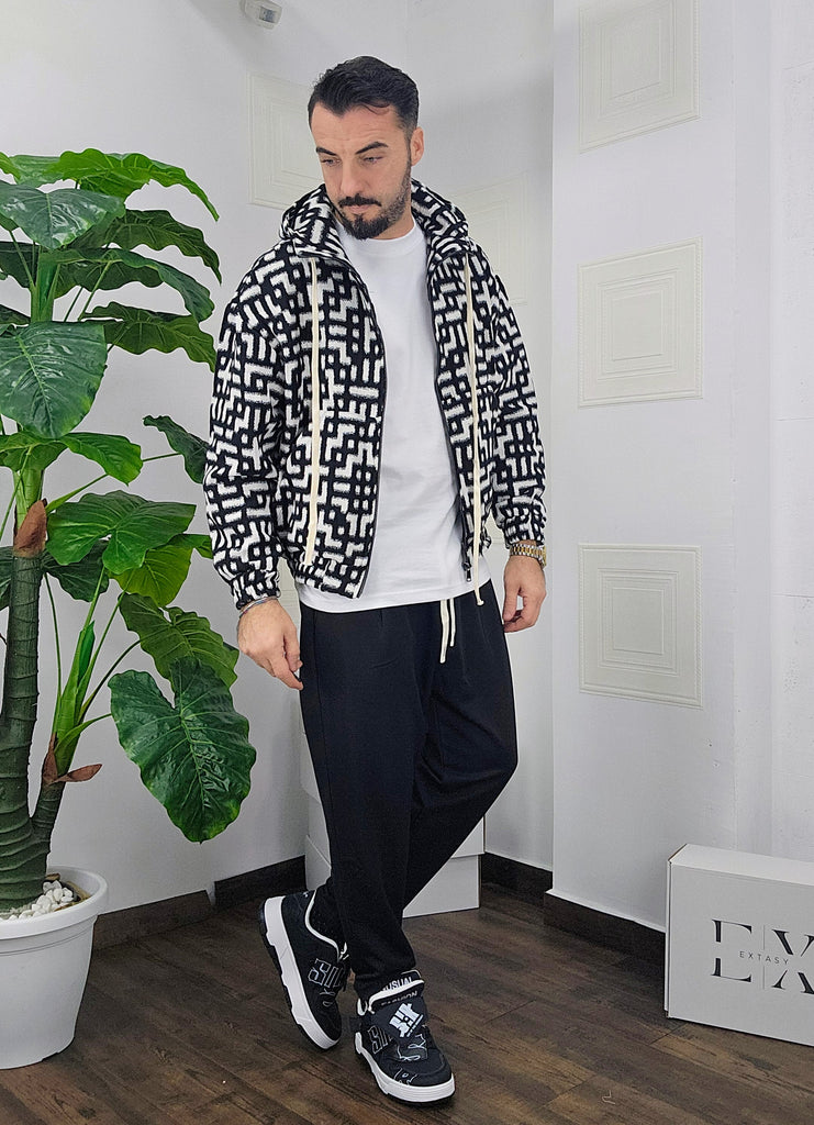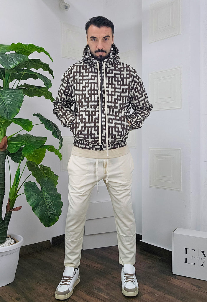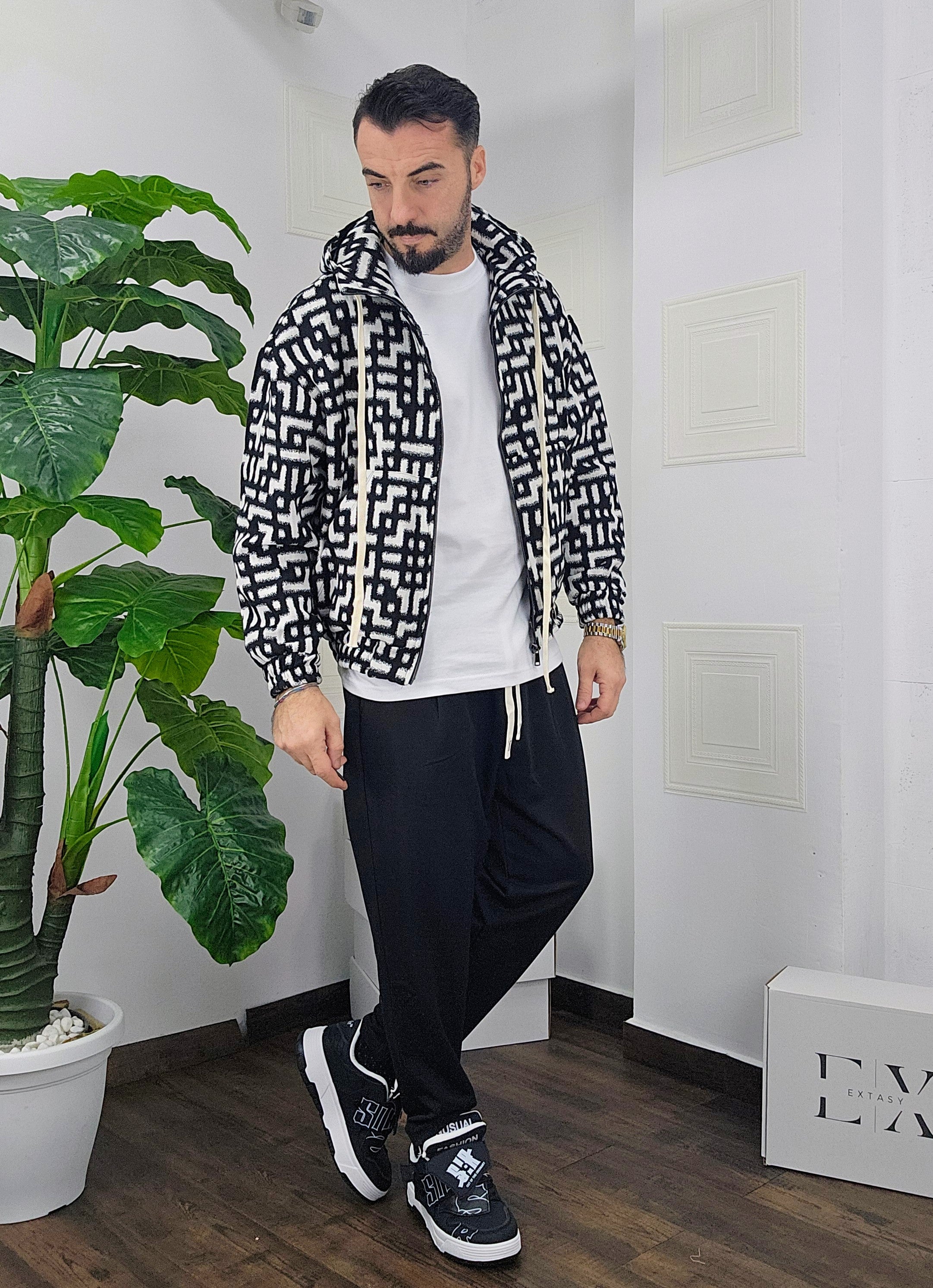 Completo in cotone giubbino calzata over size chiusura zip cappuccio regolabile pantatuta regolabile in vita dalla S alla XXL, il modello in foto è alto 1.82x76kg è indossa una taglia S.Prodotto Made in Italy