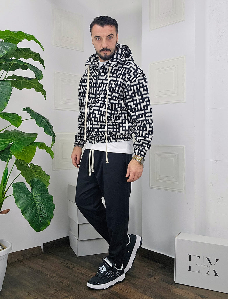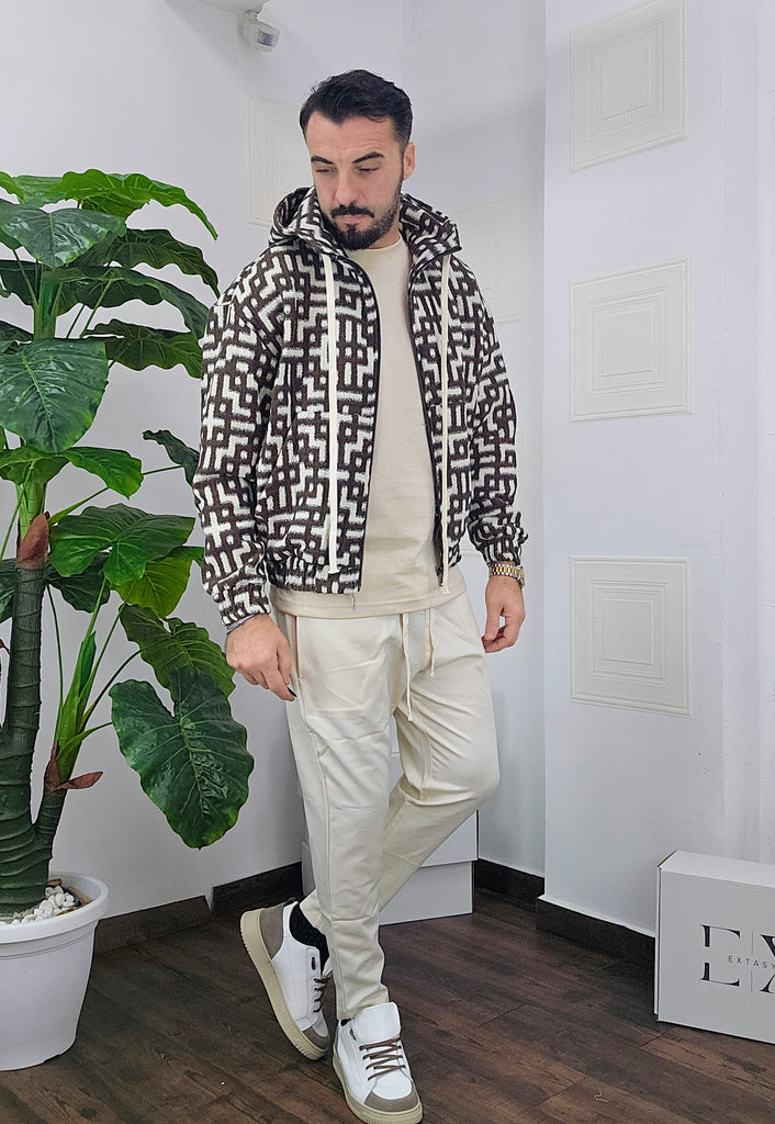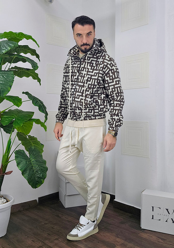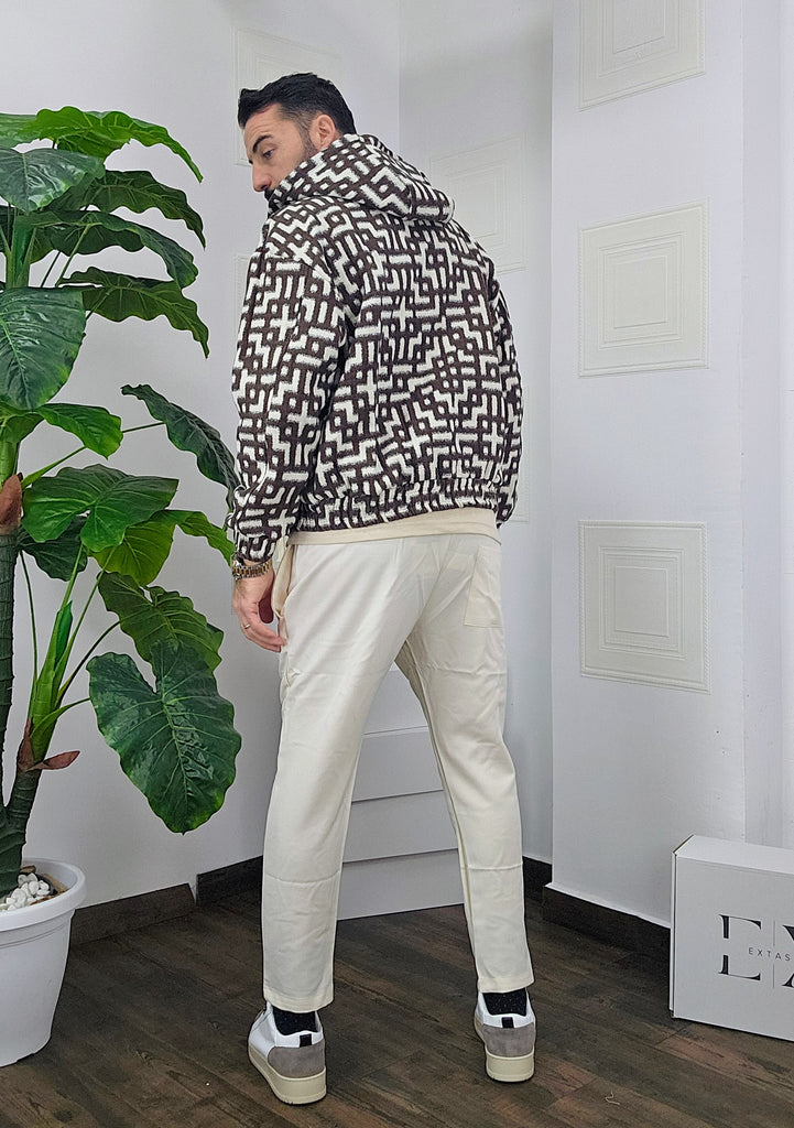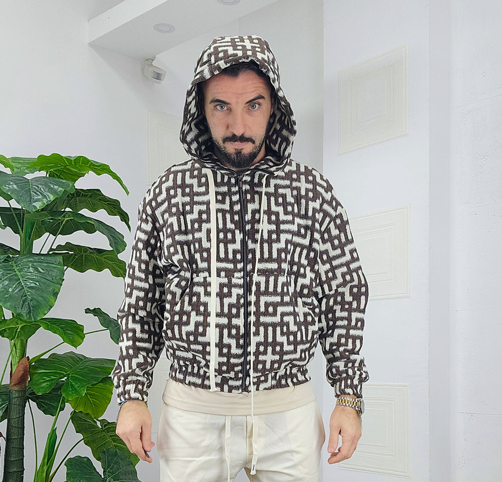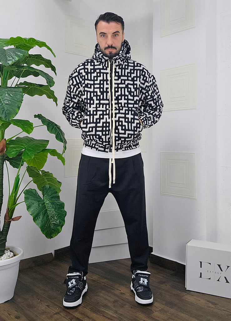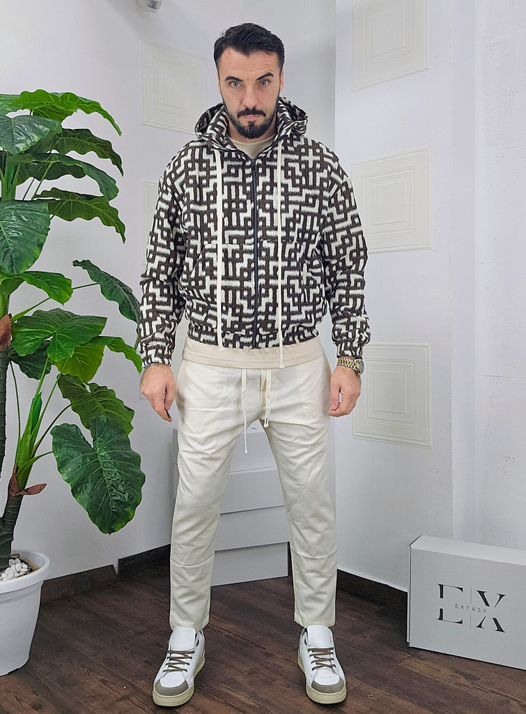 Completo in cotone giubbino calzata over size chiusura zip cappuccio regolabile pantatuta regolabile in vita dalla S alla XXL, il modello in foto è alto 1.82x76kg è indossa una taglia S.Prodotto Made in Italy