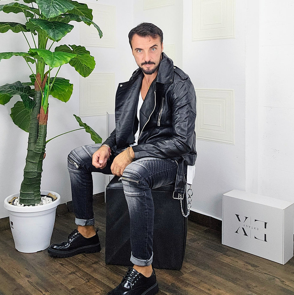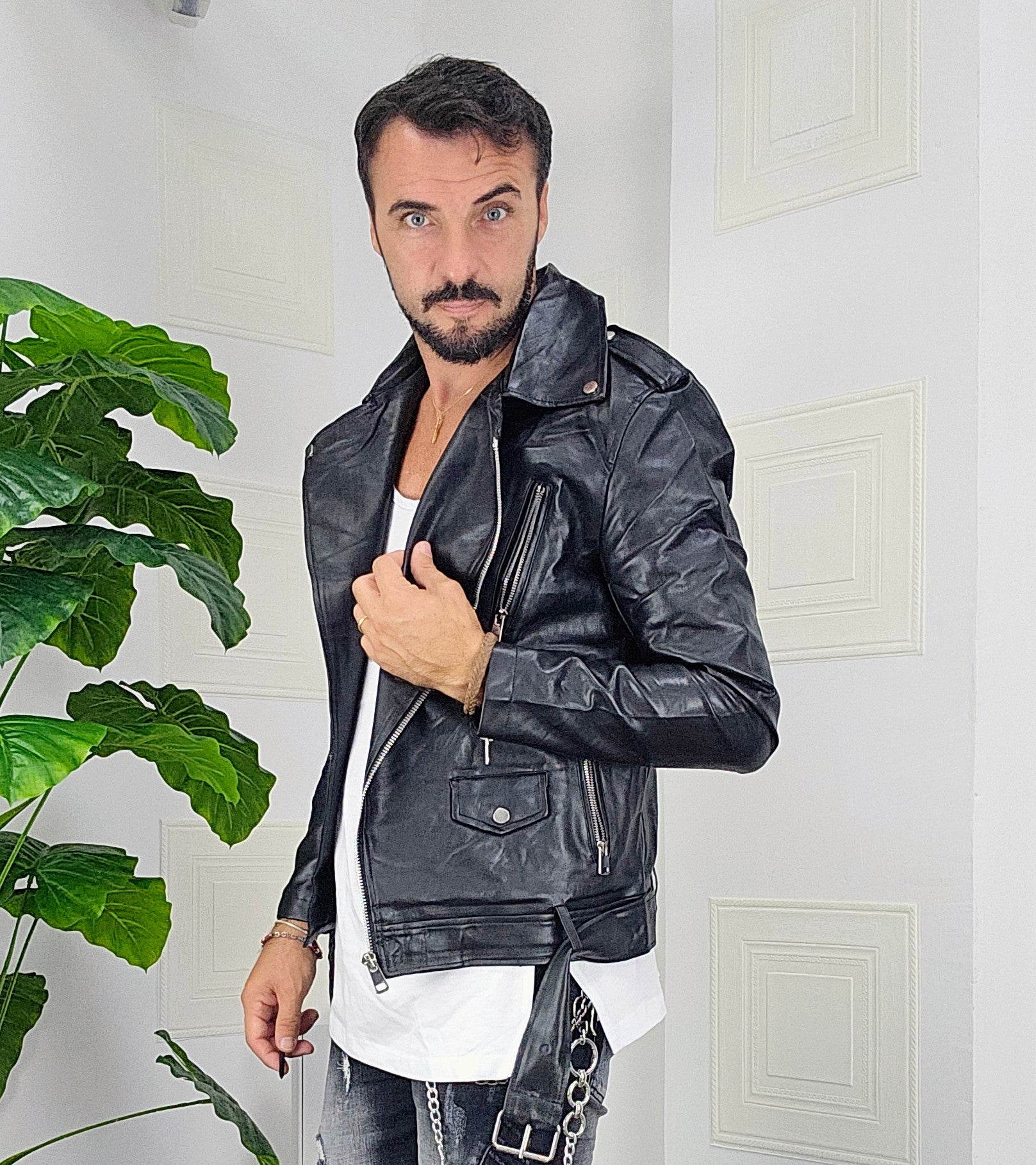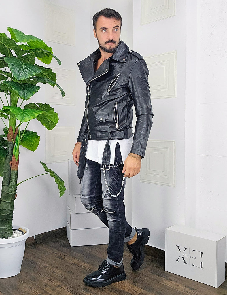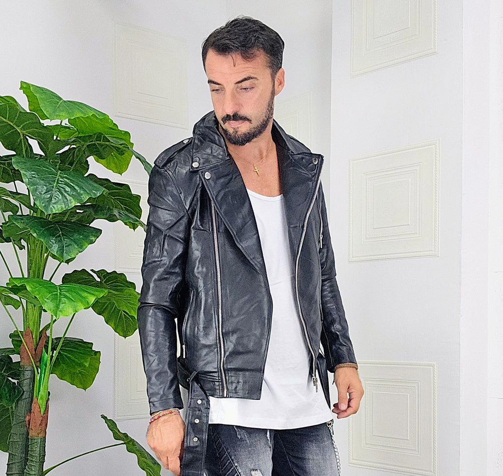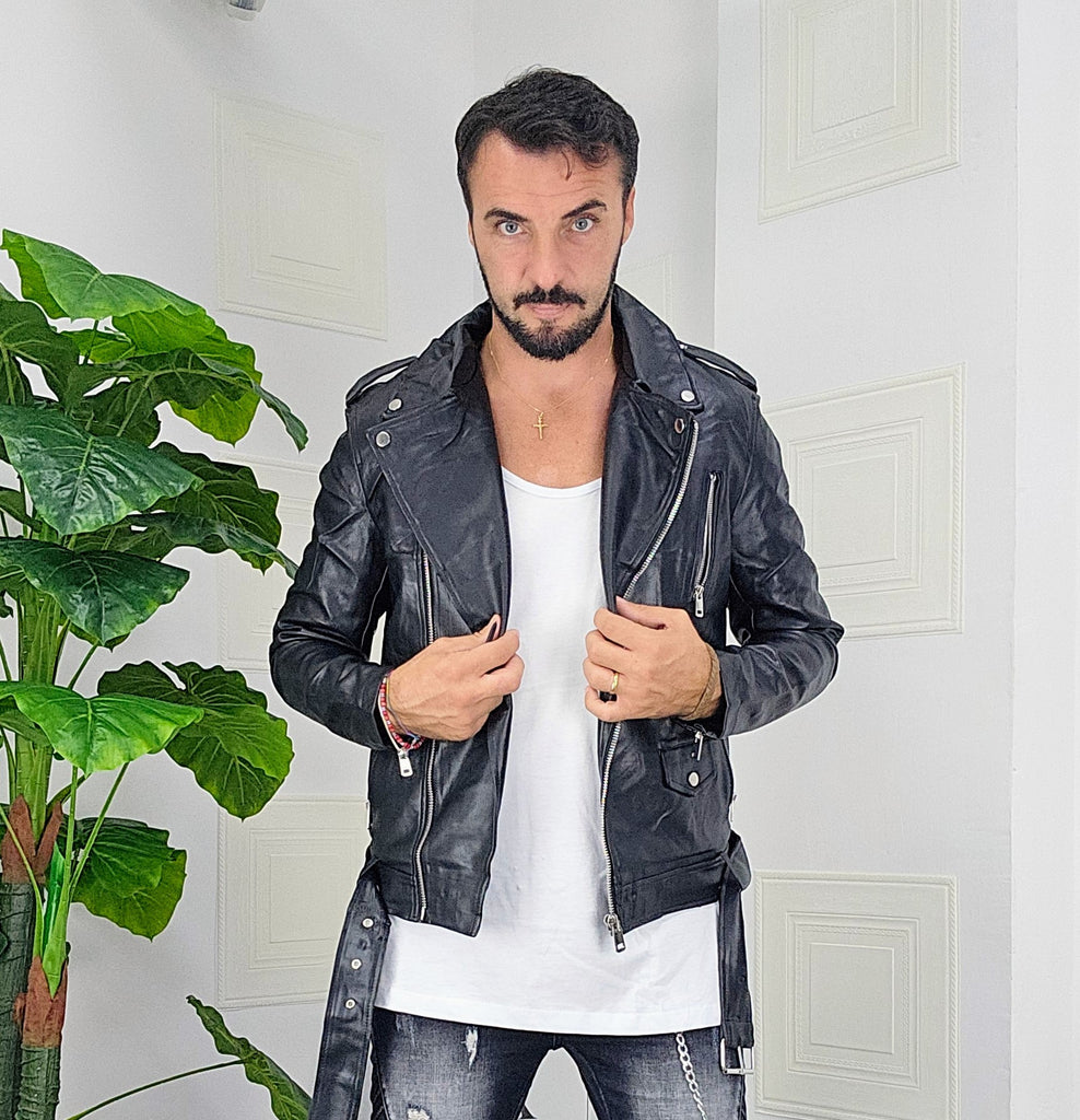 Chiodo in pelle con chiusure a zip 2 gradi altezza spalle con chiusura a ciappa chiusura cintura dalla S alla XXL, il modello in foto è alto 1.82x76kg è indossa una taglia S.Prodotto Made in Italy