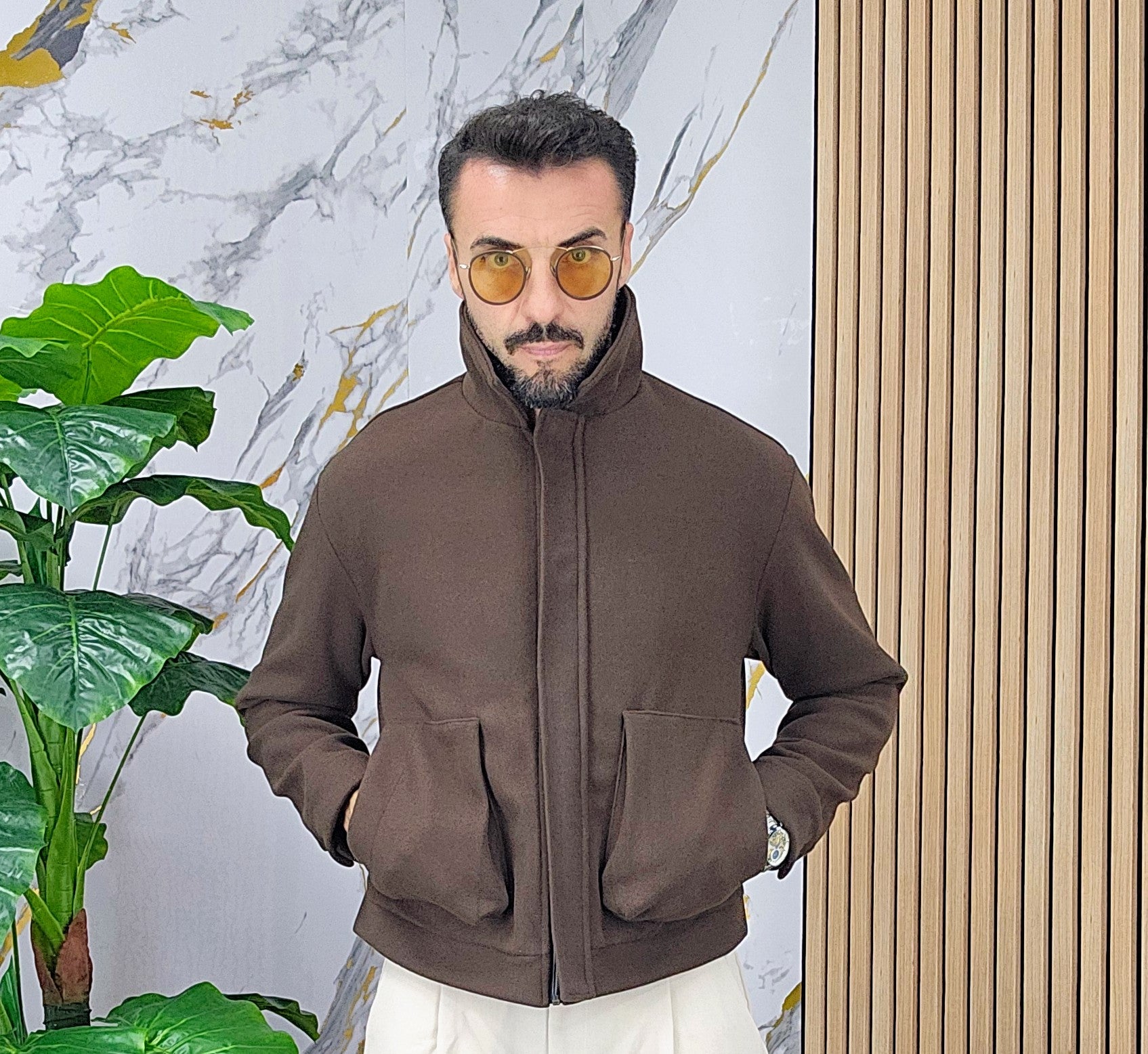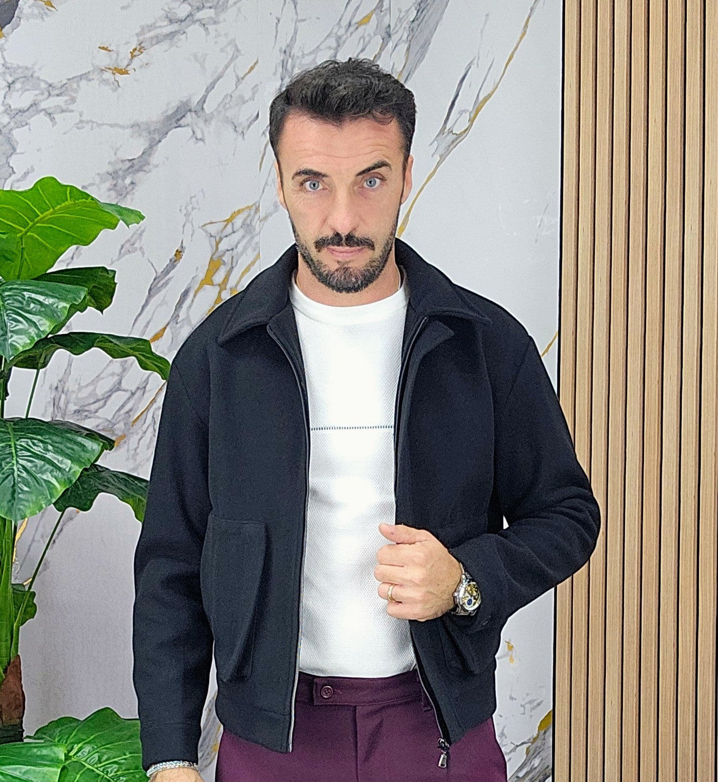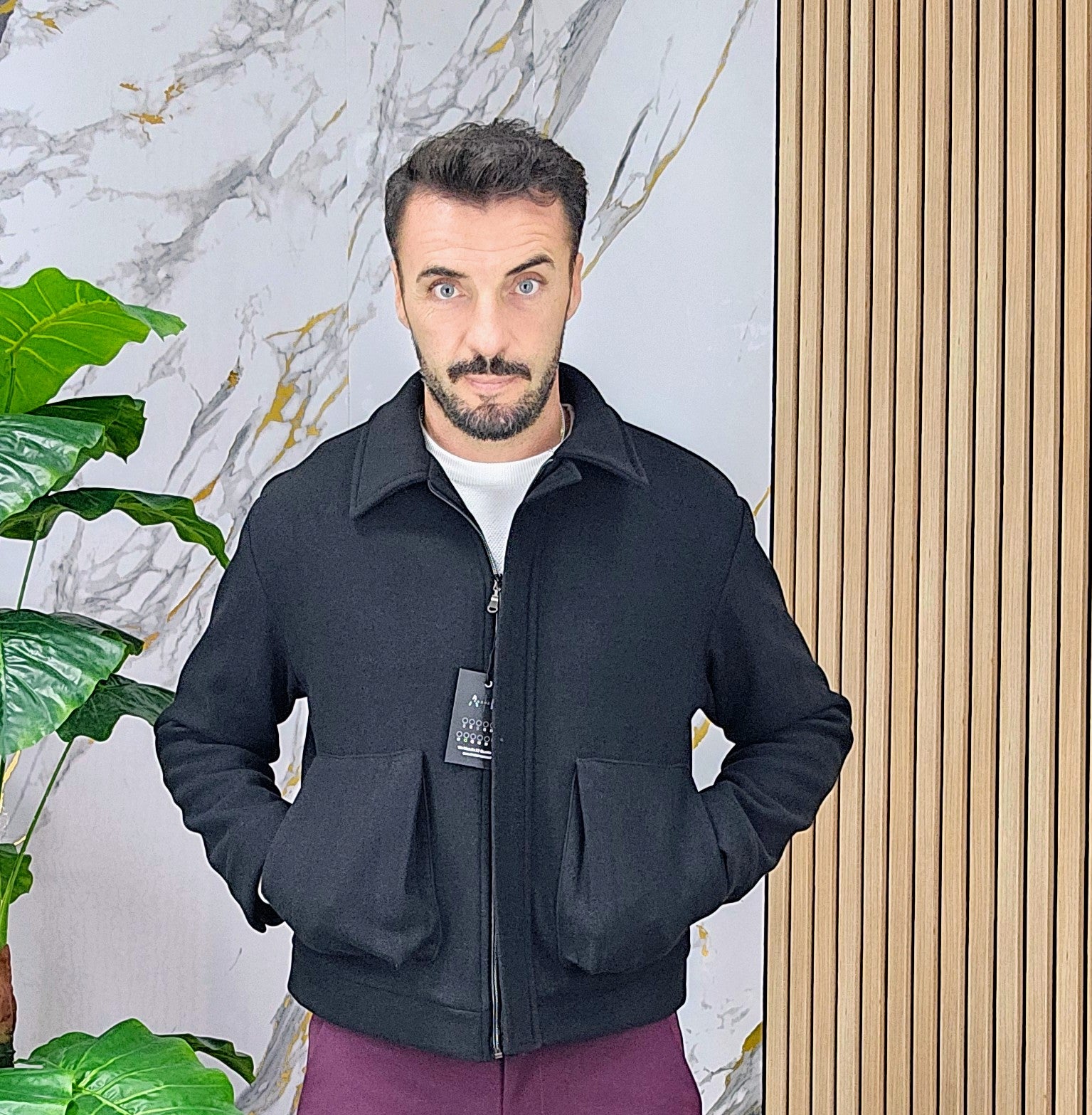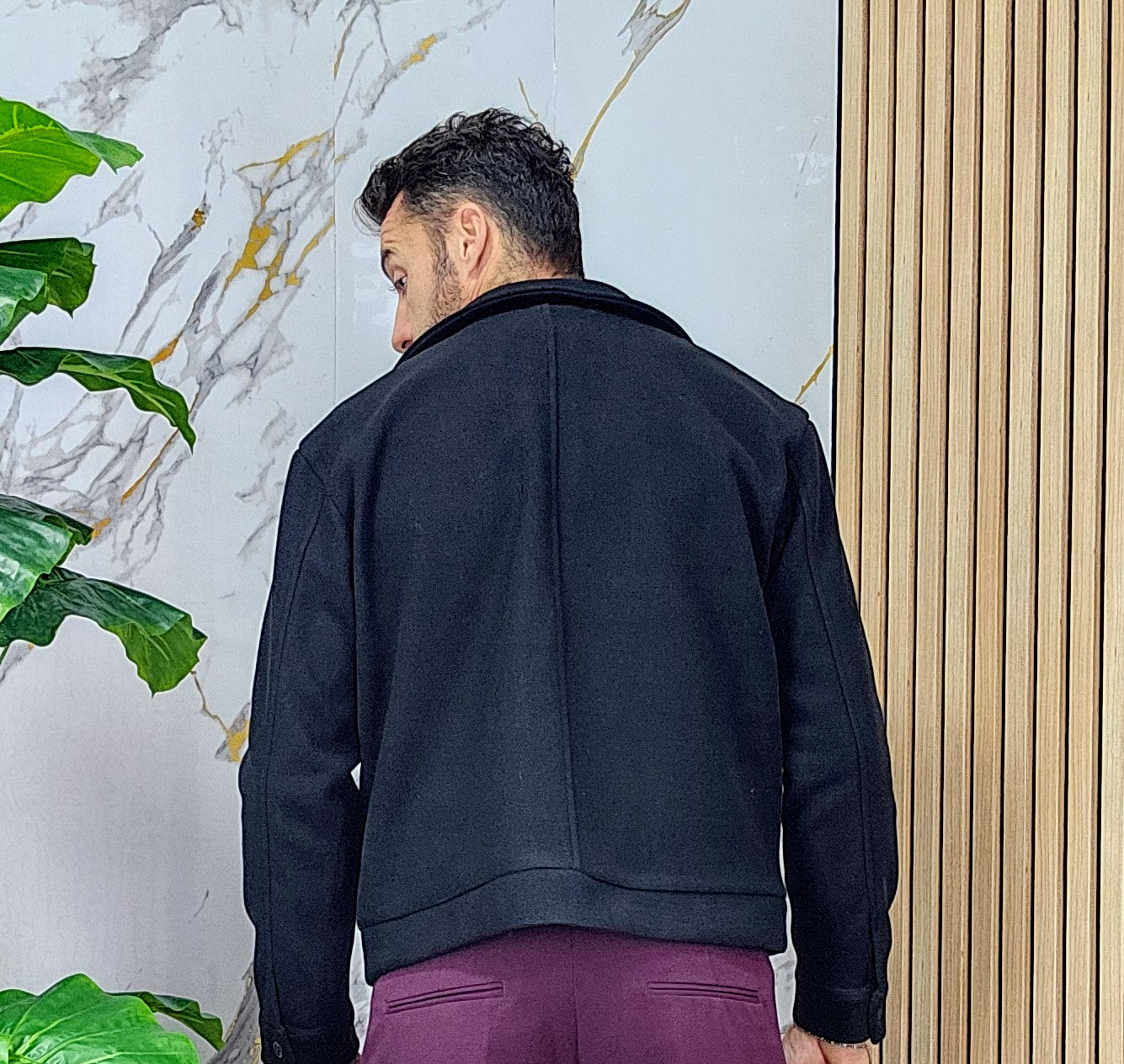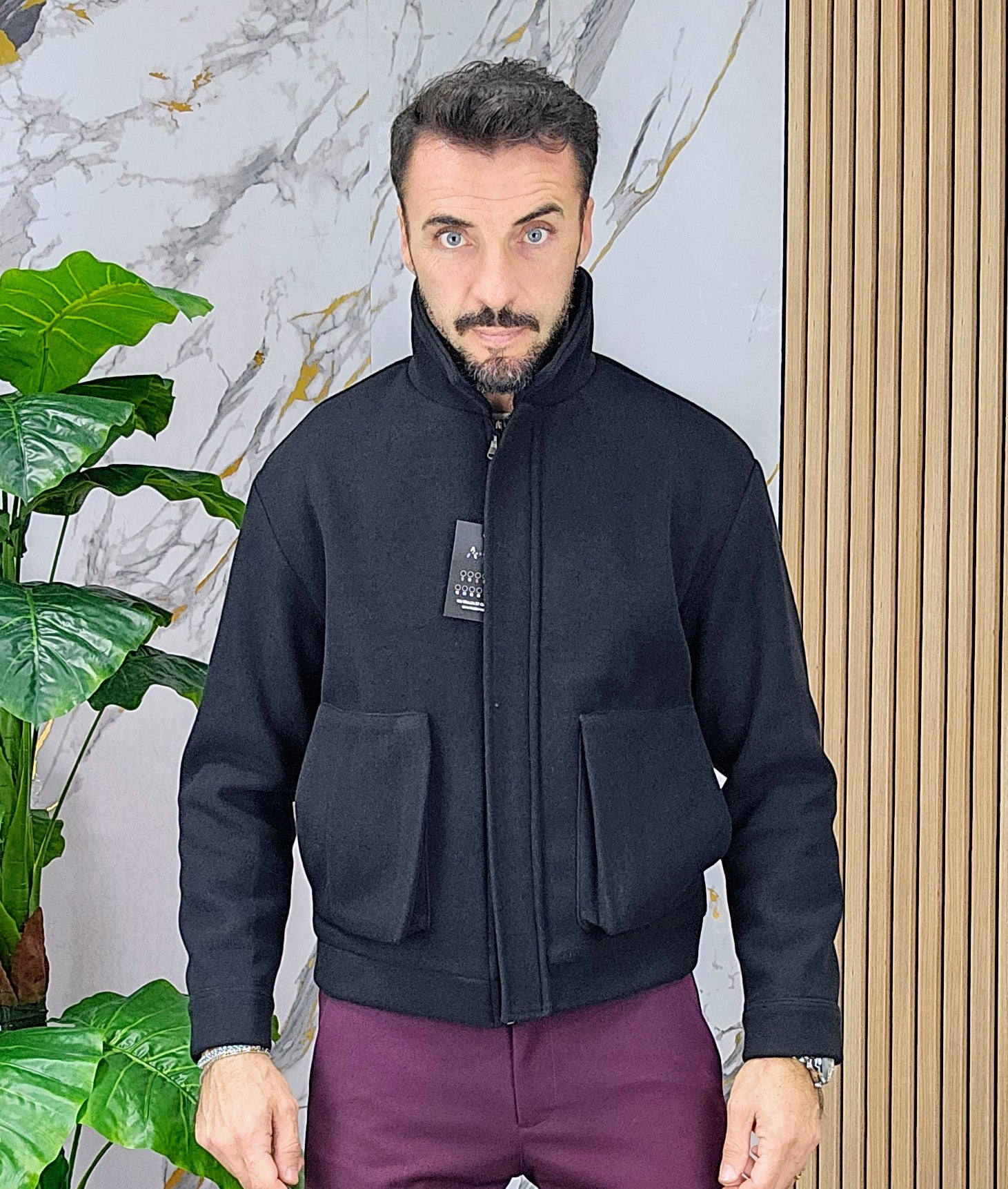Giubbino dalla vestibilità comoda foderato all'interno tessuto in panno caldo chiusura zip centrale 2 tasche laterali collo alla francese dalla S alla XXL, il modello in foto è alto 1.82x76kg è indossa una taglia S.Prodotto Made in Italy