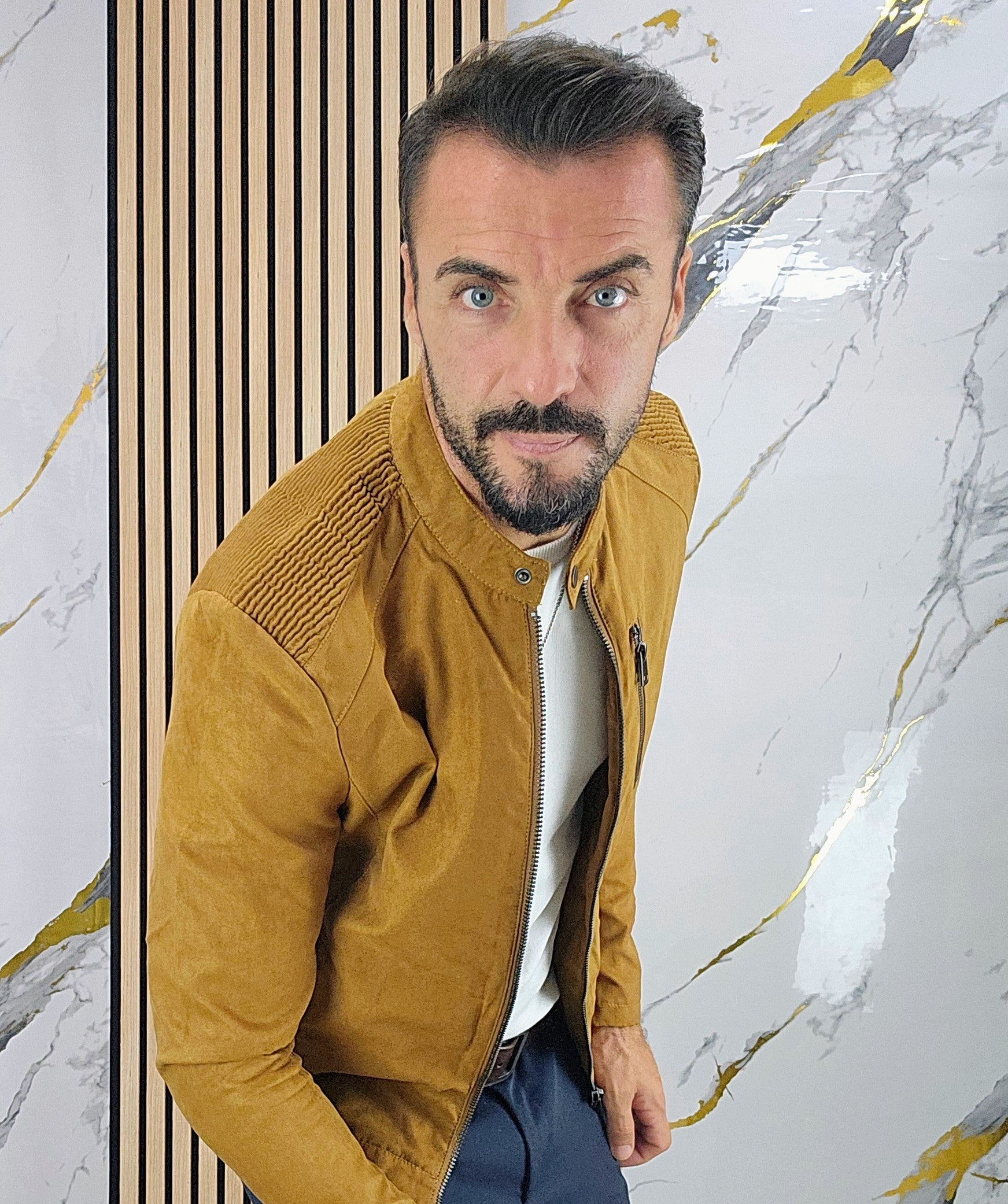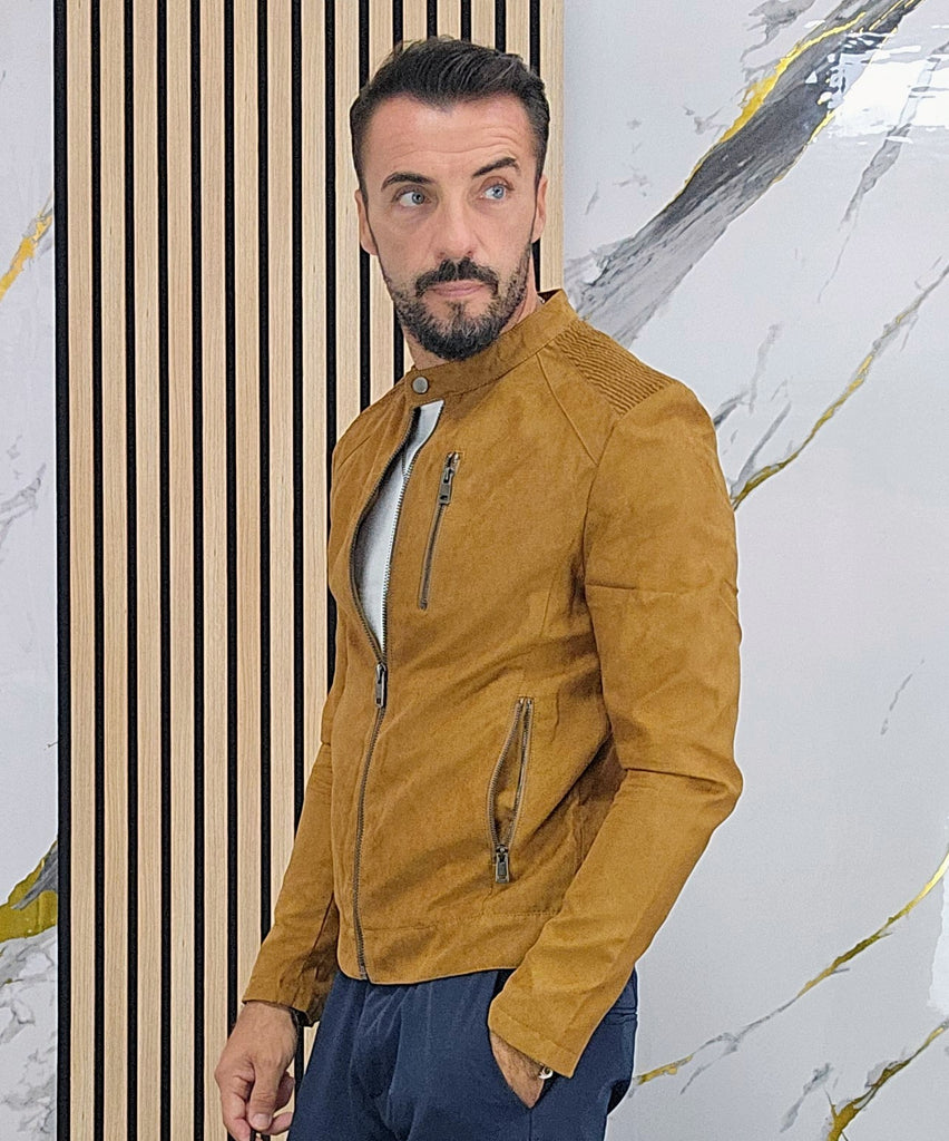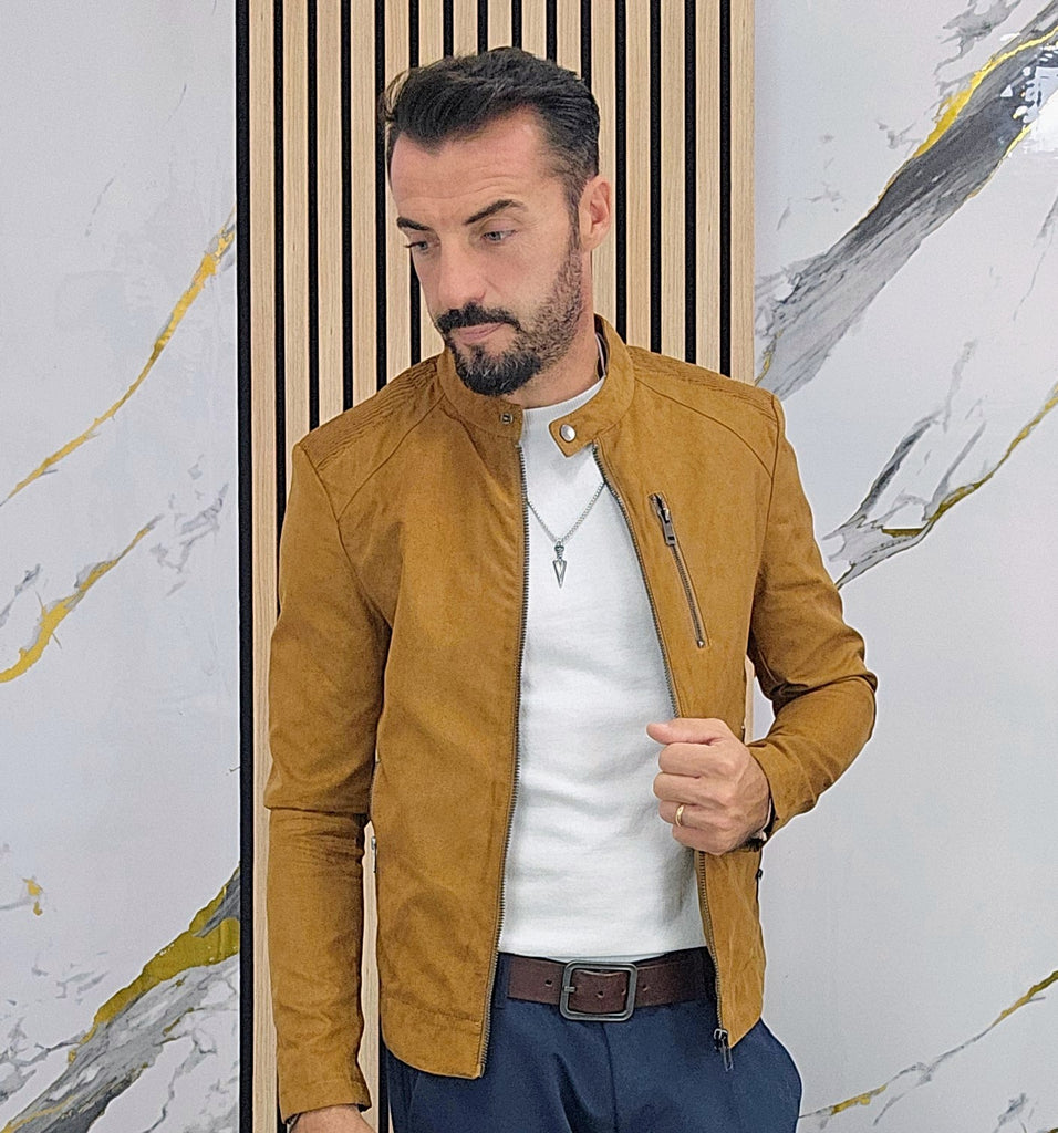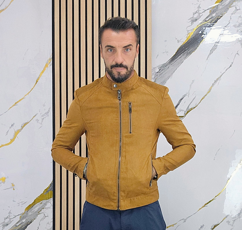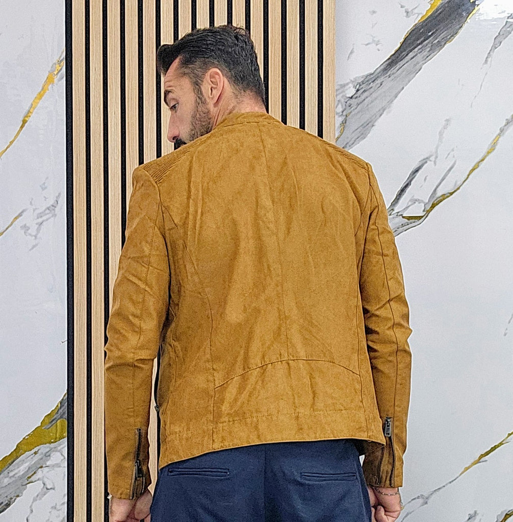 Giubbino in camoscio foderato all'interno con chiusura zip centrale 2 tasche laterali chiusura zip una tasca lato cuore chiusura zip taschino all'interno chiusura ciappa al collo dalla S alla XXL, il modello in foto è alto 1.82x76kg è indossa una taglia S.Prodotto Made in Italy