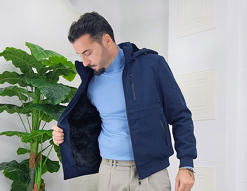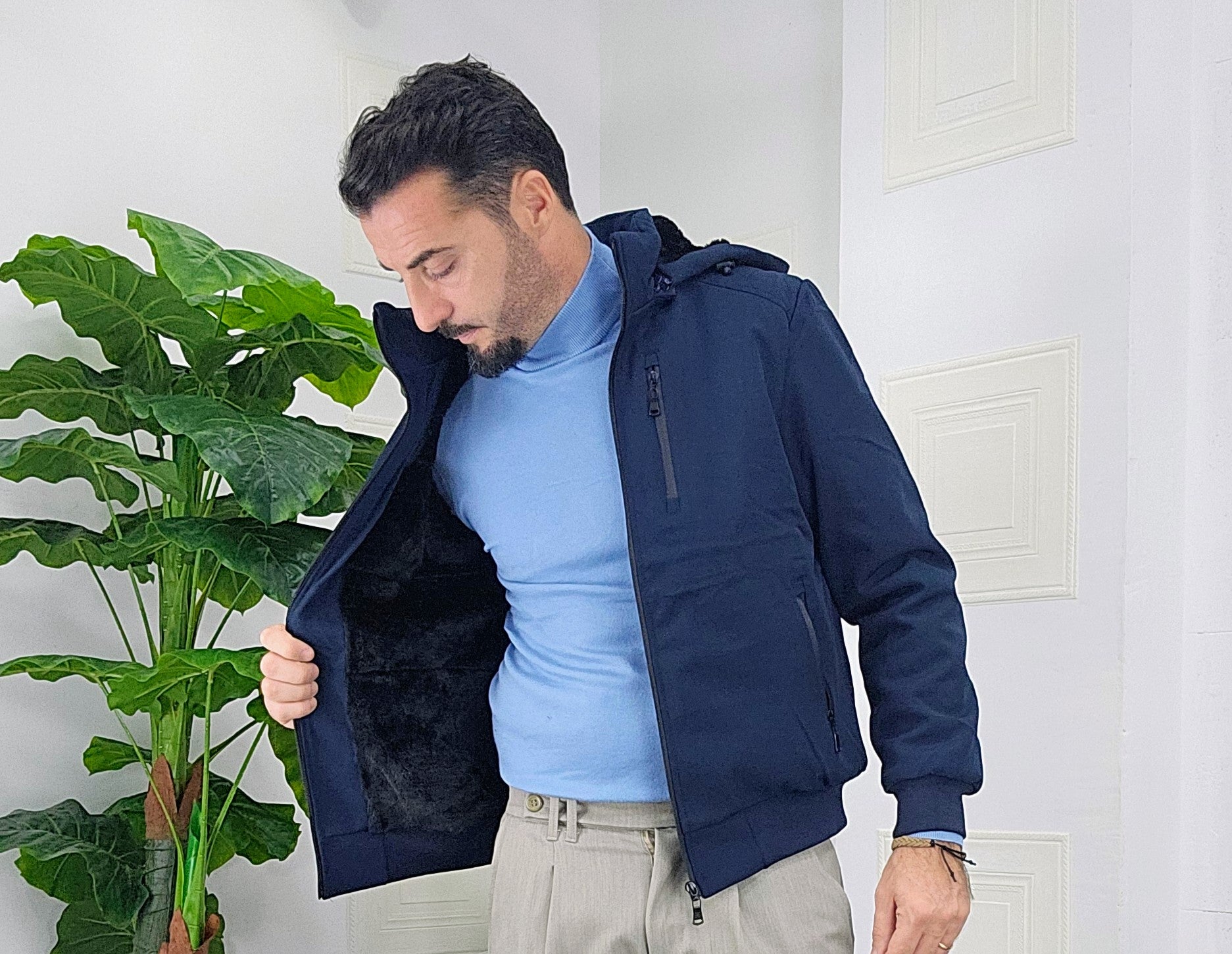 Giubbino pelliccato all'interno anche nel cappuccio estraibile regolabile tasche in termosaldate Taschino al petto taschino all'interno polsino molla molla al girovita dalla M alla XXL, il modello in foto è alto 1.82x76kg è indossa una taglia M.Prodotto Made in Italy