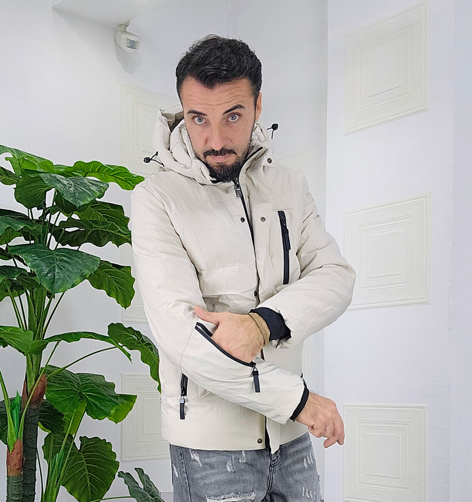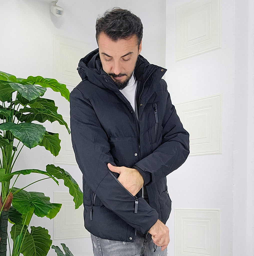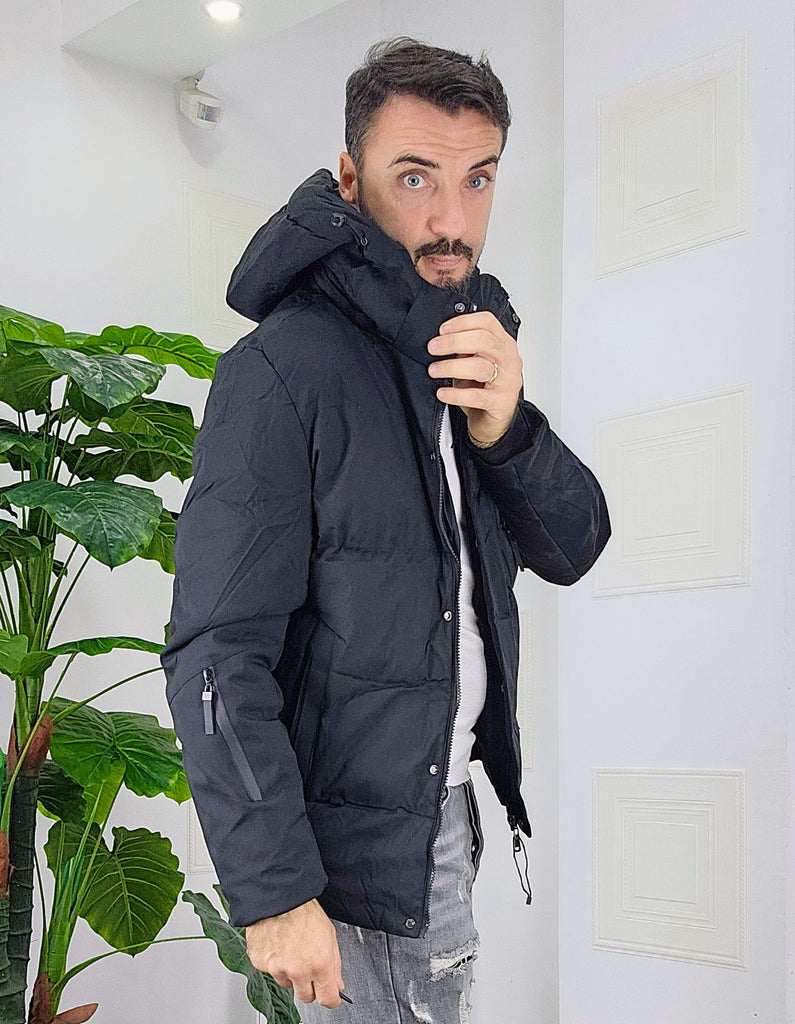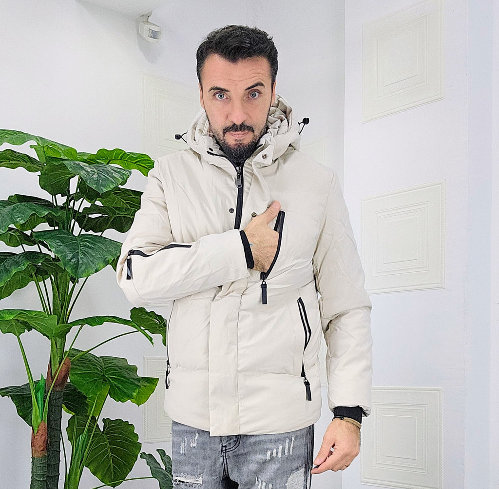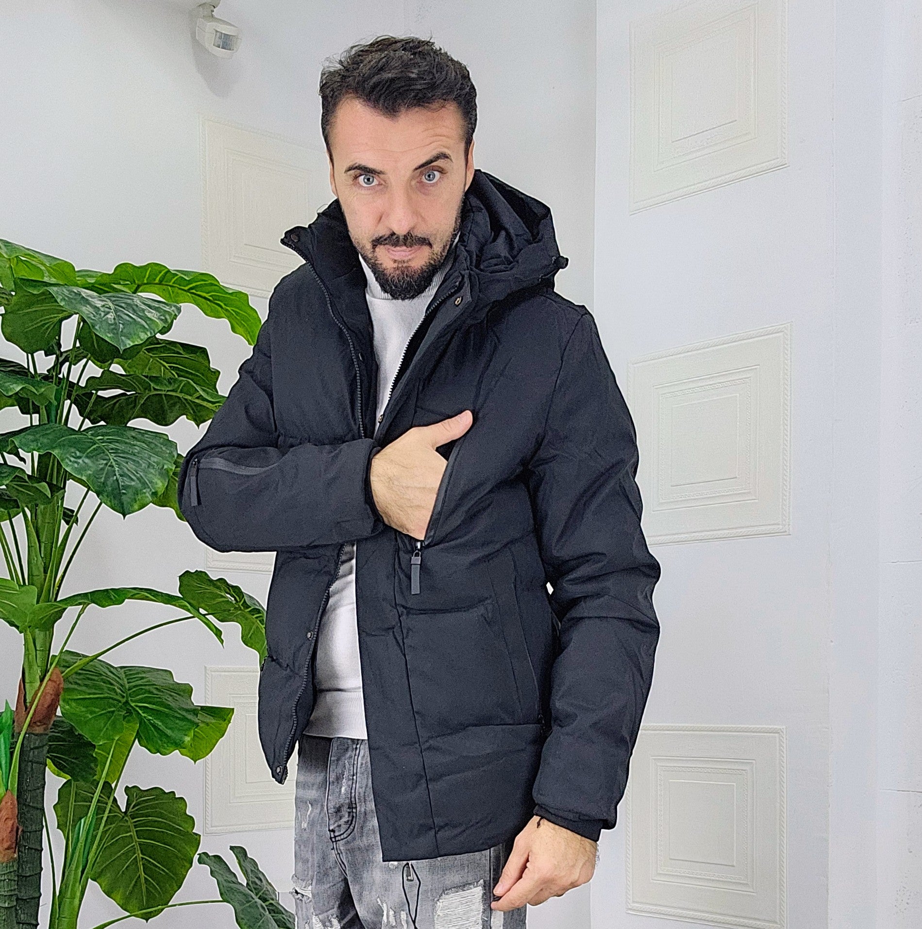Giubbino imbottito con chiusura a zip chiusura a ciappa con 2 tasche laterali una tasca al petto taschino sul braccio taschino all'interno cappuccio estraibile regolabile cappuccio con chiusura a ciappa a scomparsa dalla M alla XXXL, il modello in foto è alto 1.82x76kg è indossa una taglia M.Prodotto Made in Italy