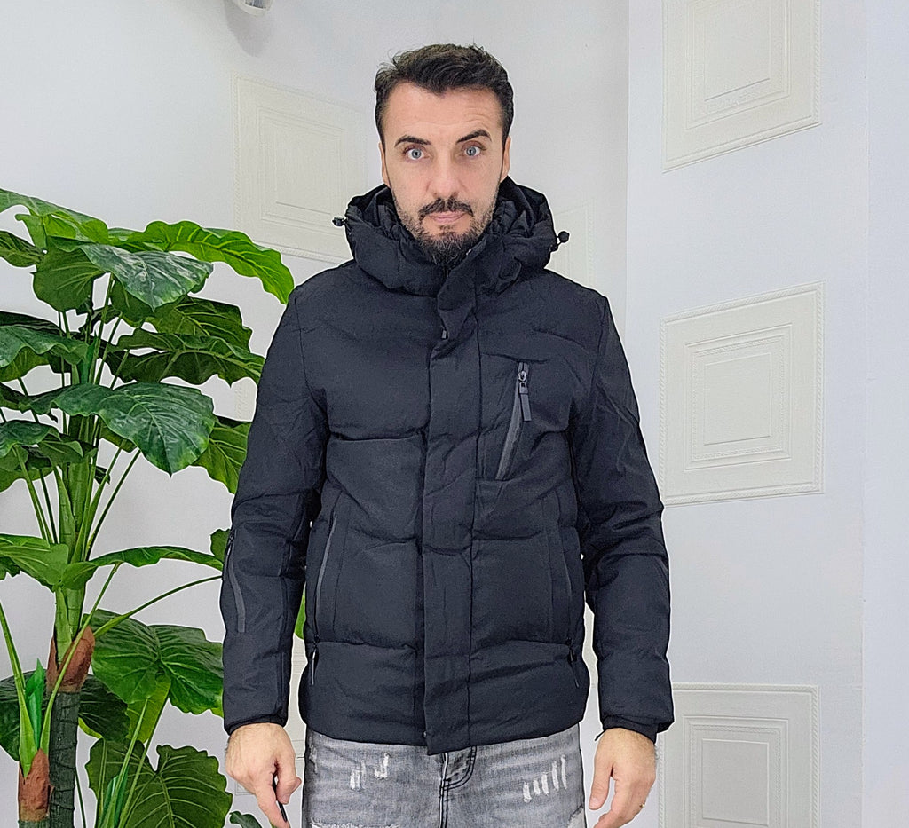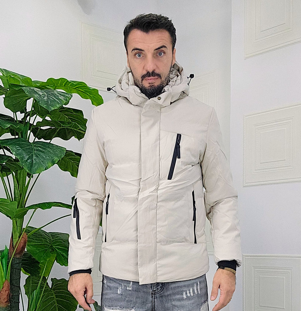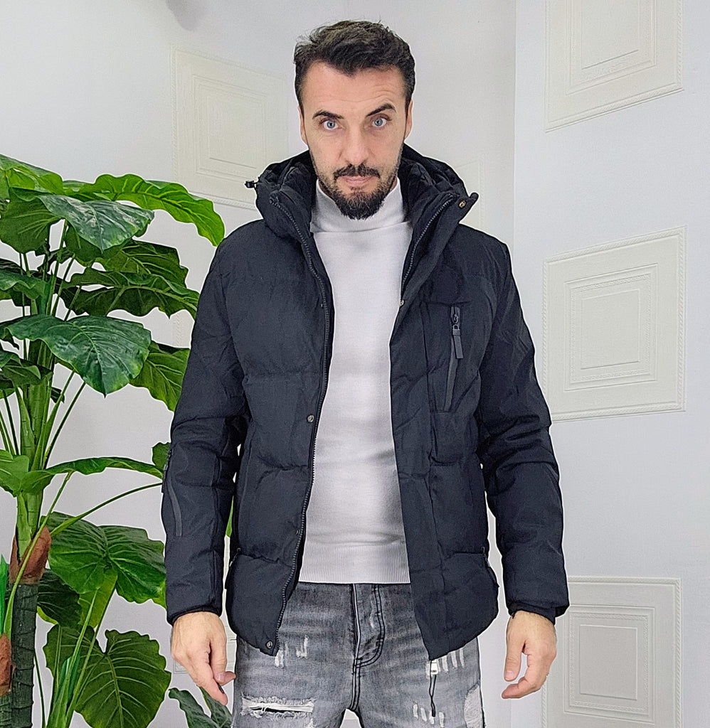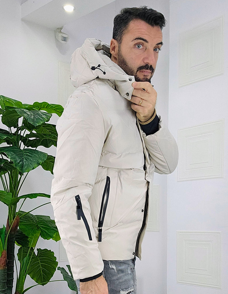 Giubbino imbottito con chiusura a zip chiusura a ciappa con 2 tasche laterali una tasca al petto taschino sul braccio taschino all'interno cappuccio estraibile regolabile cappuccio con chiusura a ciappa a scomparsa dalla M alla XXXL, il modello in foto è alto 1.82x76kg è indossa una taglia M.Prodotto Made in Italy