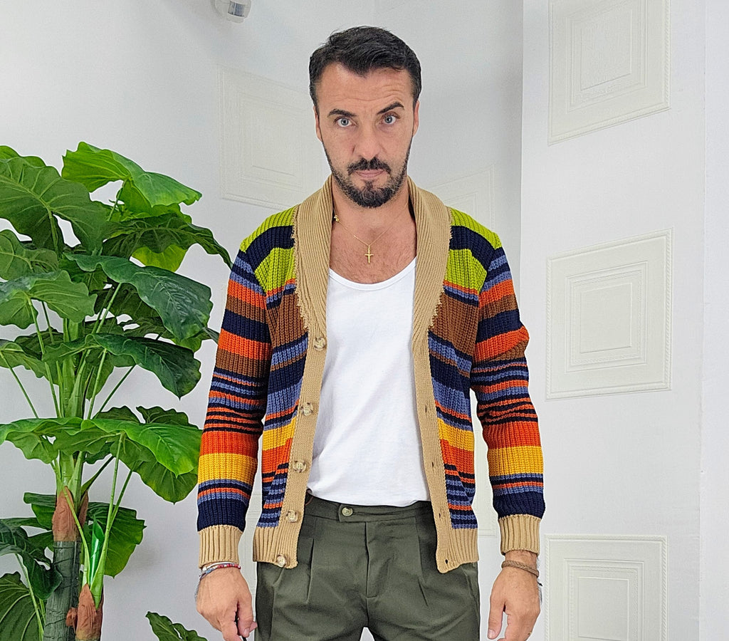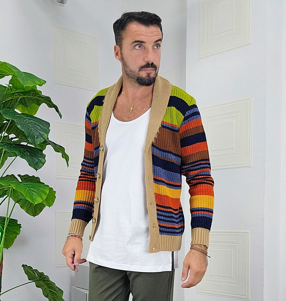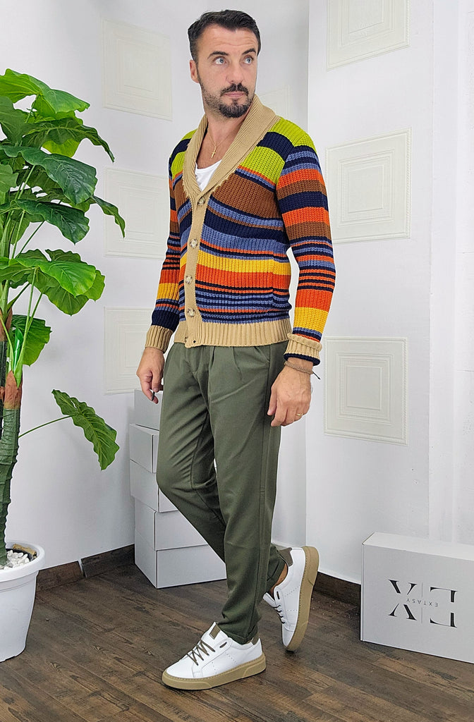 Giacca cardigan chiusura a 5 bottoni in contrasto dalla S alla XXL, il modello in foto è alto 1.82x76kg è indossa una taglia S.Prodotto Made in Italy