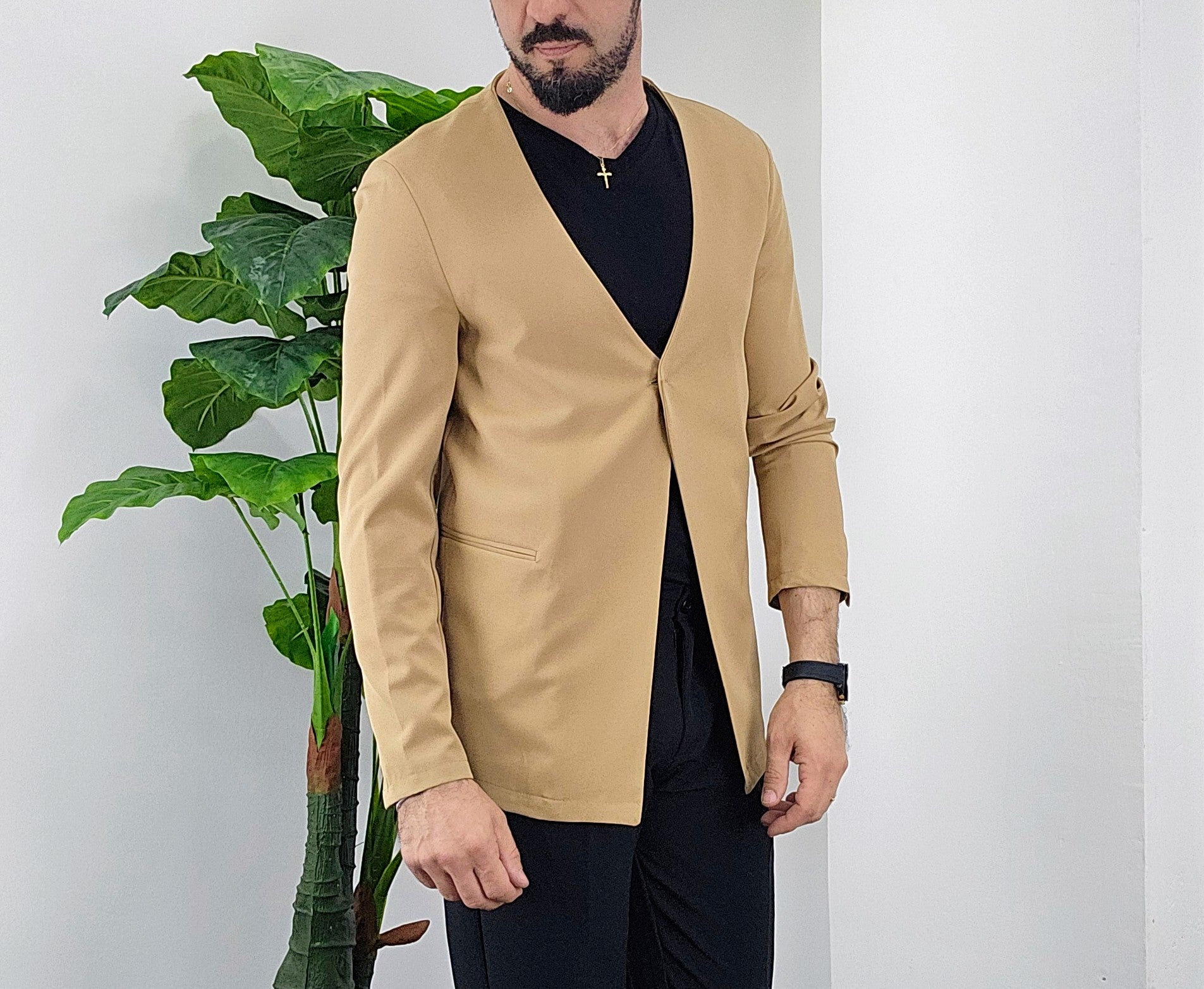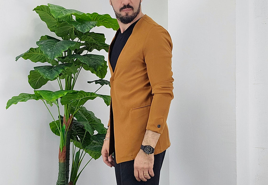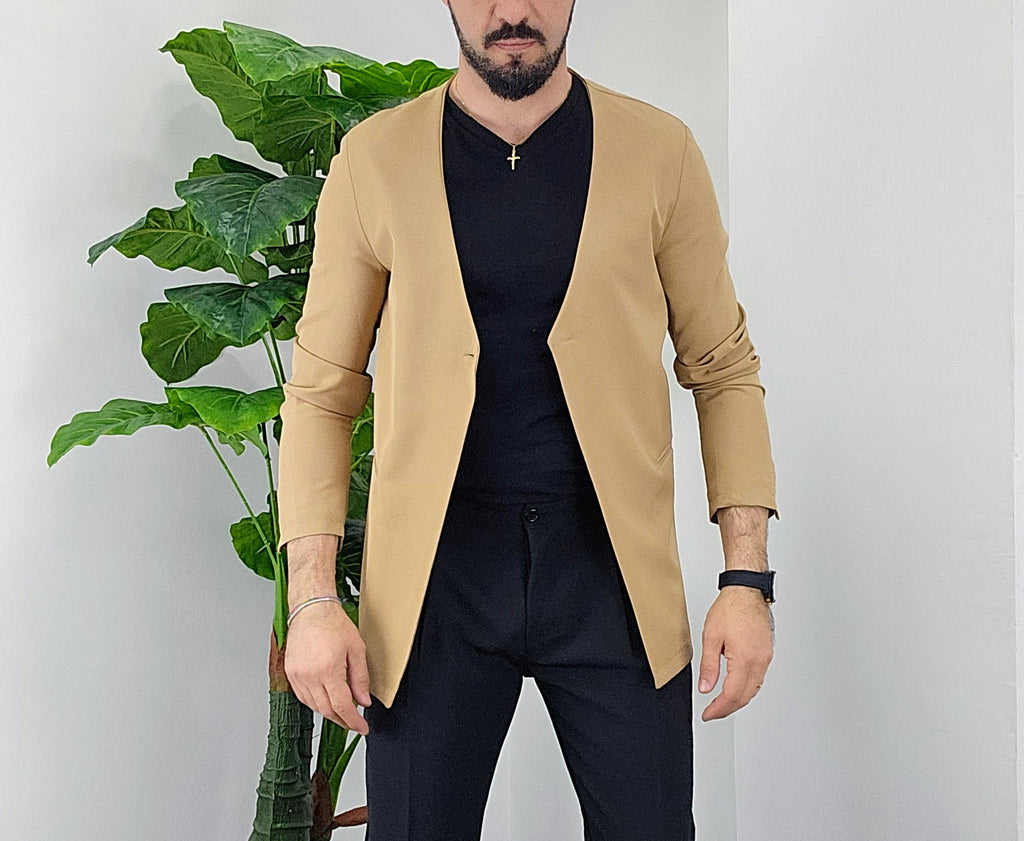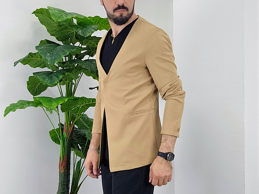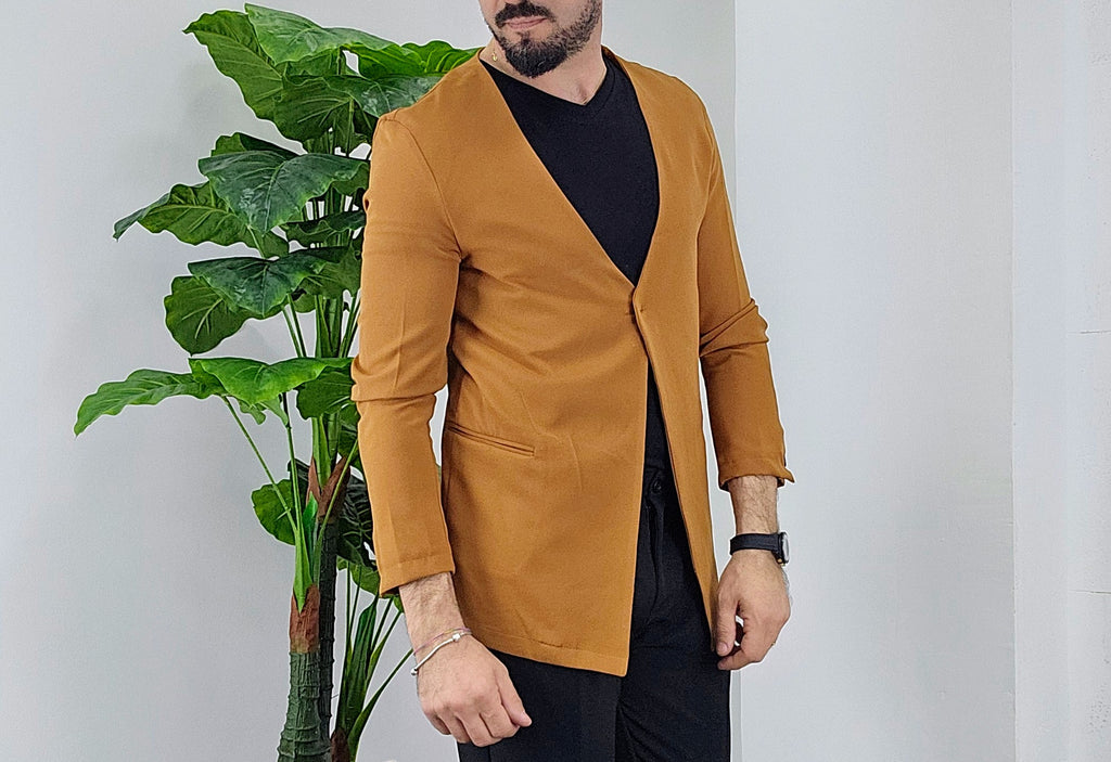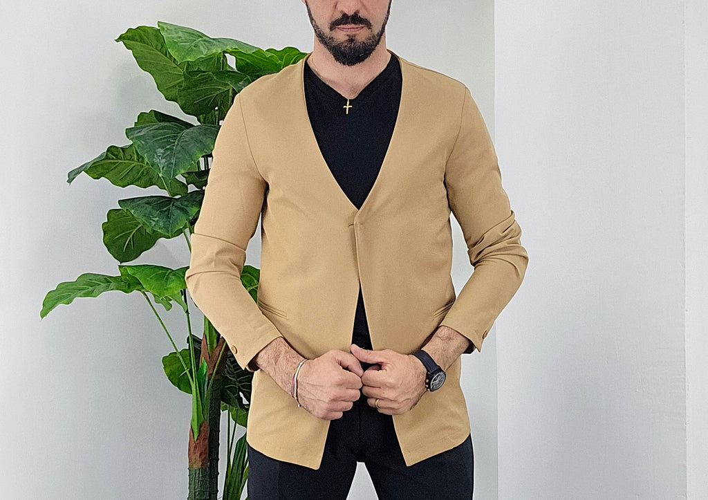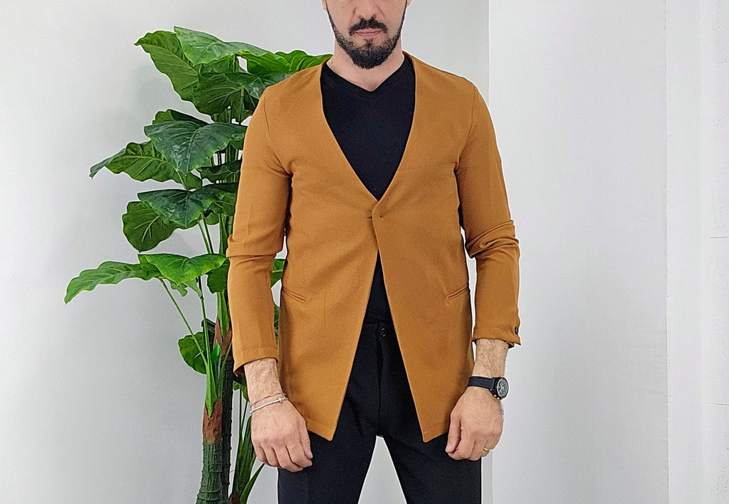 Giacca senza collo con chiusura centrale bottone a scomparsa elastica sim fit dalla 44 alla 52,il modello in foto è alto 1.82x76kg è indossa una taglia 46.Prodotto Made in Italy