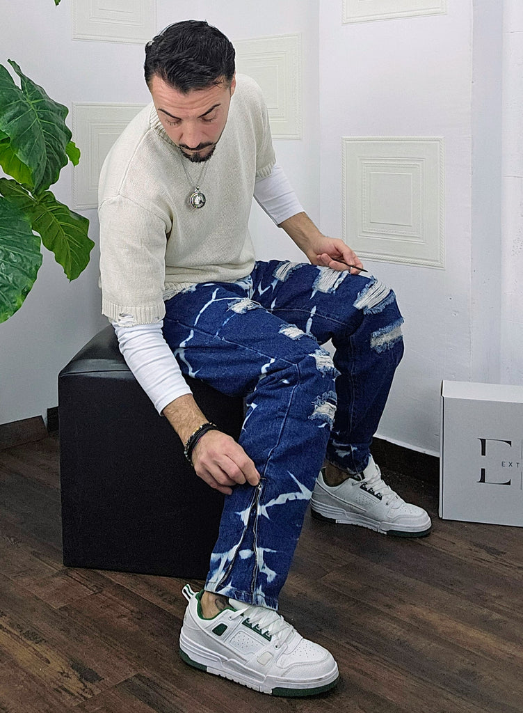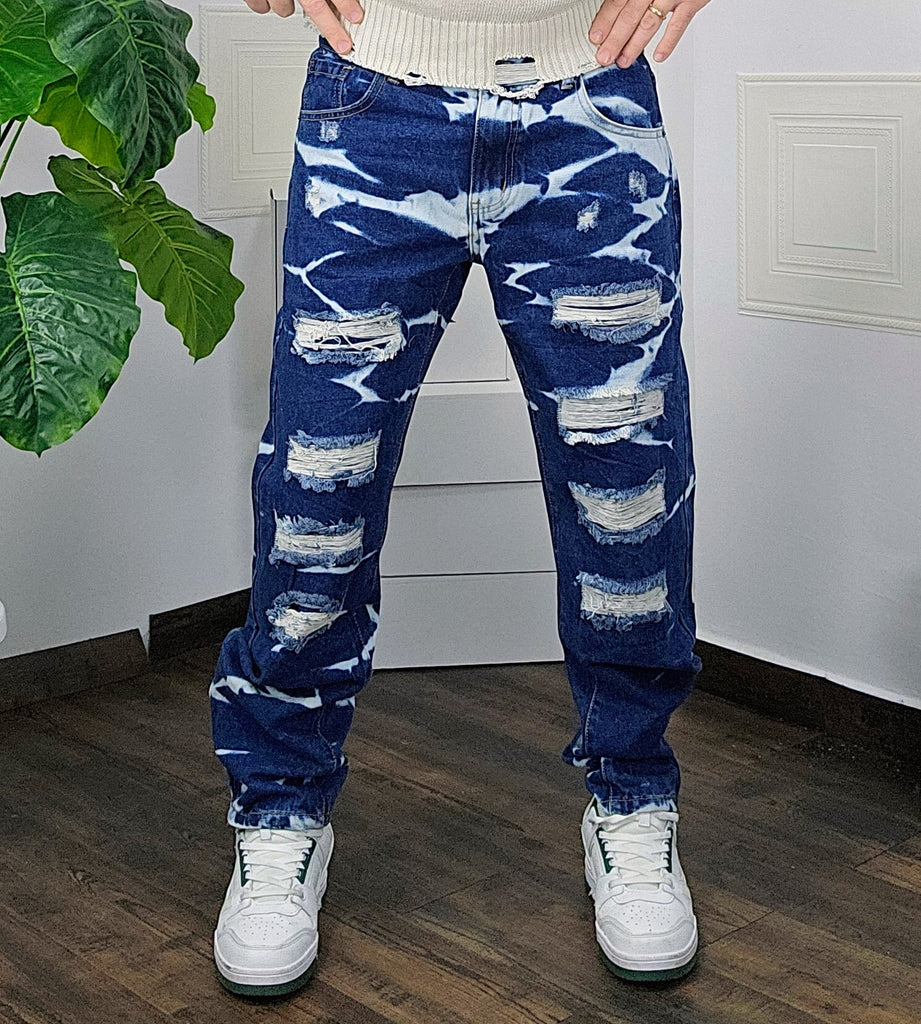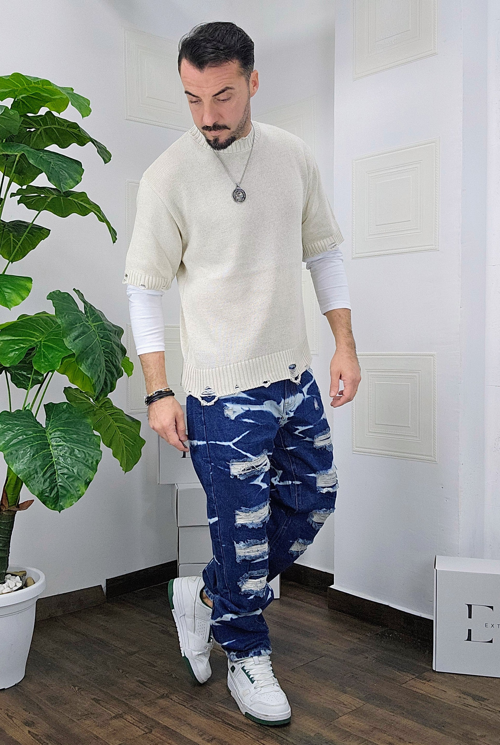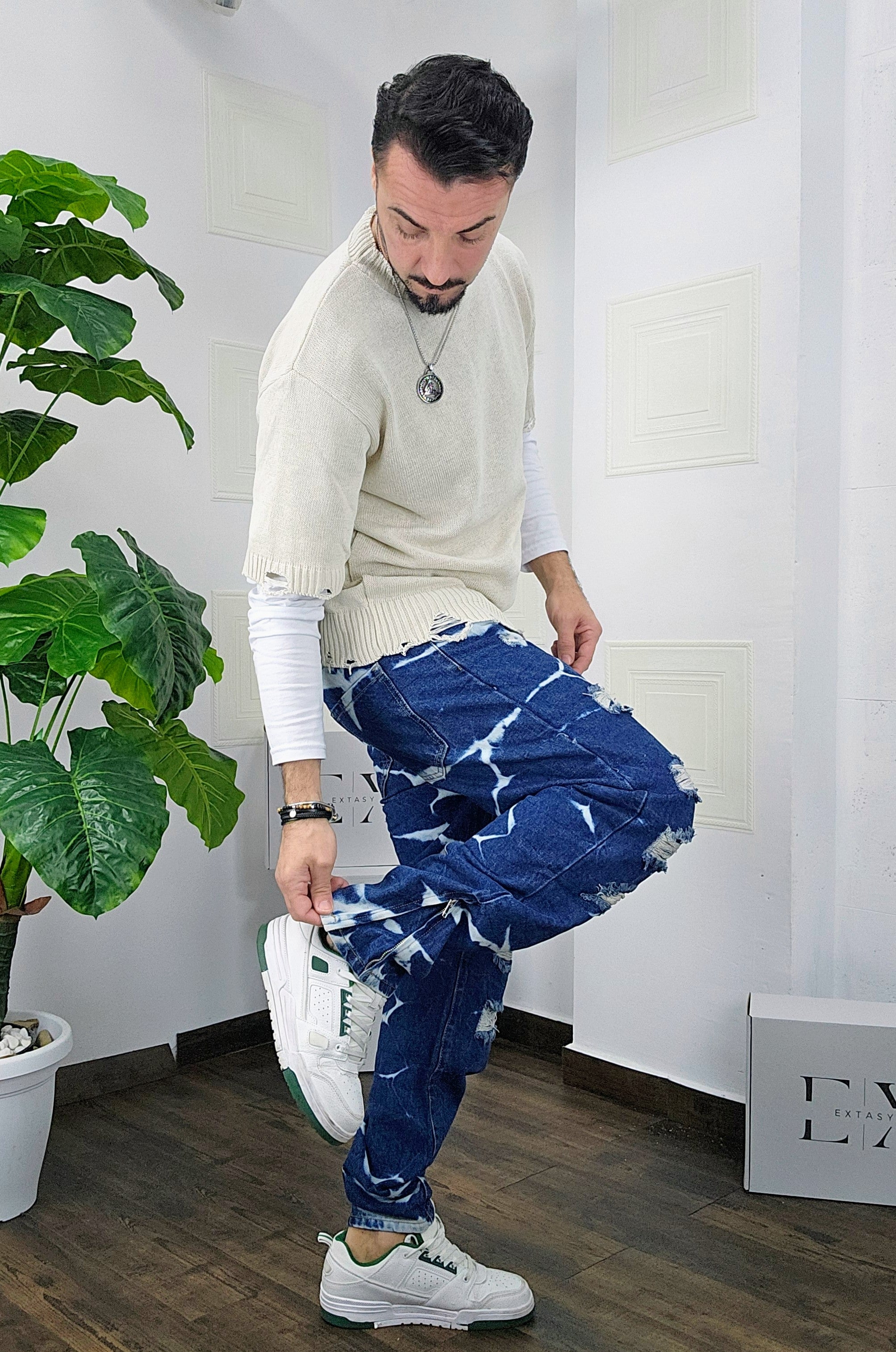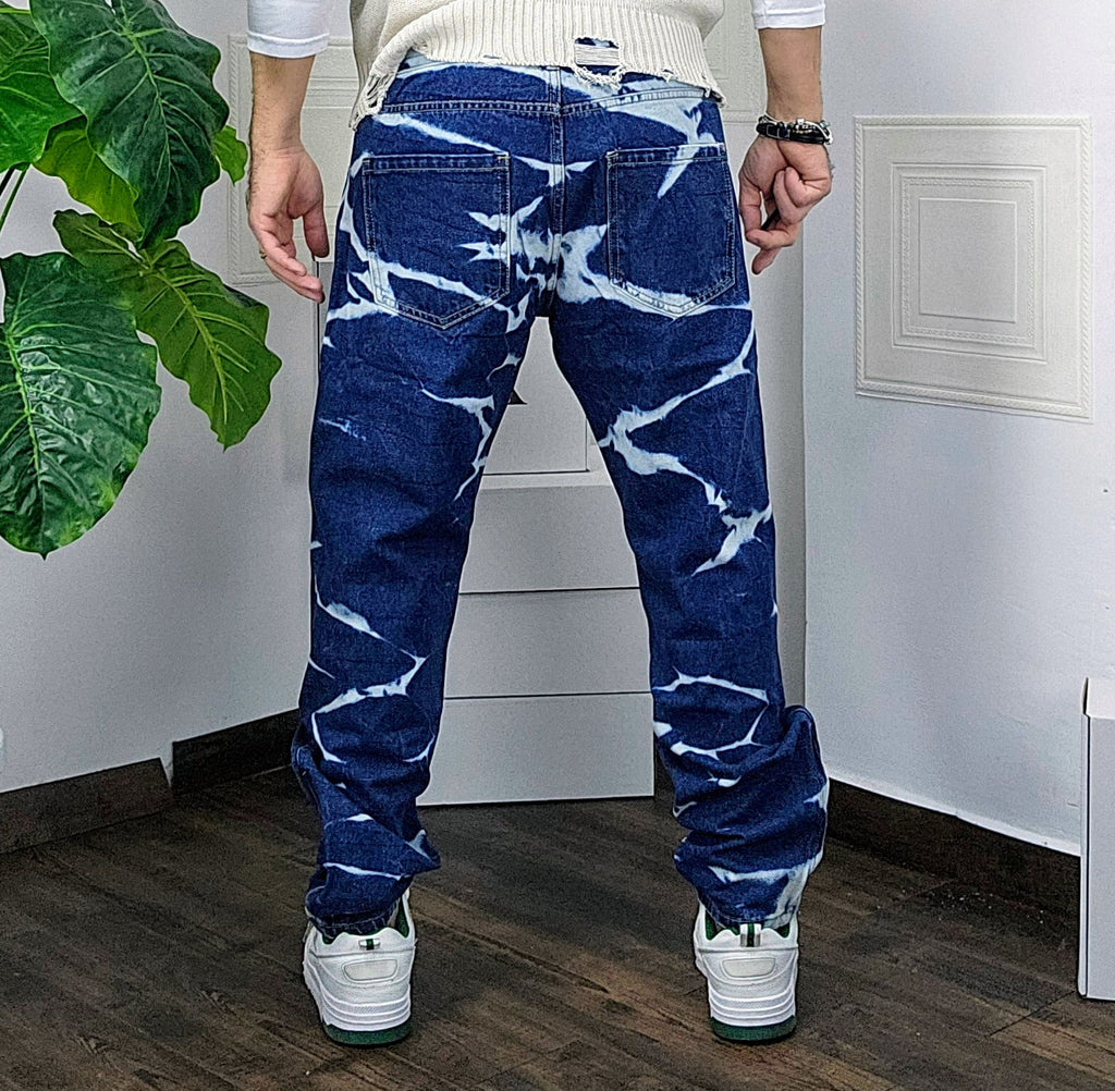Jeans vestibilità comoda fondo regolabile dalla cerniera con rotture foderate lavaggio scambiato dalla 44 alla 52,il modello in foto è alto 1.82x76kg è indossa una taglia 44.Prodotto Made in Italy