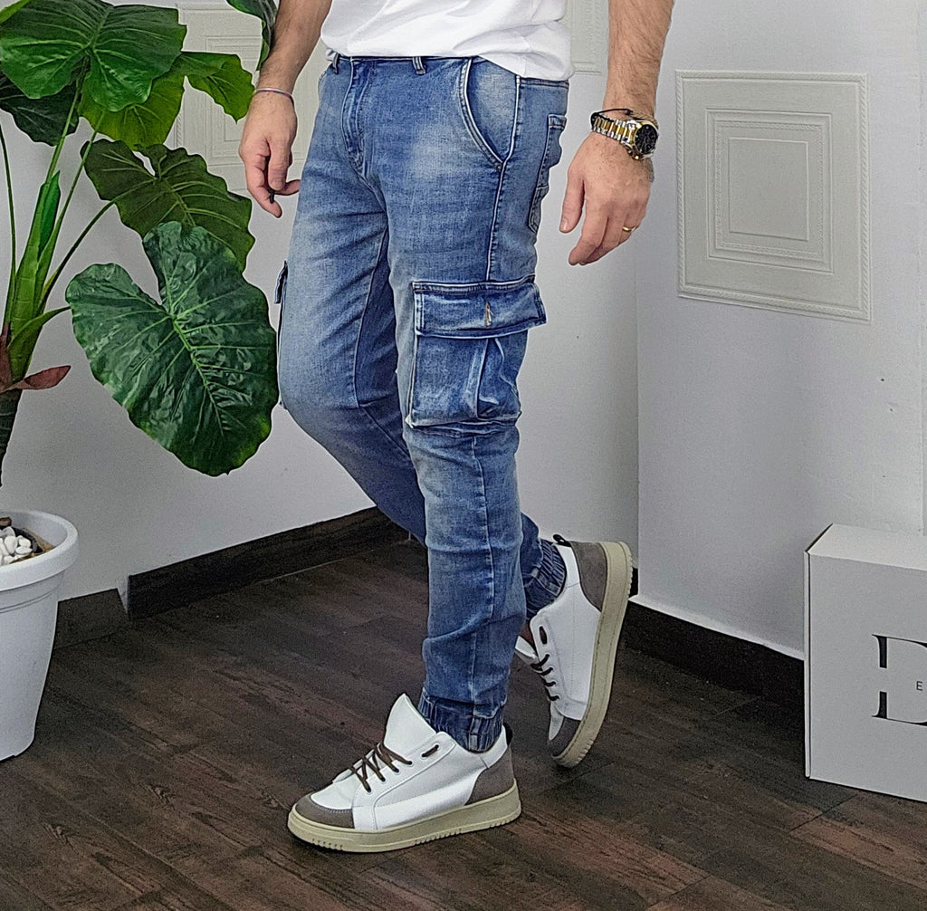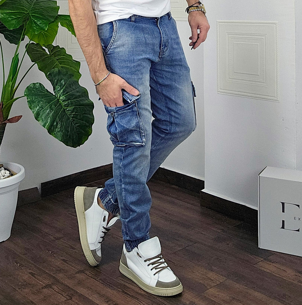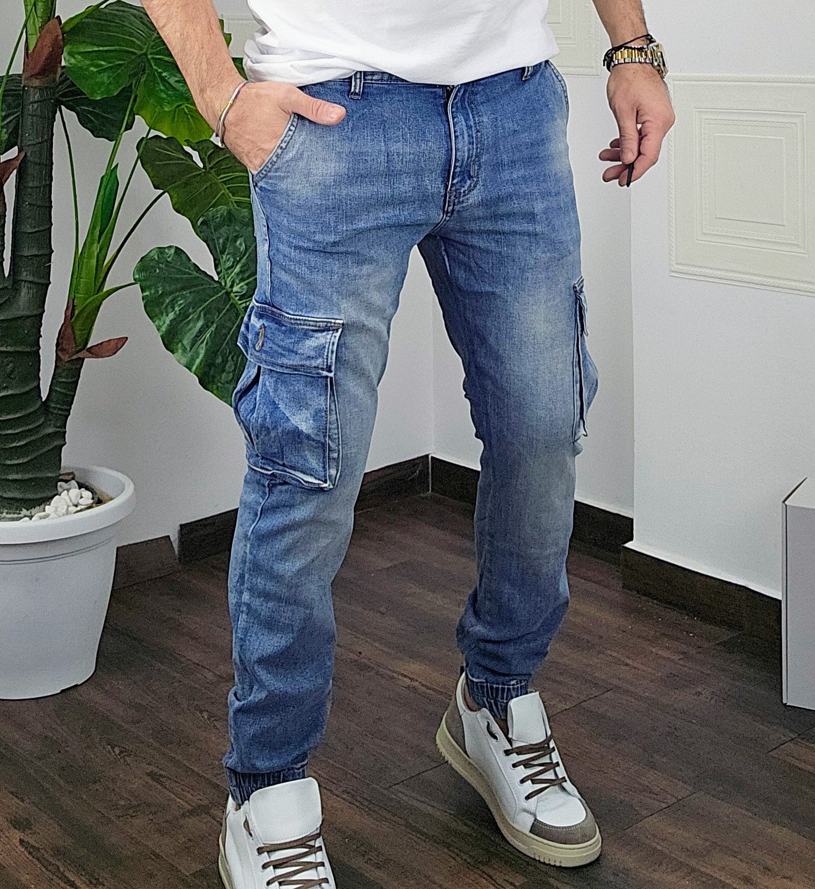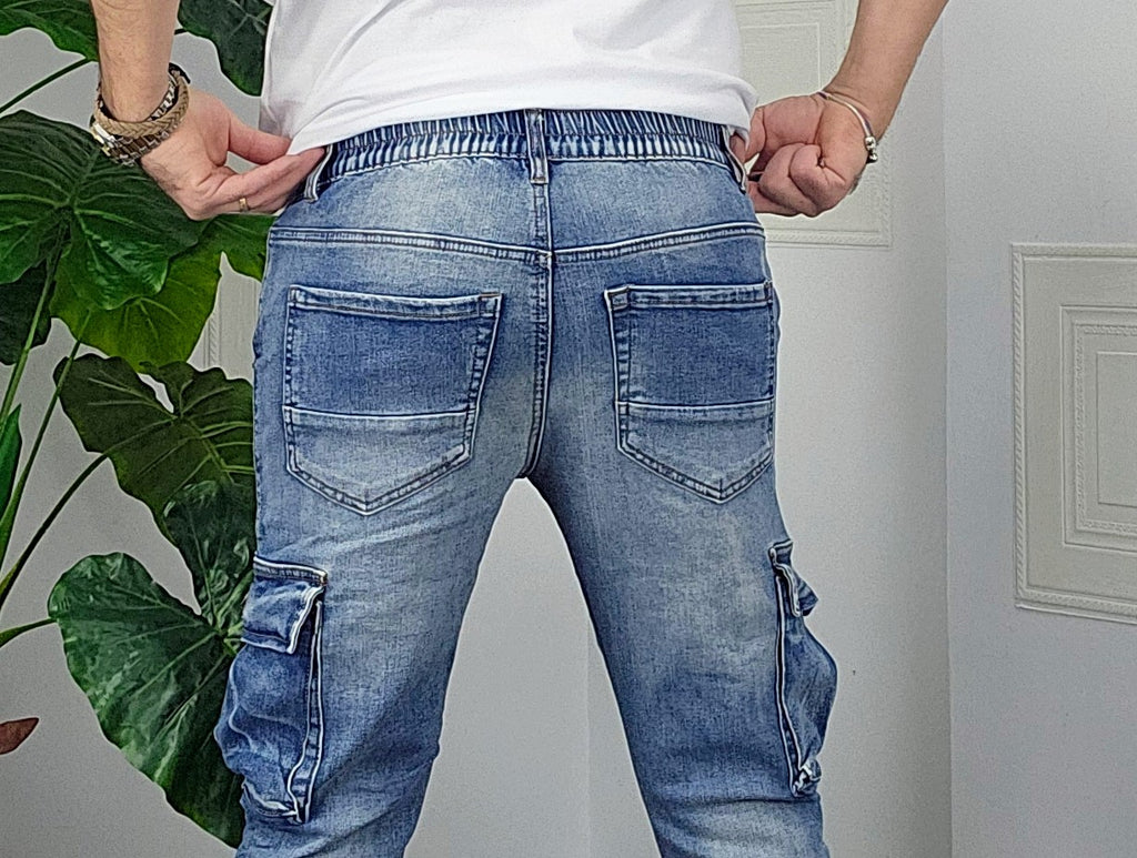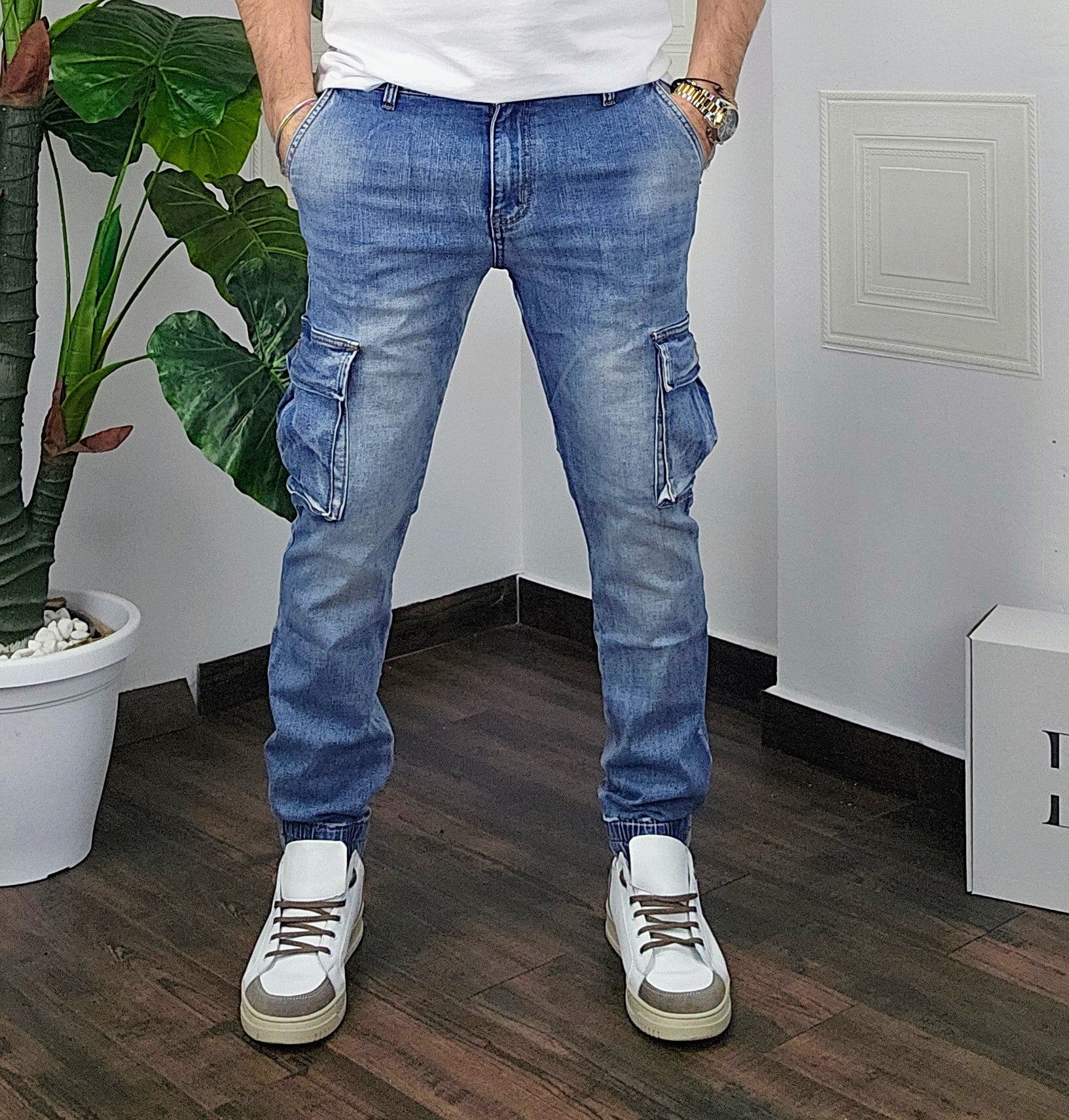 Jeans elastico con 2 tasche America 2 tasche alla gamba elastico alla caviglia elastico fondo schiena dalla 42 alla 52,il modello in foto è alto 1.82x76kg è indossa una taglia 44.Prodotto Made in Italy