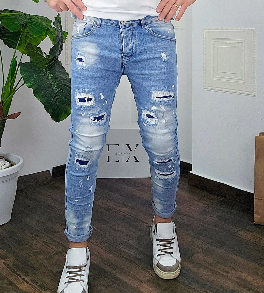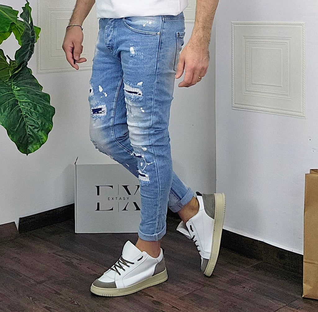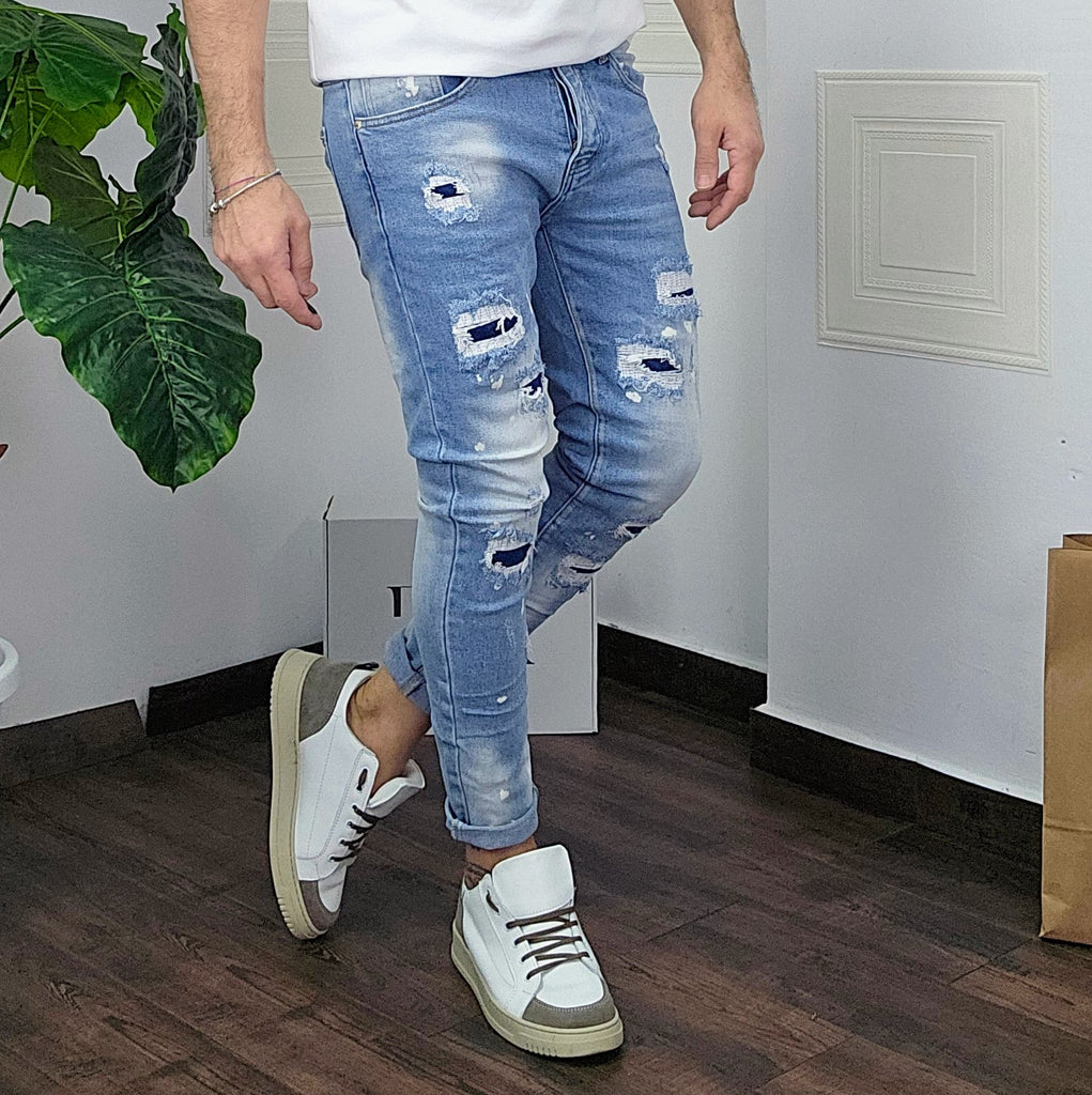 Jeans slim fit capri elastico con strappi foderati ricucire all'esterno foderati dalla 44 alla 52,il modello in foto è alto 1.82x76kg è indossa una taglia 44.Prodotto Made in Italy