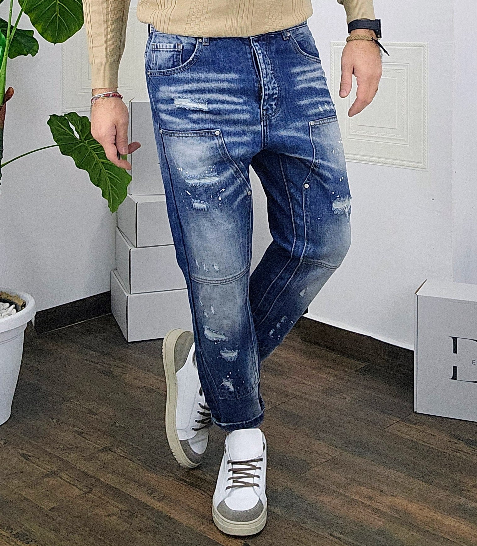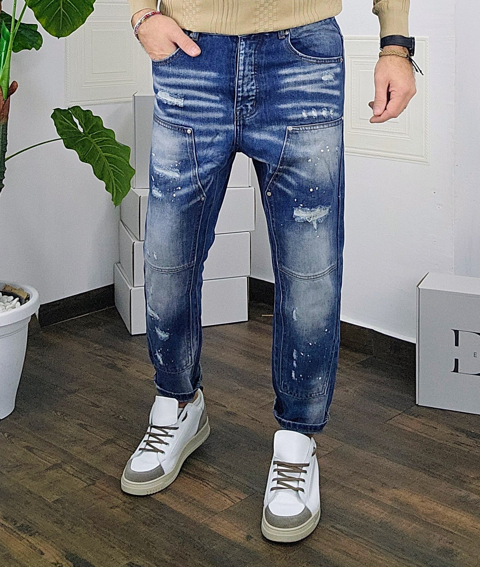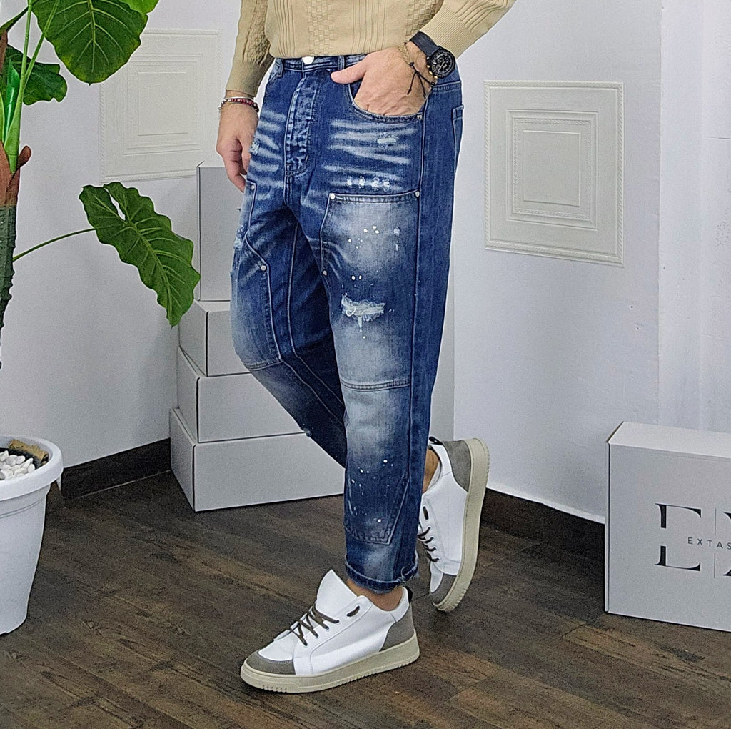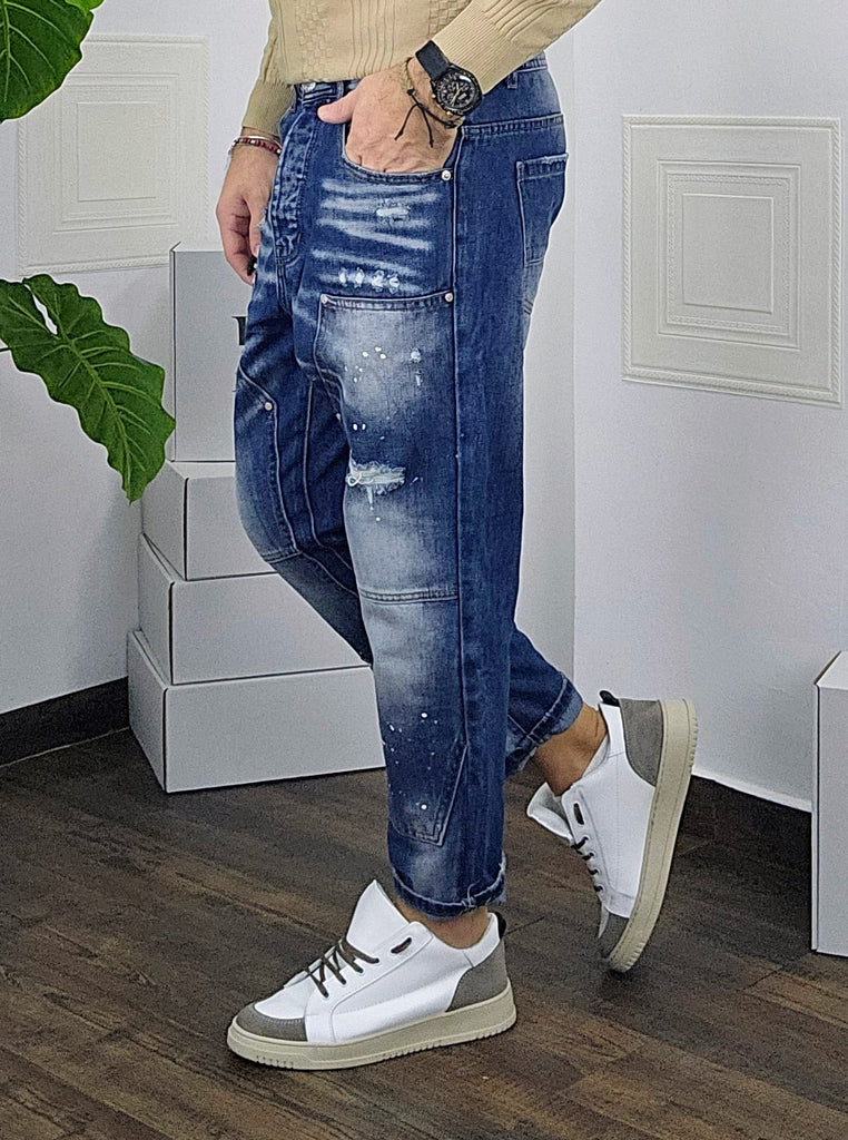 Jeans vestibilità gamba larga capri rottura foderata con micropittura desain a ciappa dalla 44 alla 54,il modello in foto è alto 1.82x76kg è indossa una taglia 46.Prodotto Made in Italy