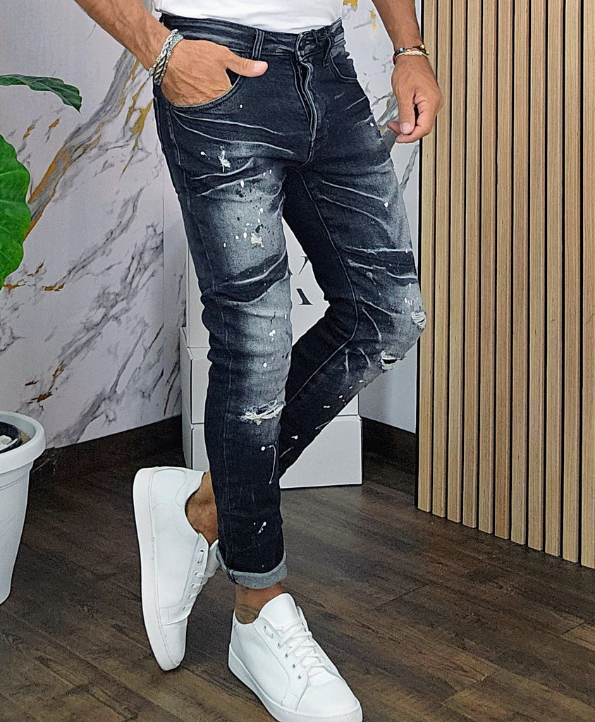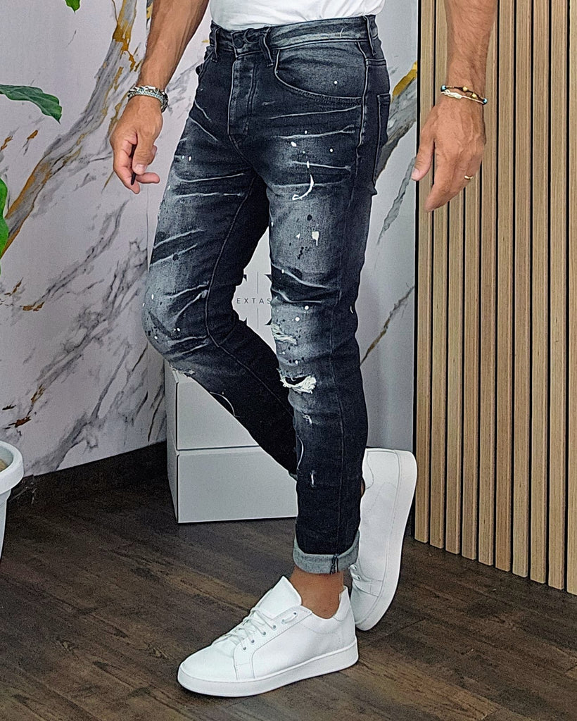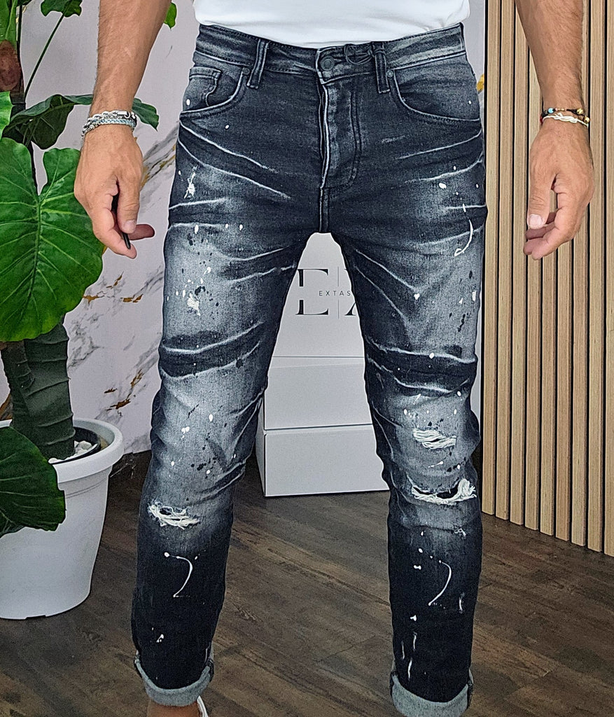 Jeans elastico slim fit con sfumature nere grigio micropittura bianco dalla 42 alla 52,il modello in foto è alto 1.82x76kg è indossa una taglia 44.Prodotto Made in Italy