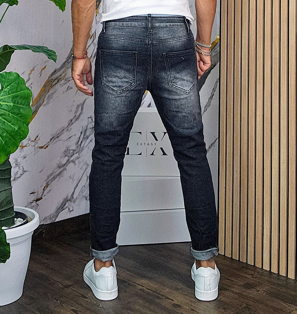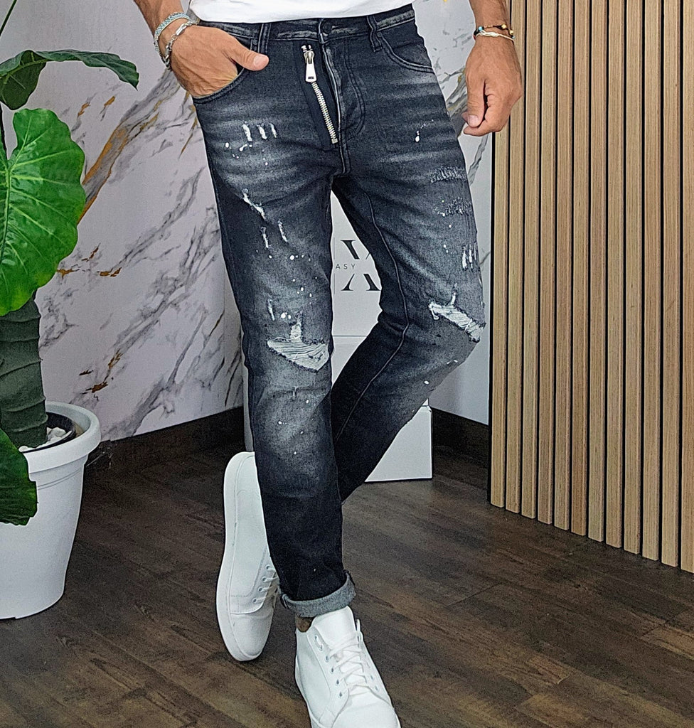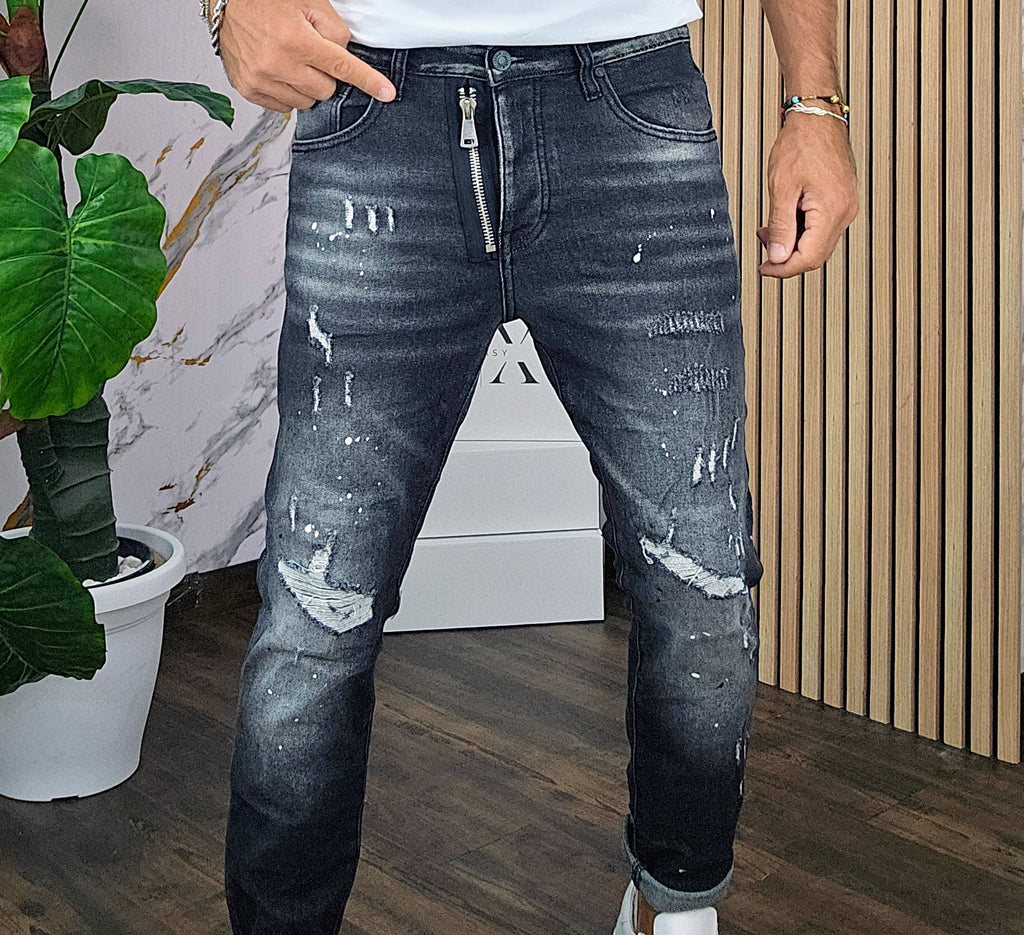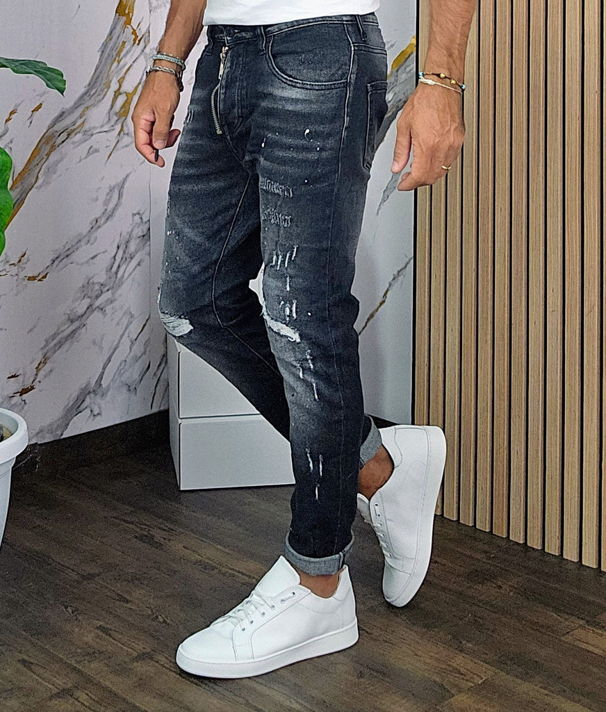 Jeans elastico slim fit con cerniera laterale con strappi a Laser schizzi pitturato bianco dalla 42 alla 52,il modello in foto è alto 1.82x76kg è indossa una taglia 46.Prodotto Made in Italy