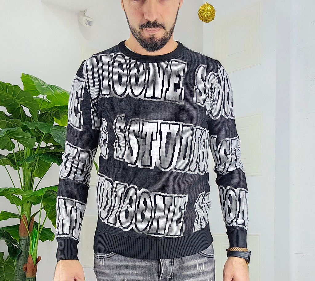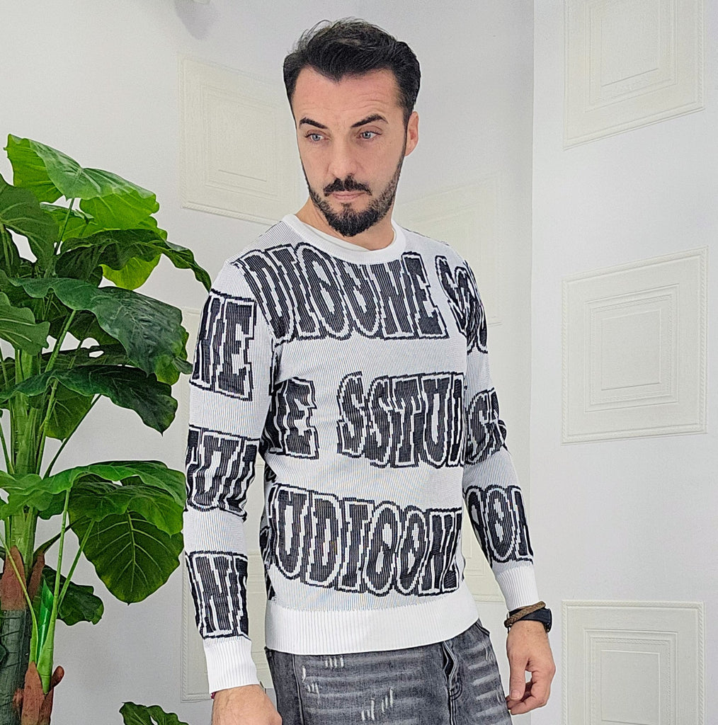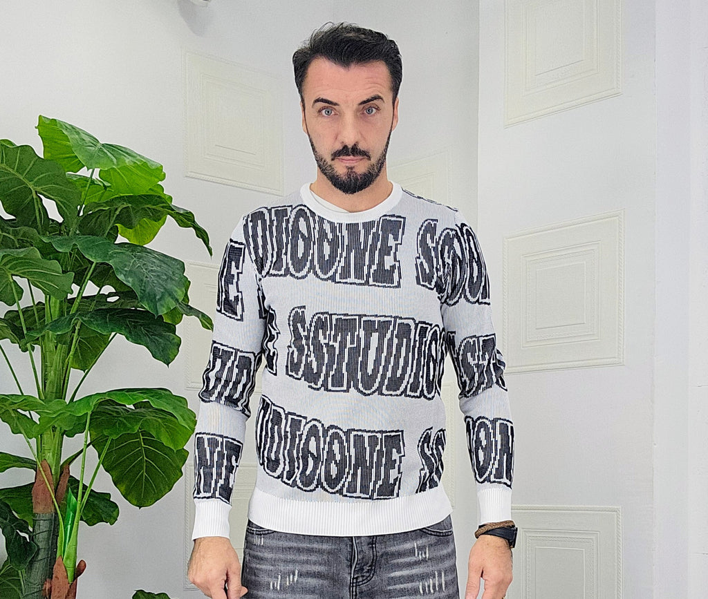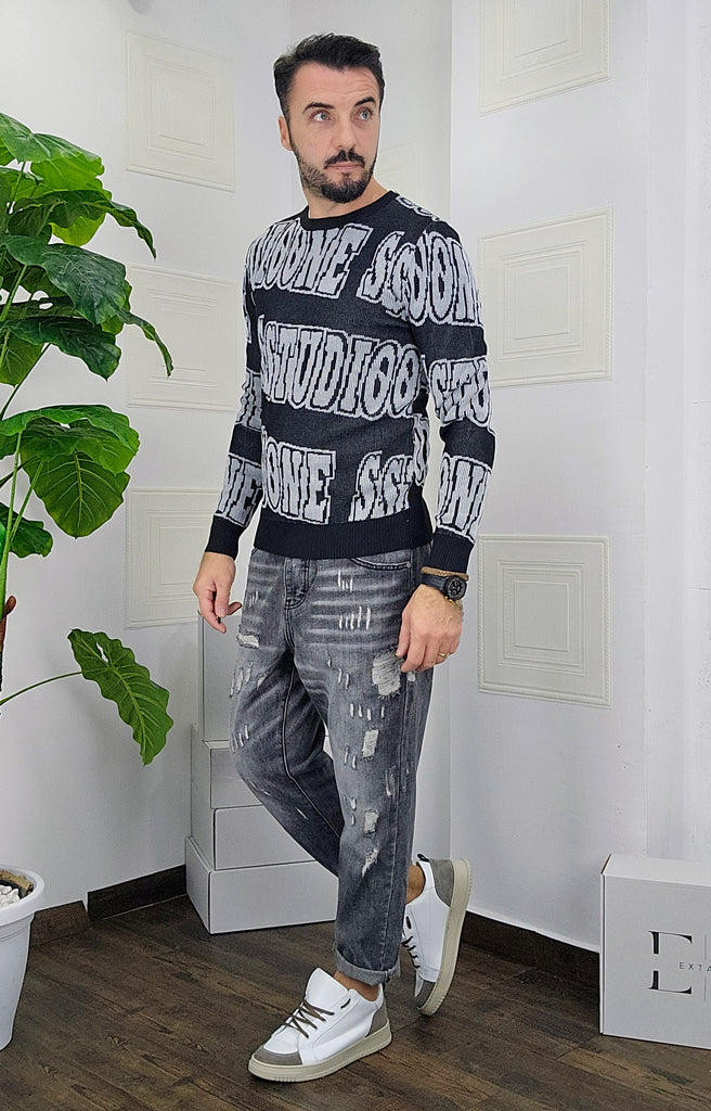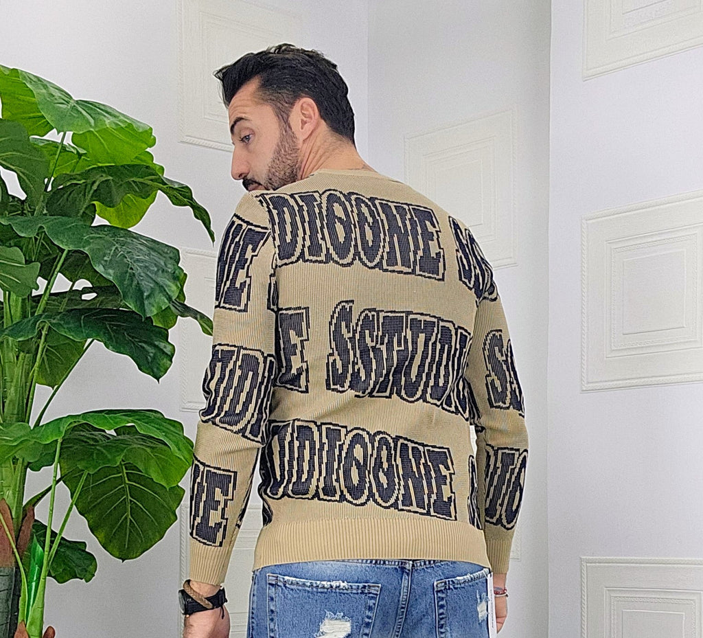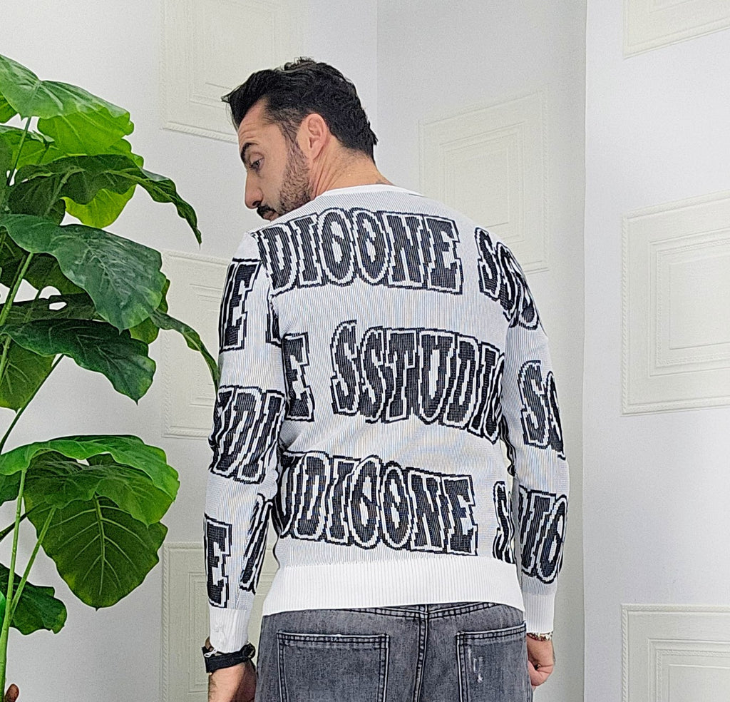 Maglione slim fit con scitte tessuto su tessuto in contrasto dalla M alla XXL, il modello in foto è alto 1.82x76kg è indossa una taglia M.Prodotto Made in Italy