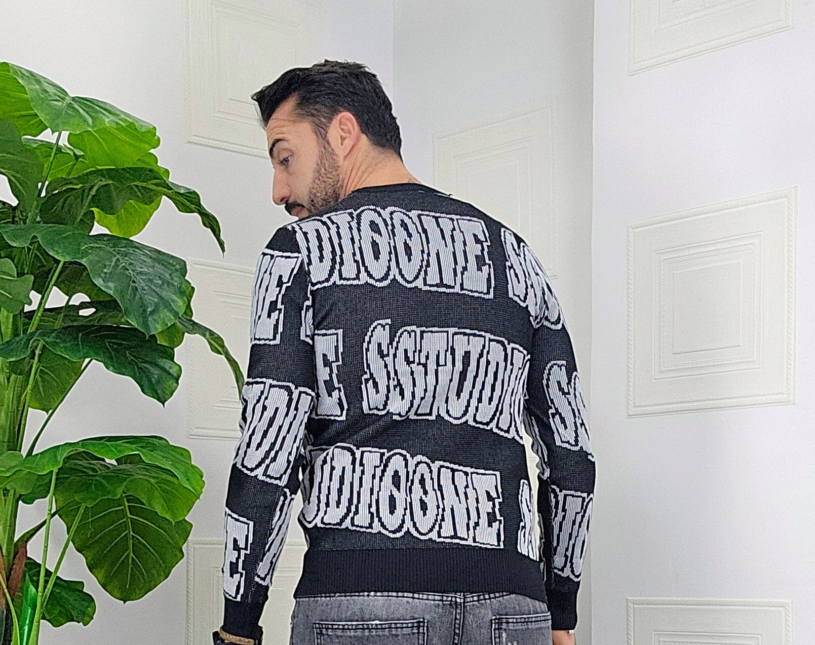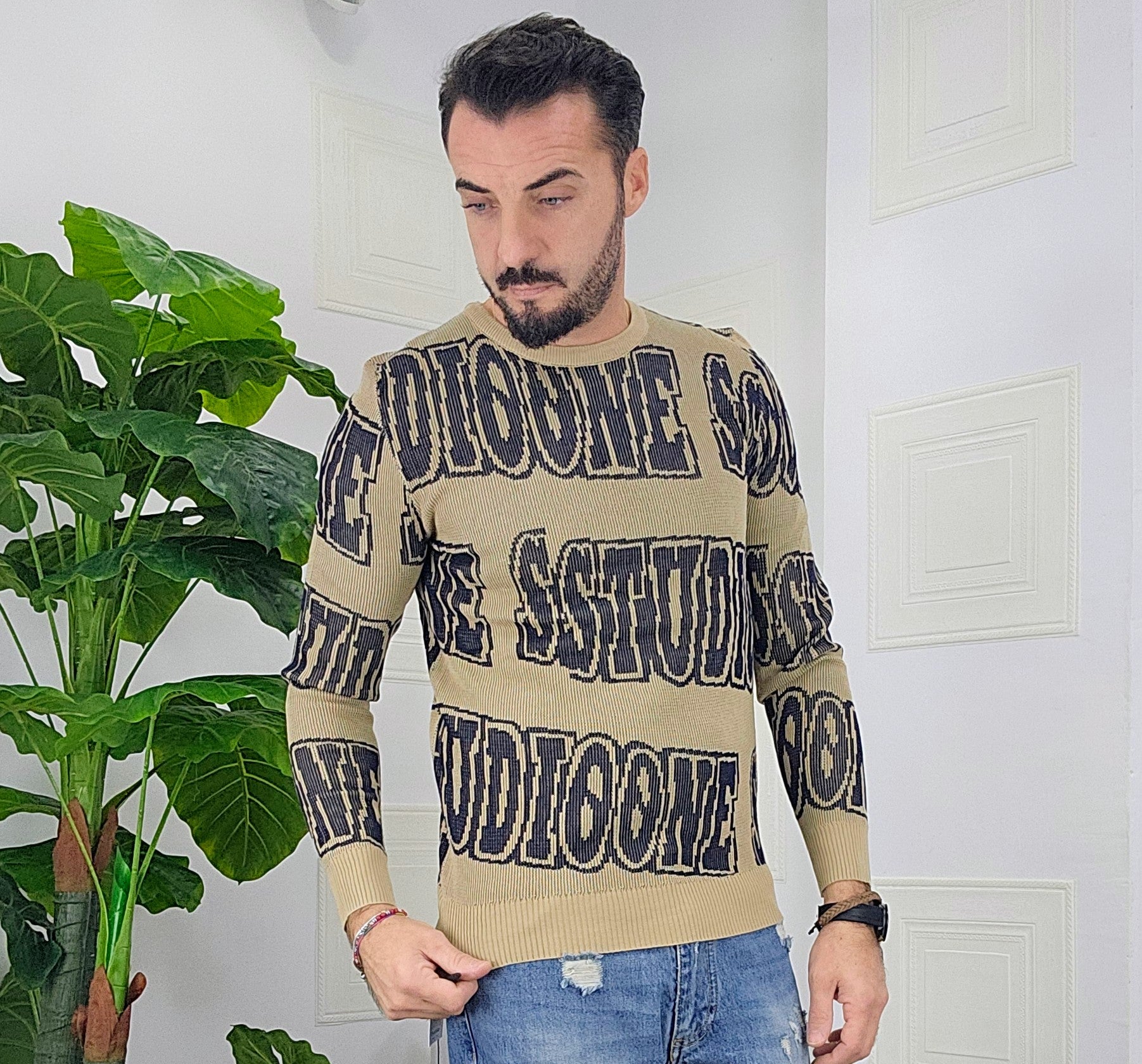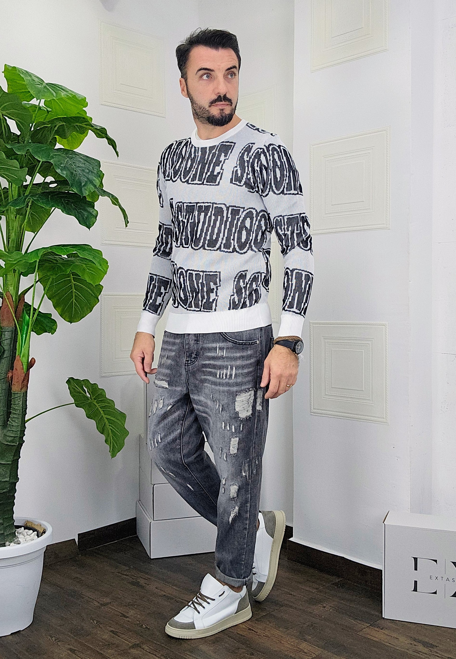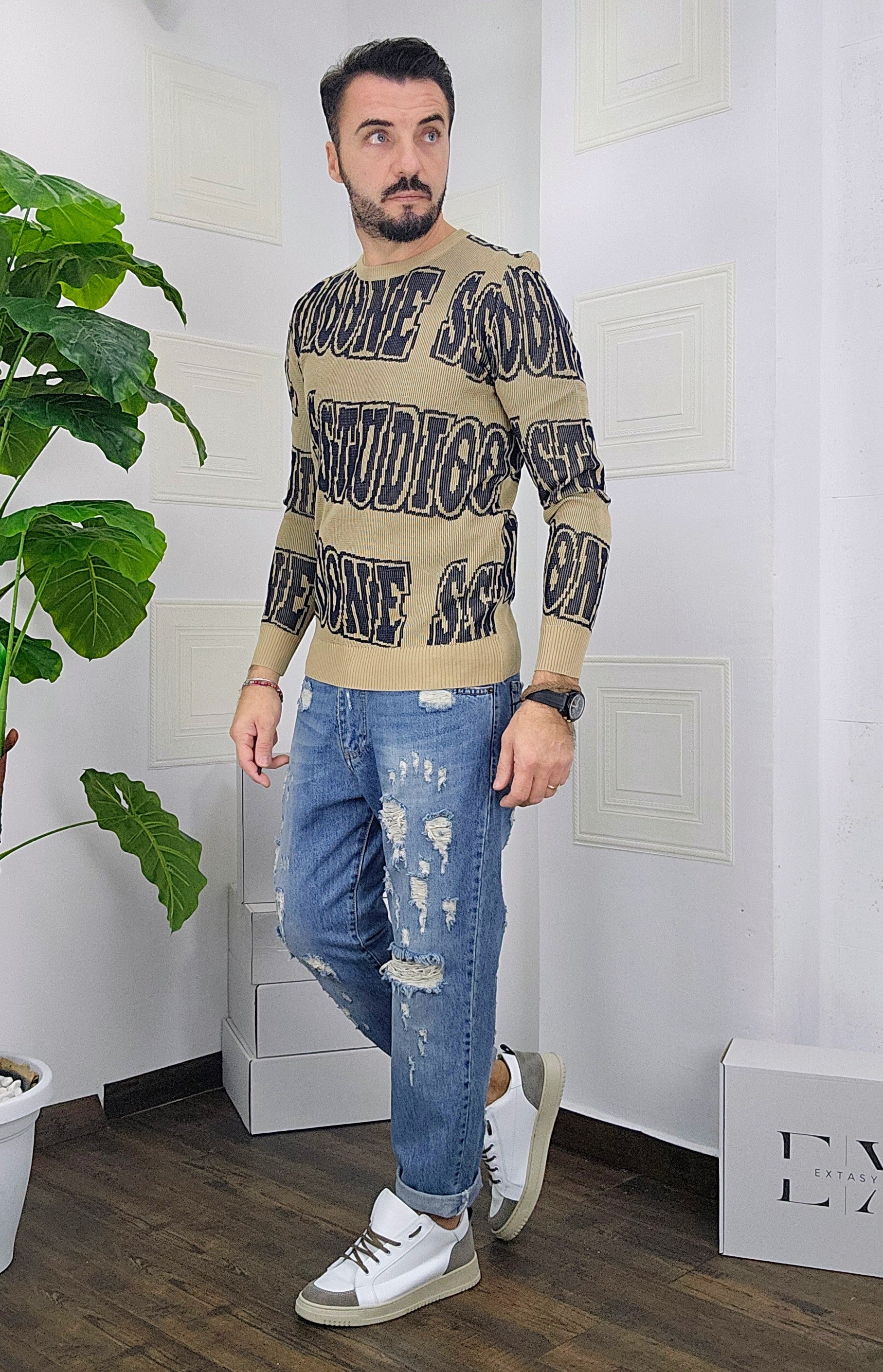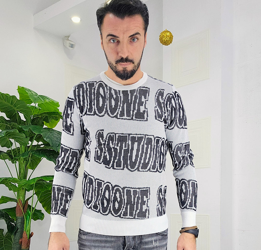Maglione slim fit con scitte tessuto su tessuto in contrasto dalla M alla XXL, il modello in foto è alto 1.82x76kg è indossa una taglia M.Prodotto Made in Italy
