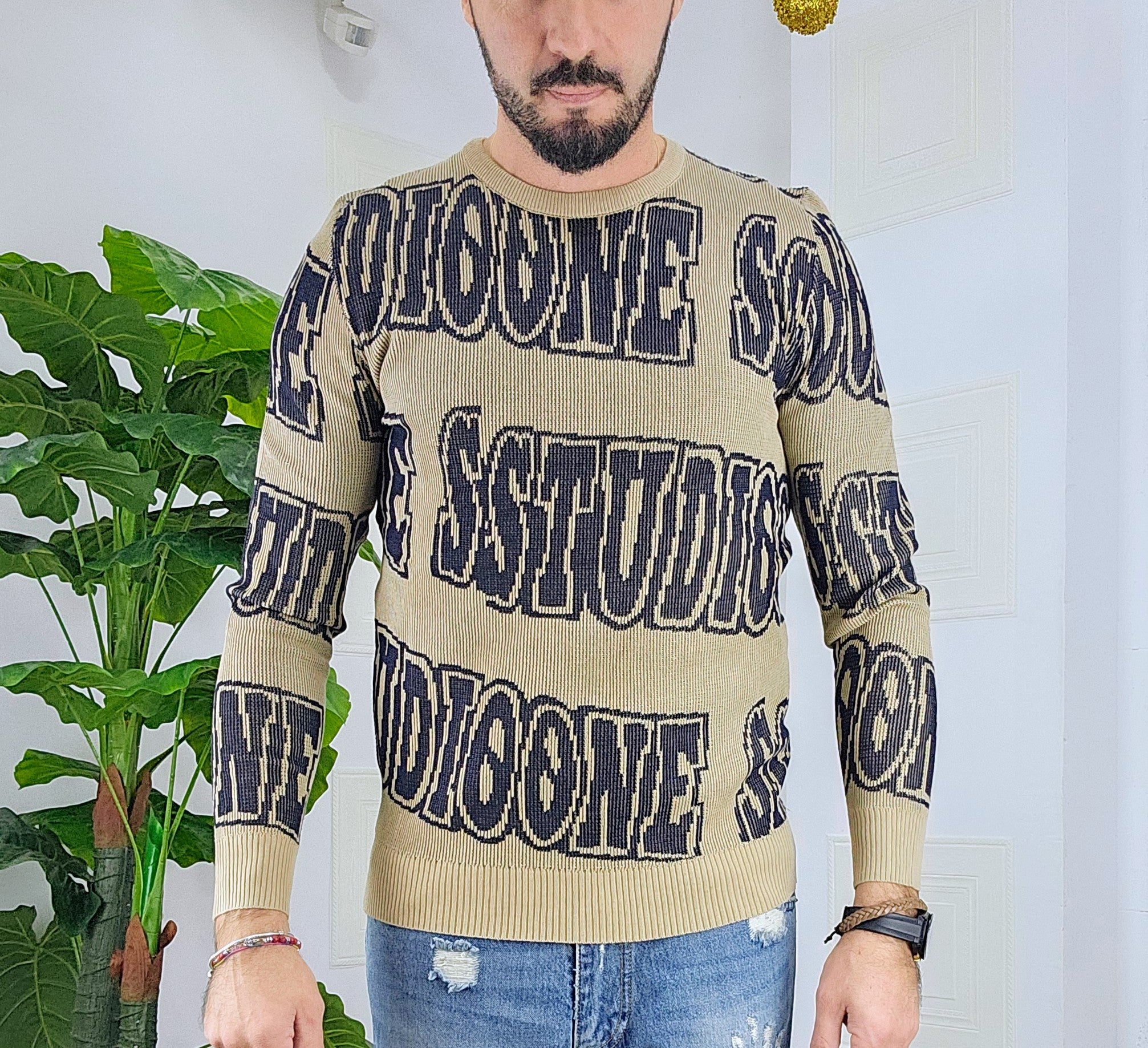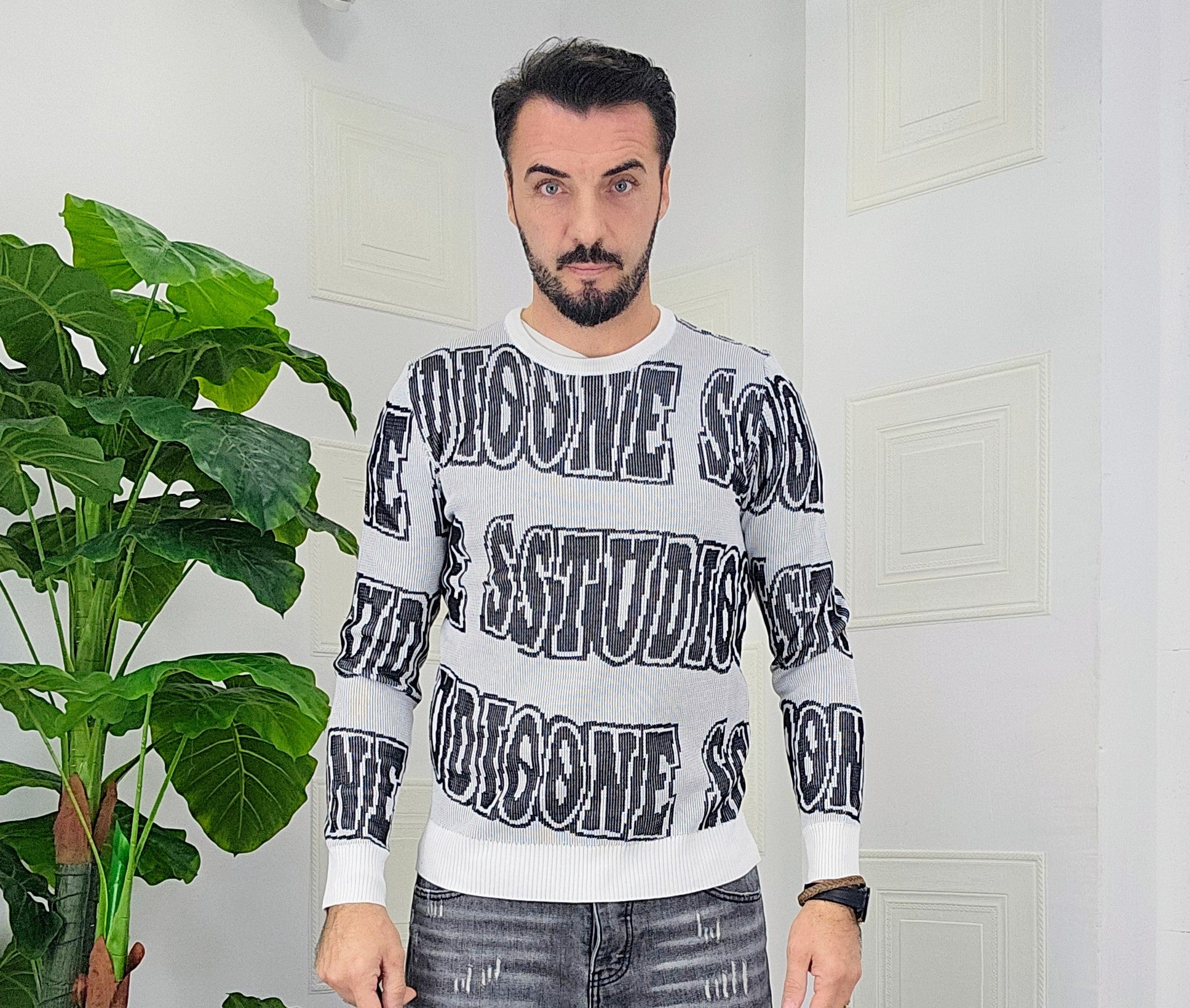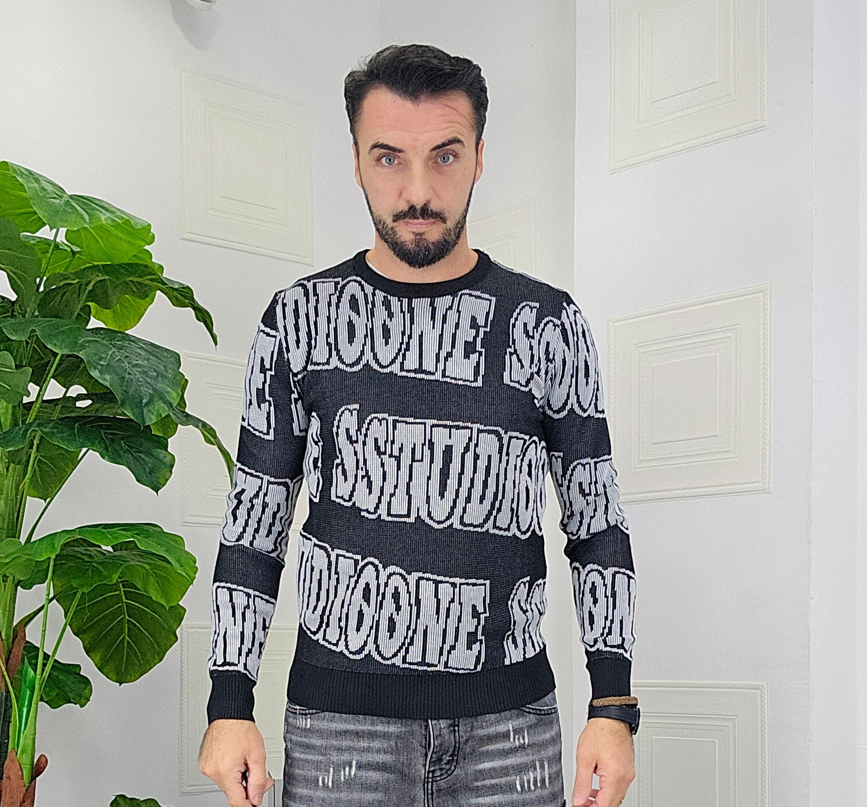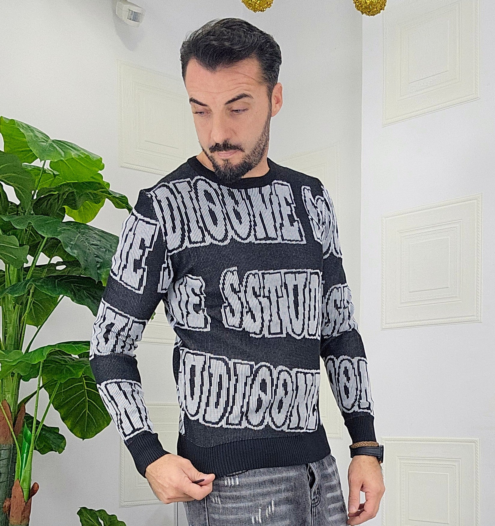 Maglione slim fit con scitte tessuto su tessuto in contrasto dalla M alla XXL, il modello in foto è alto 1.82x76kg è indossa una taglia M.Prodotto Made in Italy