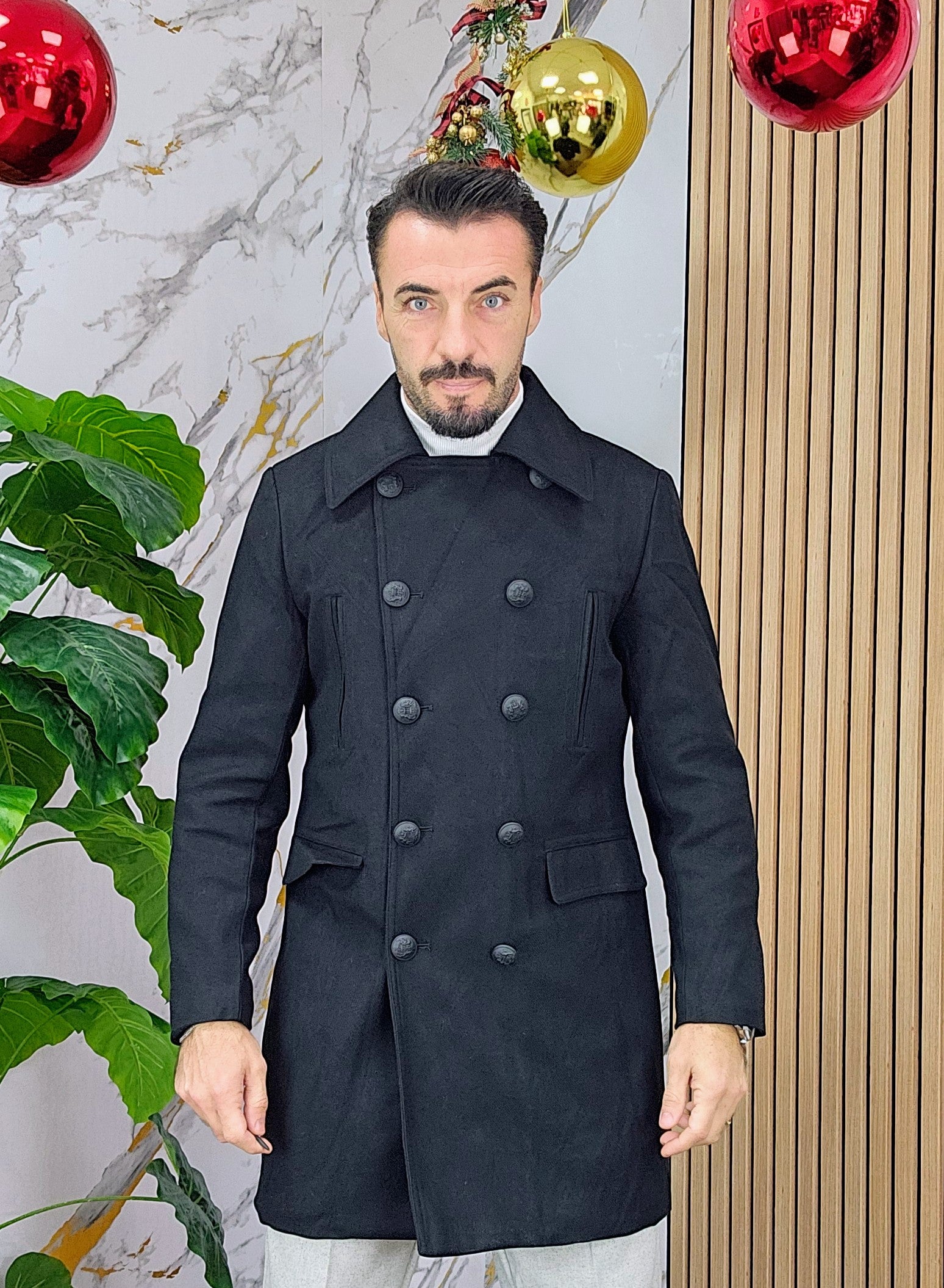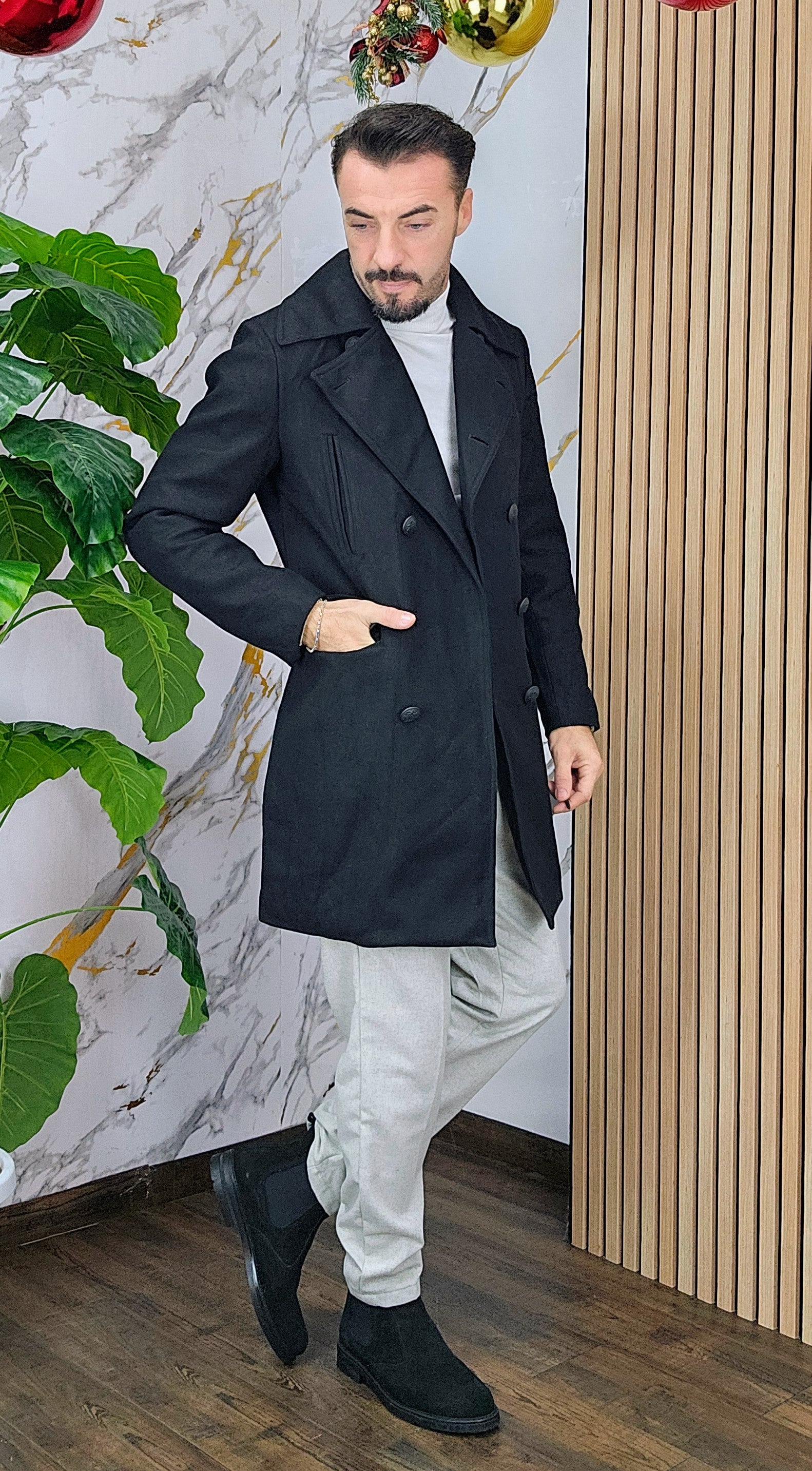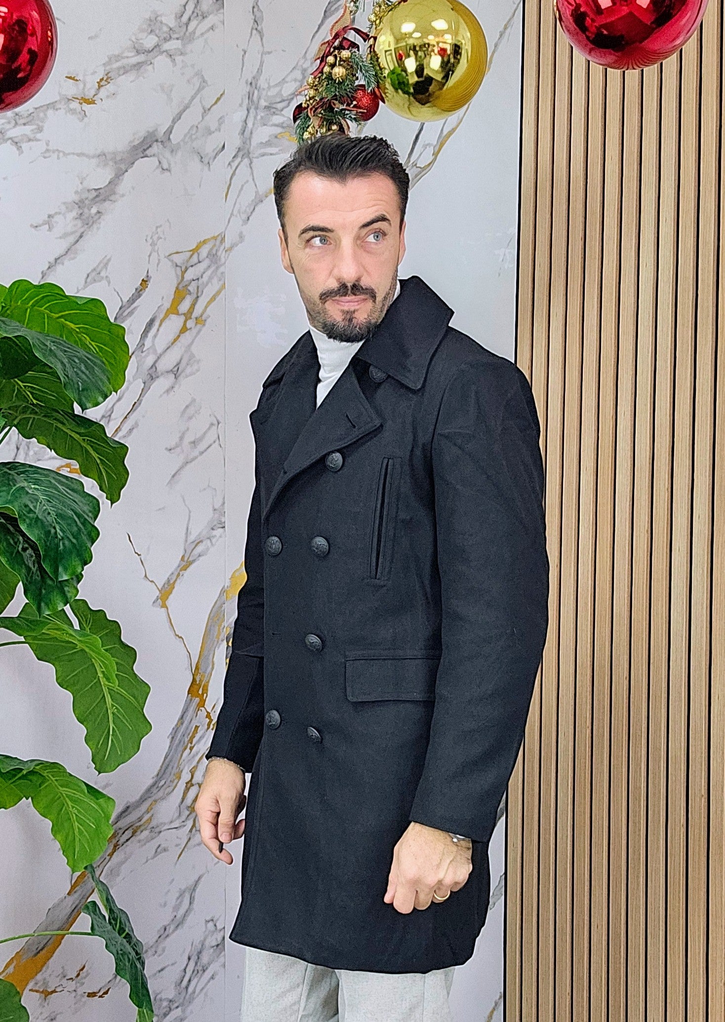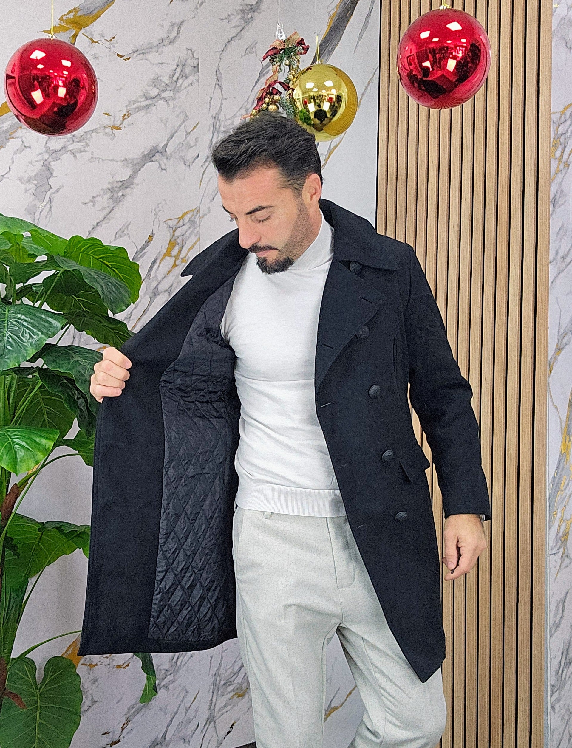 Cappotto doppio petto slim fit trapuntato all'interno foderato chiusura a 8 bottoni in metallo 2 tasche al petto 2 tasche laterali dalla S alla XXL, il modello in foto è alto 1.82x76kg è indossa una taglia S.Prodotto Made in Italy