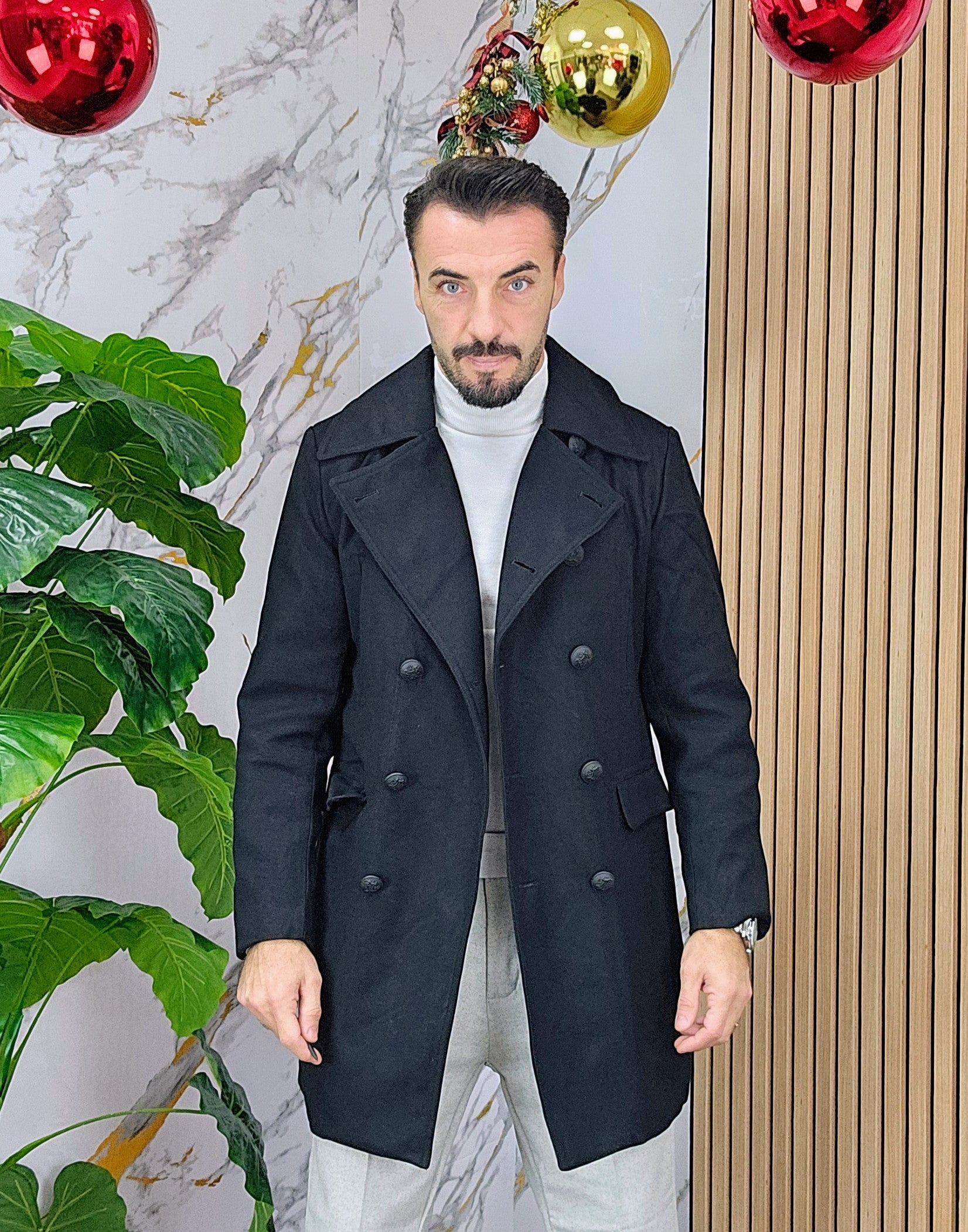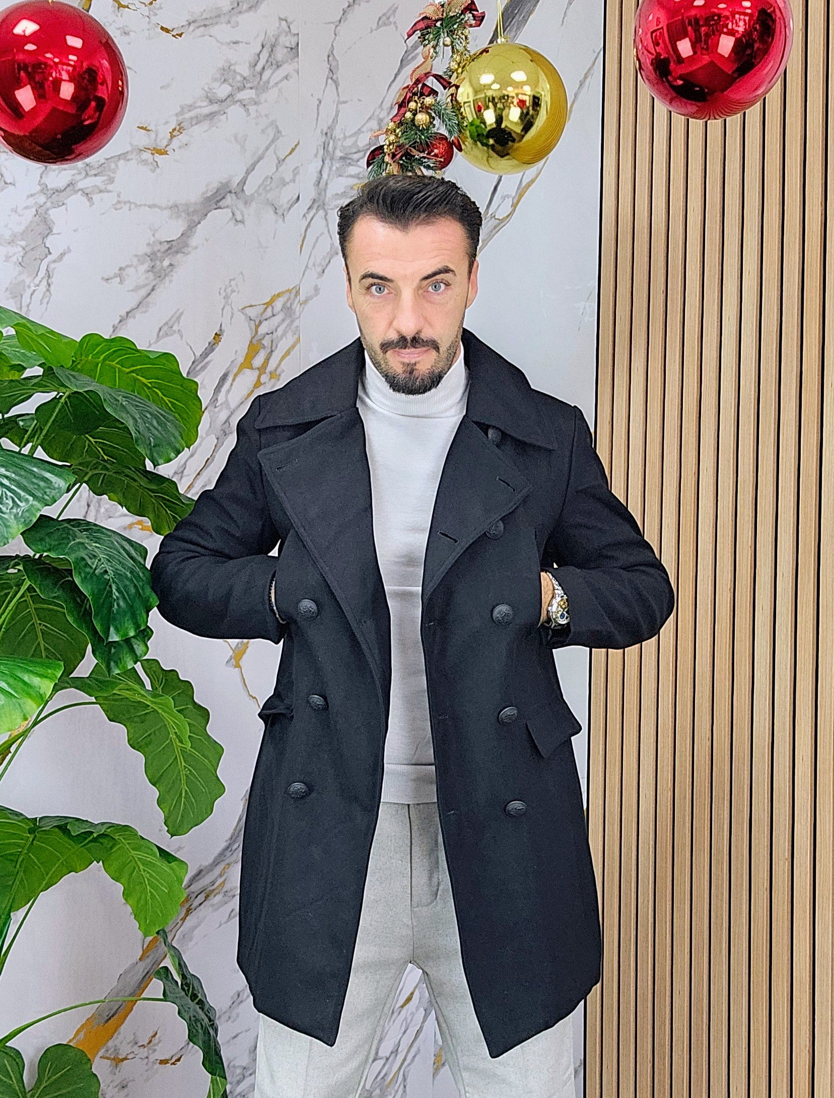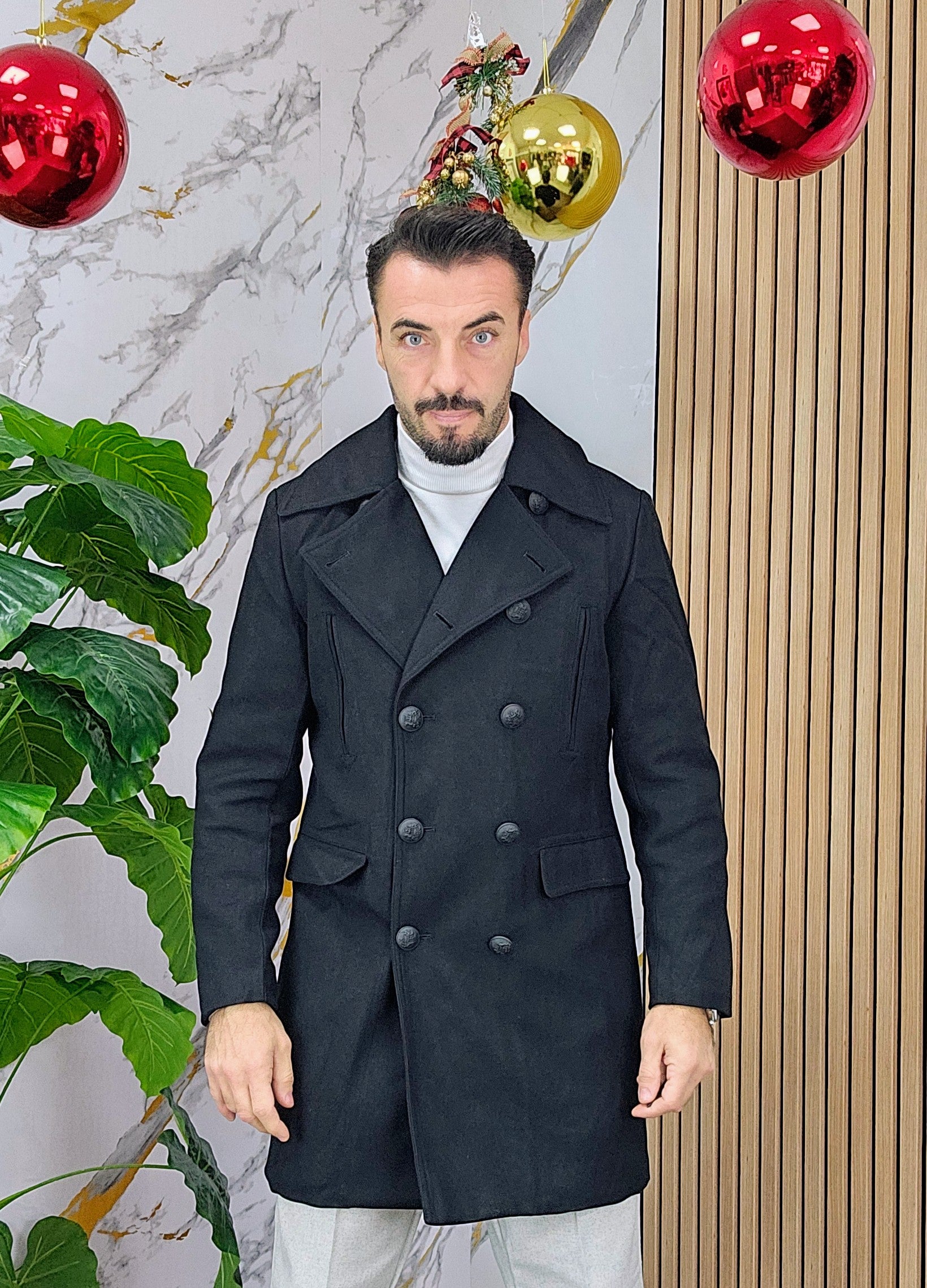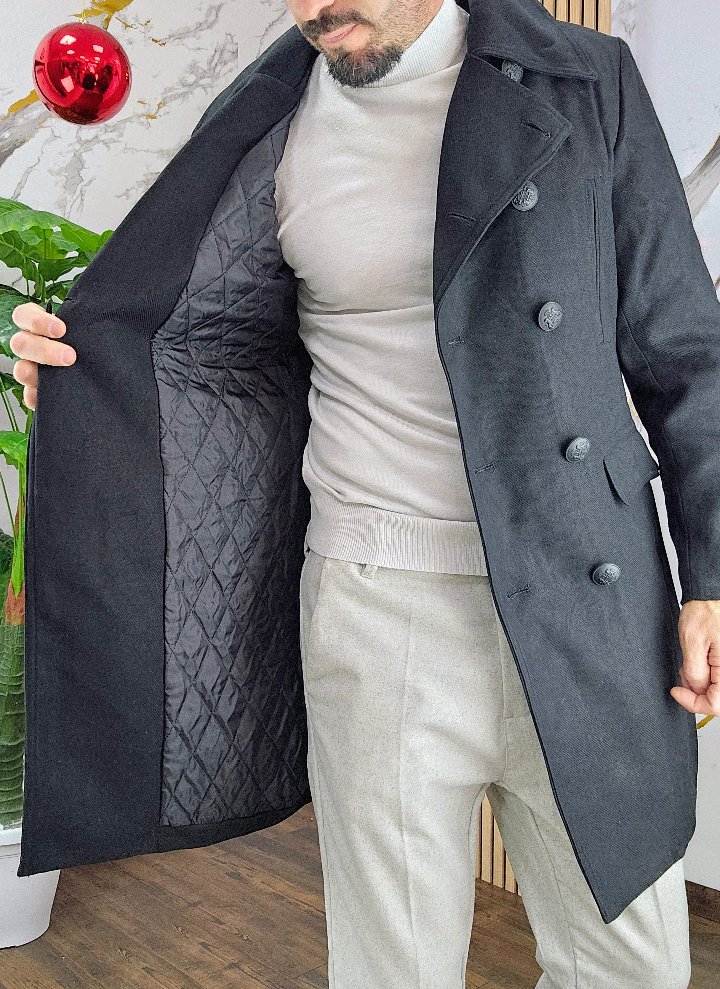 Cappotto doppio petto slim fit trapuntato all'interno foderato chiusura a 8 bottoni in metallo 2 tasche al petto 2 tasche laterali dalla S alla XXL, il modello in foto è alto 1.82x76kg è indossa una taglia S.Prodotto Made in Italy