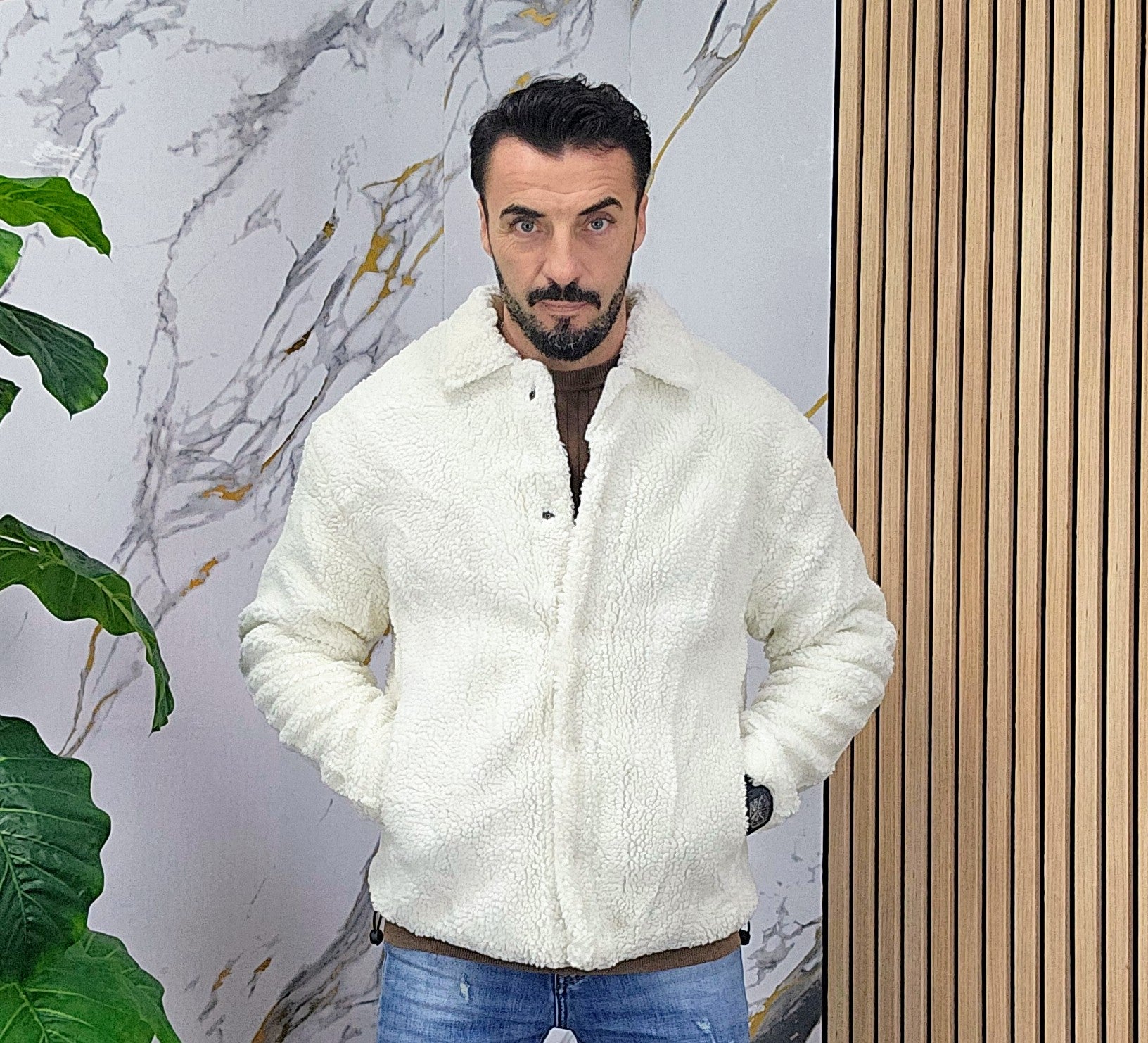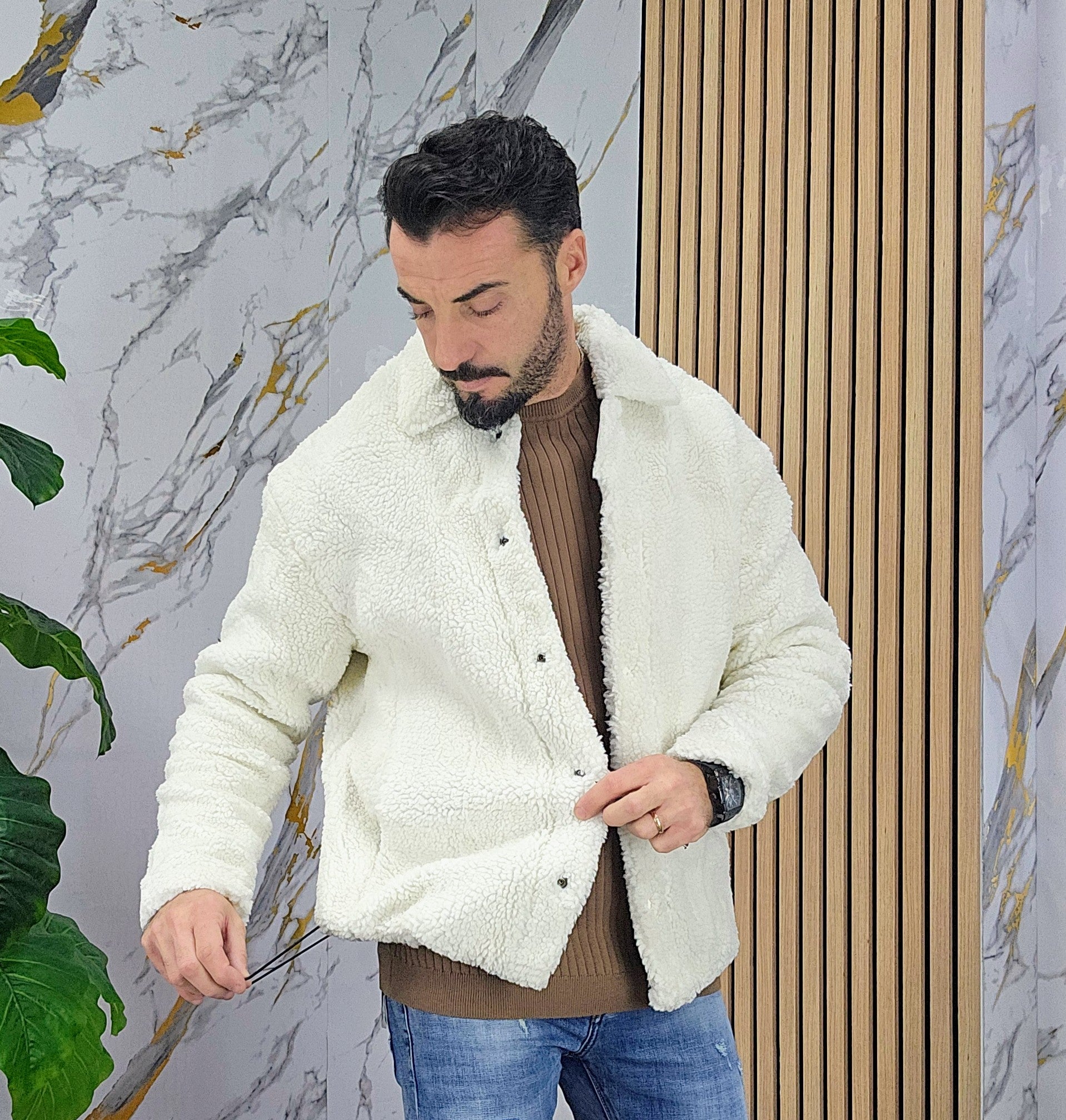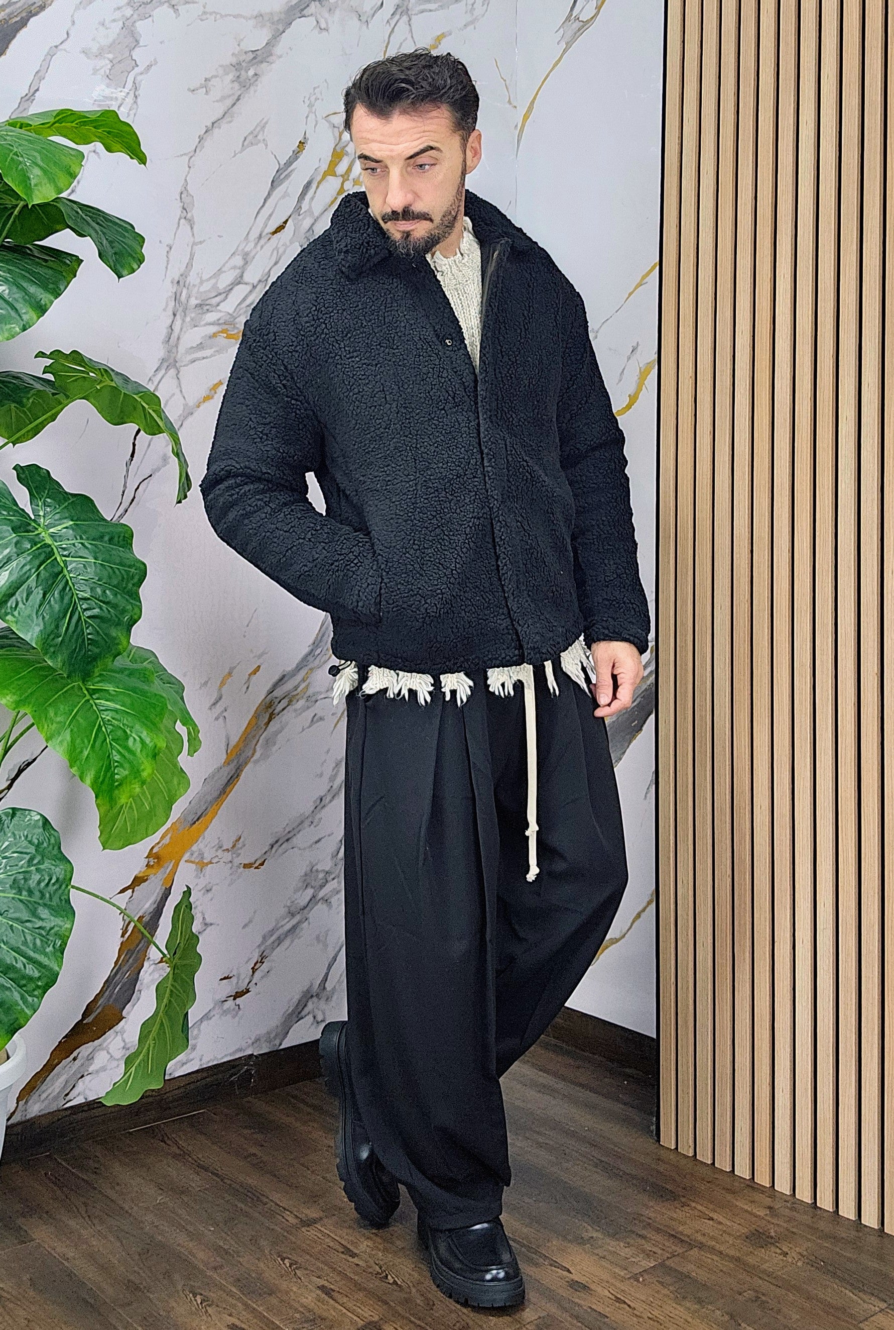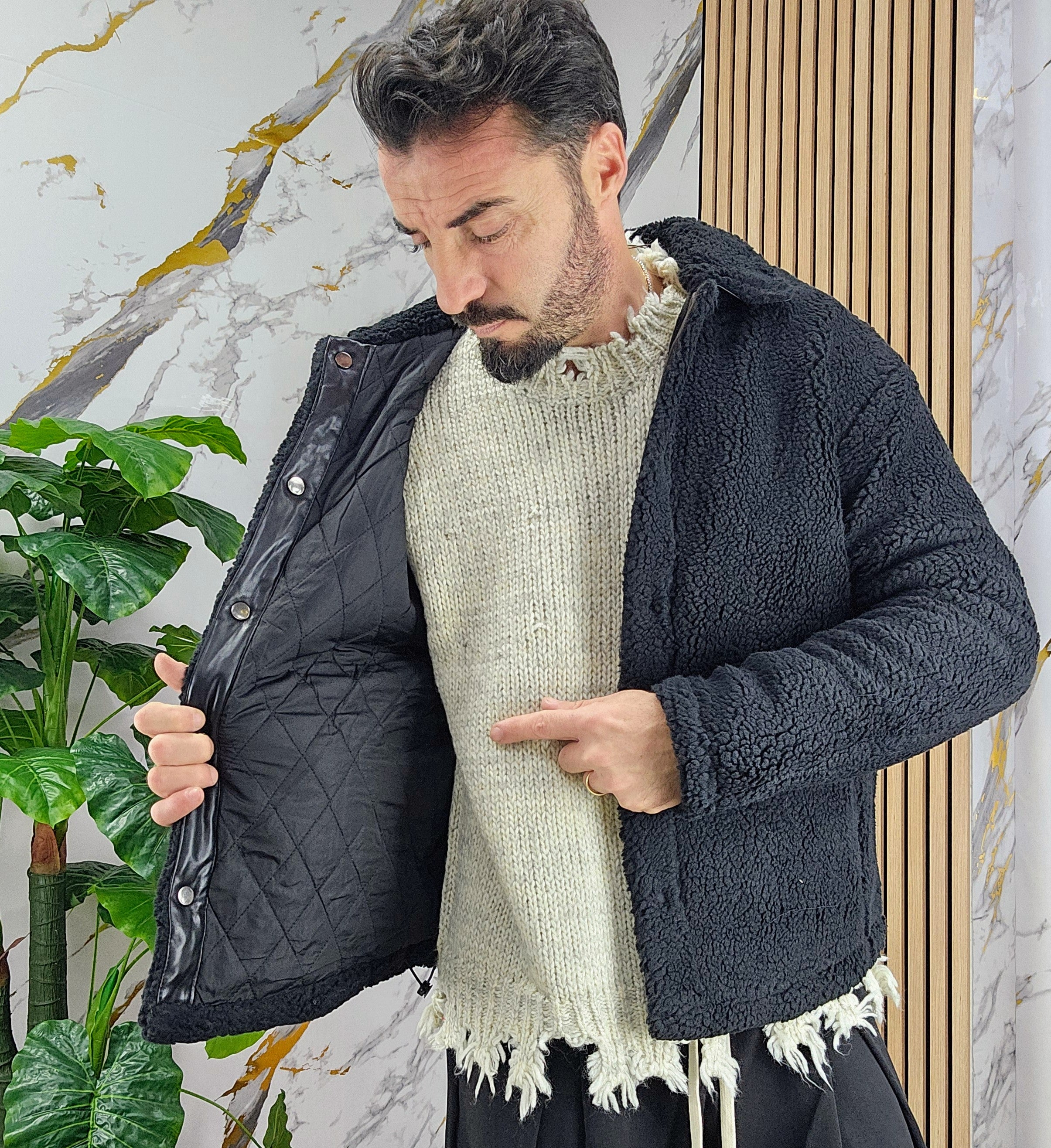 Giubbino tessuto teddy imbottito all'interno chiusura bottoni centrale 2 tasche laterali 2 elastici laterali regolabili dalla S alla XXL, il modello in foto è alto 1.82x76kg è indossa una taglia S.Prodotto Made in Italy