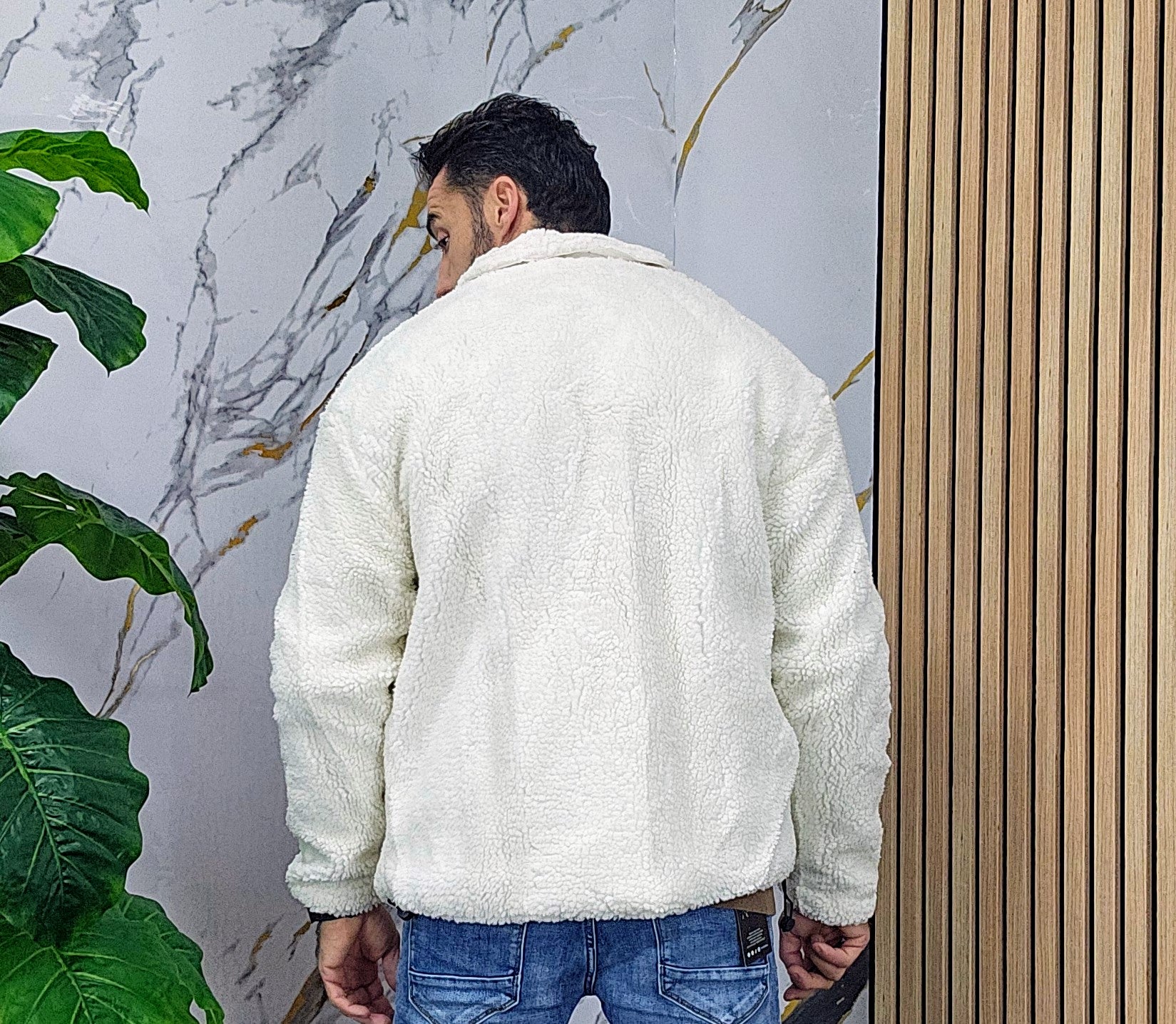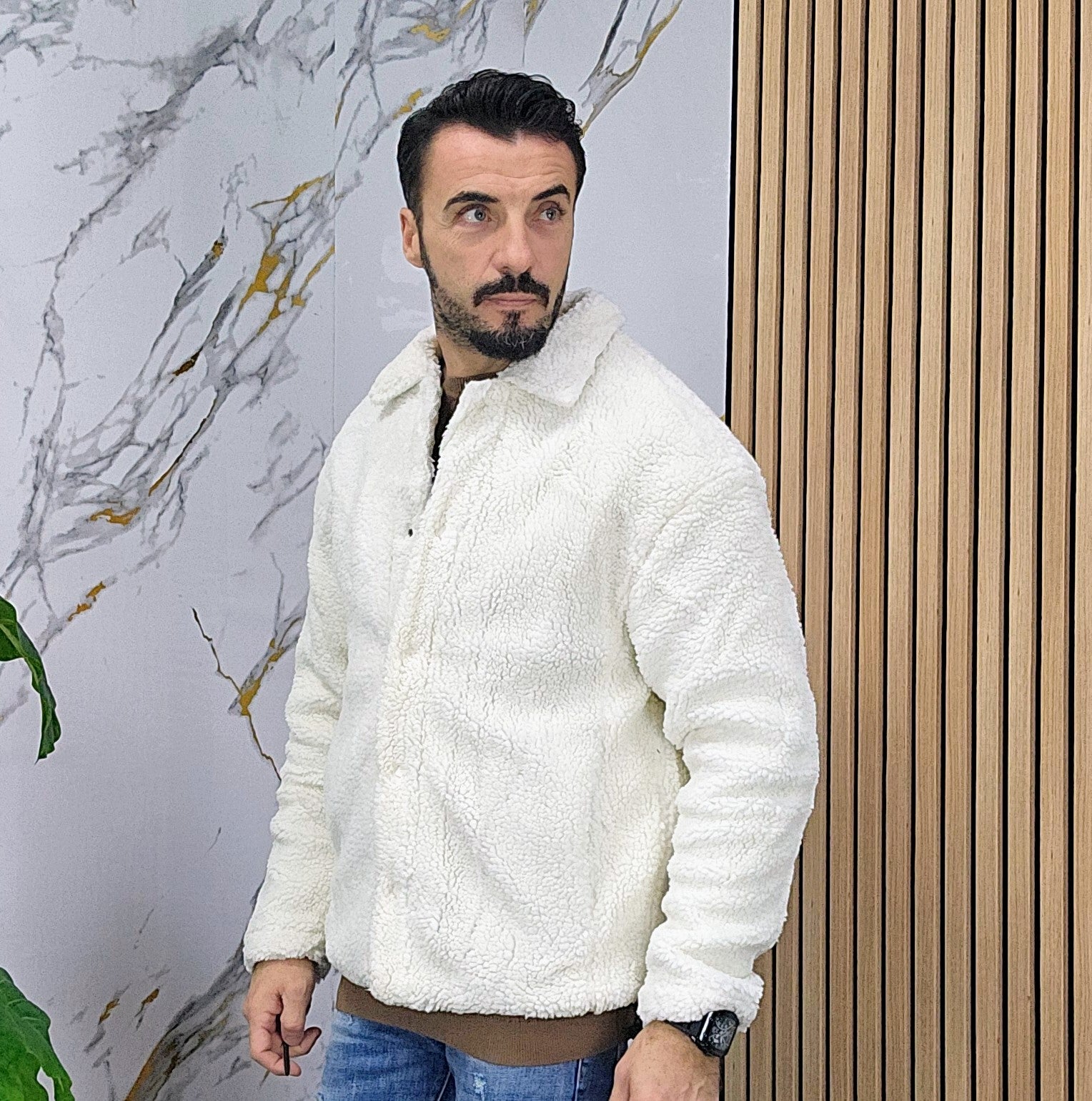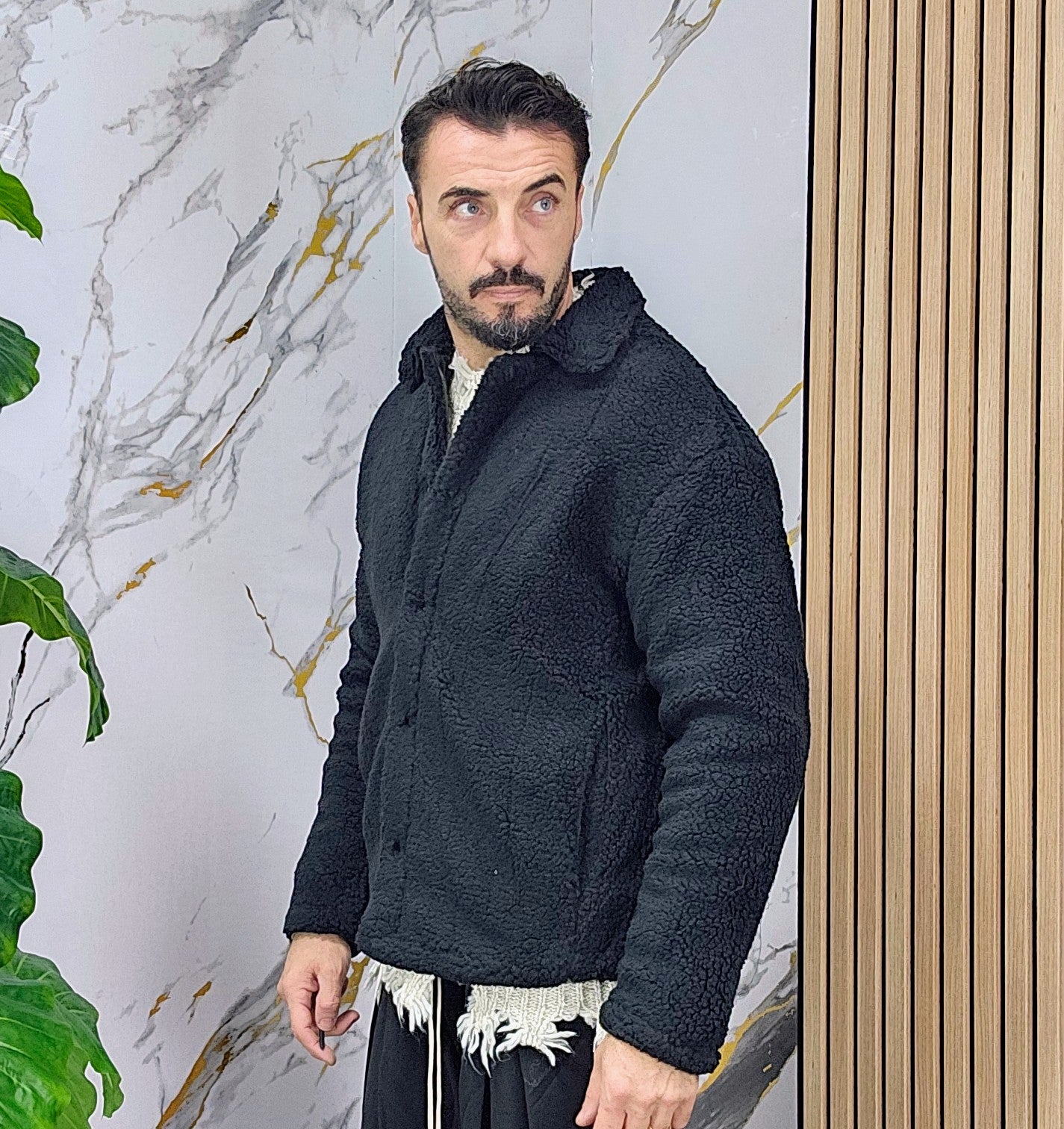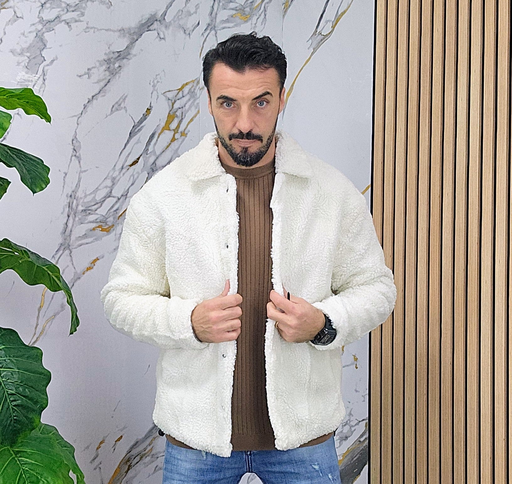 Giubbino tessuto teddy imbottito all'interno chiusura bottoni centrale 2 tasche laterali 2 elastici laterali regolabili dalla S alla XXL, il modello in foto è alto 1.82x76kg è indossa una taglia S.Prodotto Made in Italy