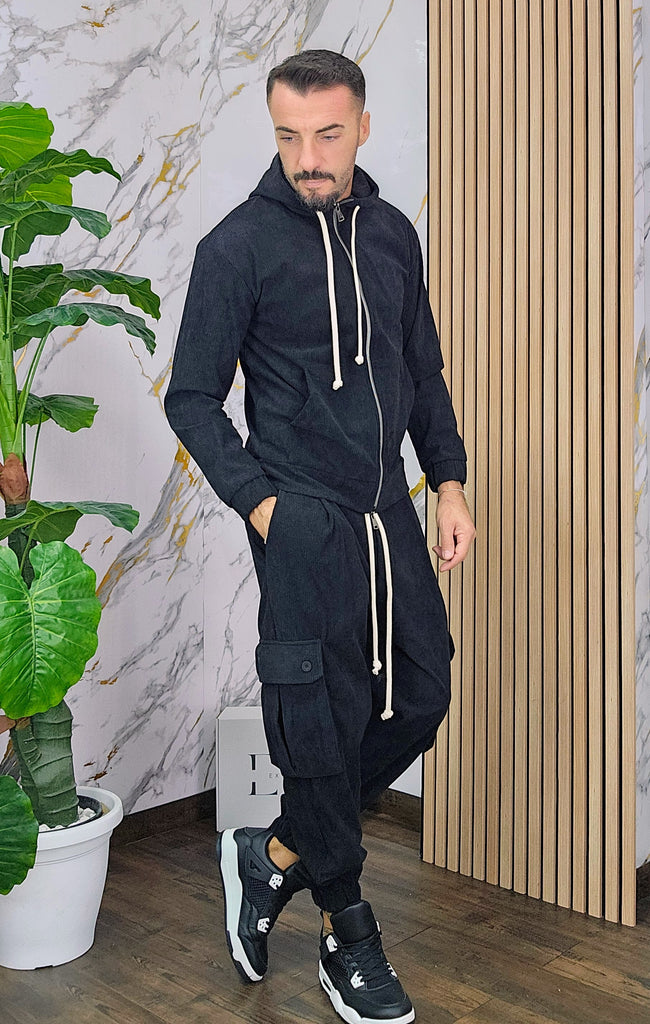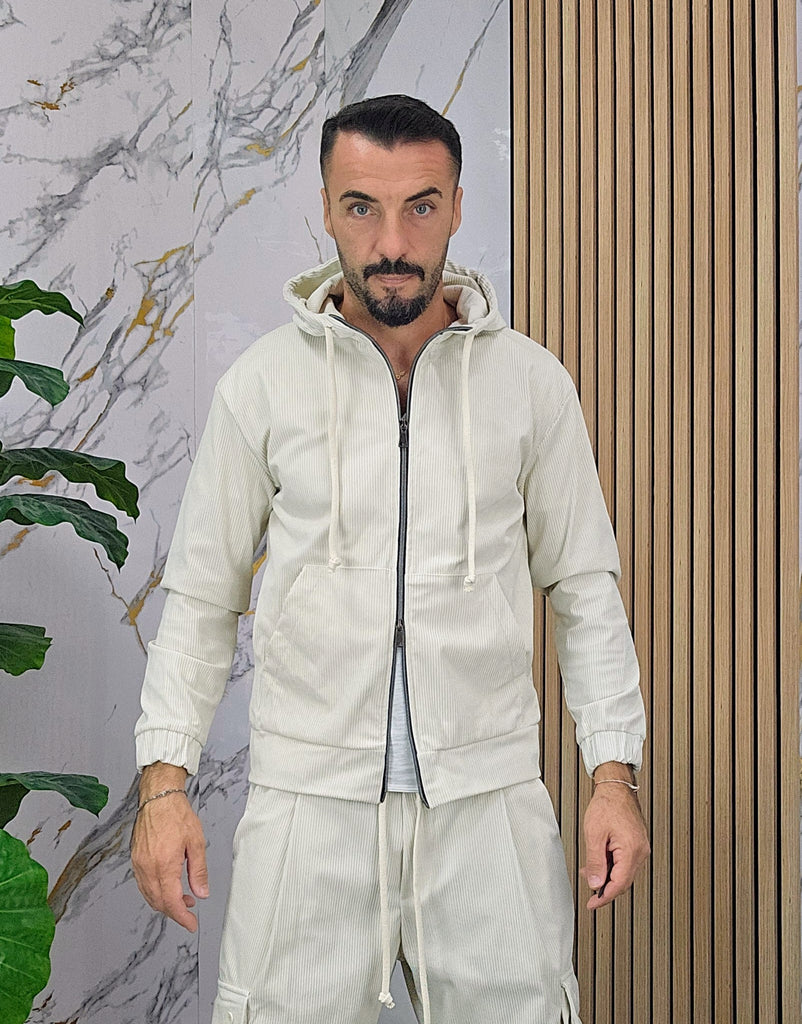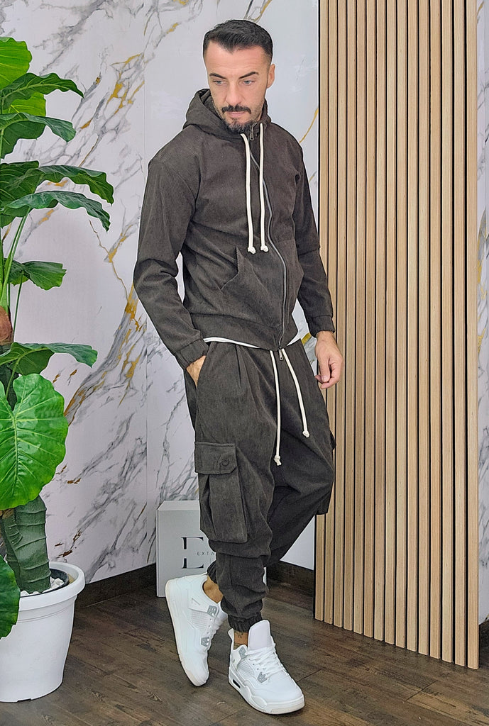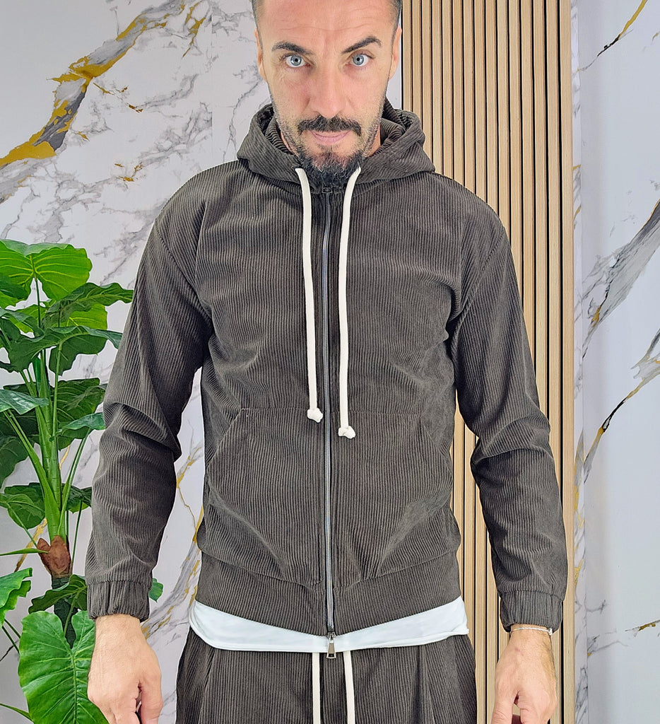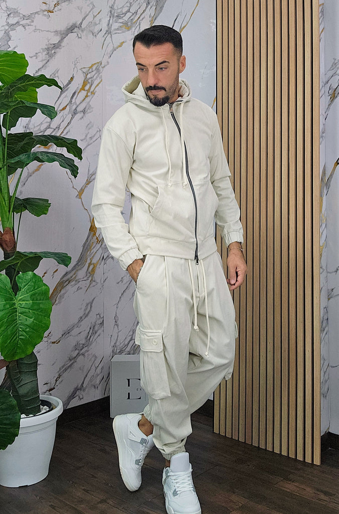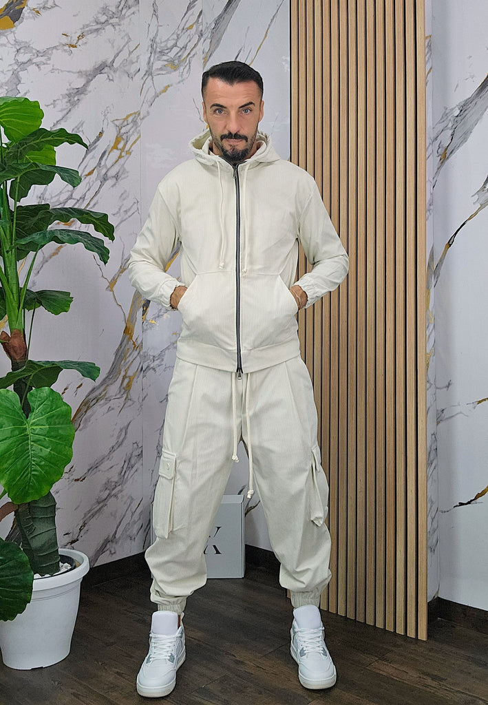 Tuta a costine in velluto rasato con chiusura zip centrale 2 tasche alla felpa doppio cursore cappuccio regolabile pantalone cargo con elastico alla caviglia, il modello in foto è alto 1.82x76kg è indossa una taglia S.Prodotto Made in Italy