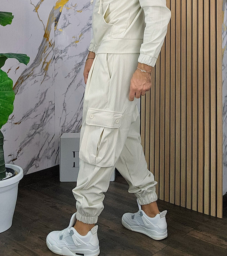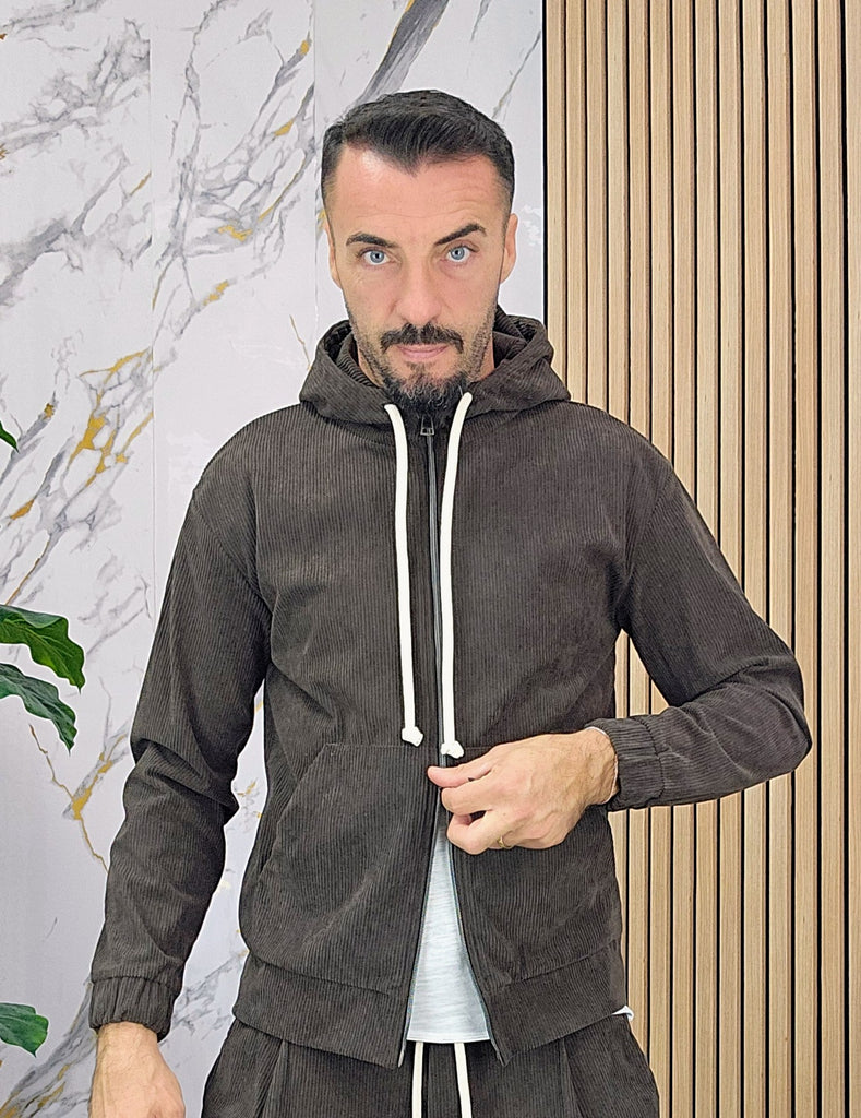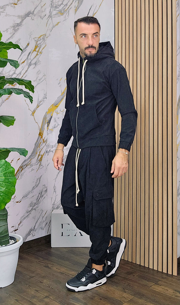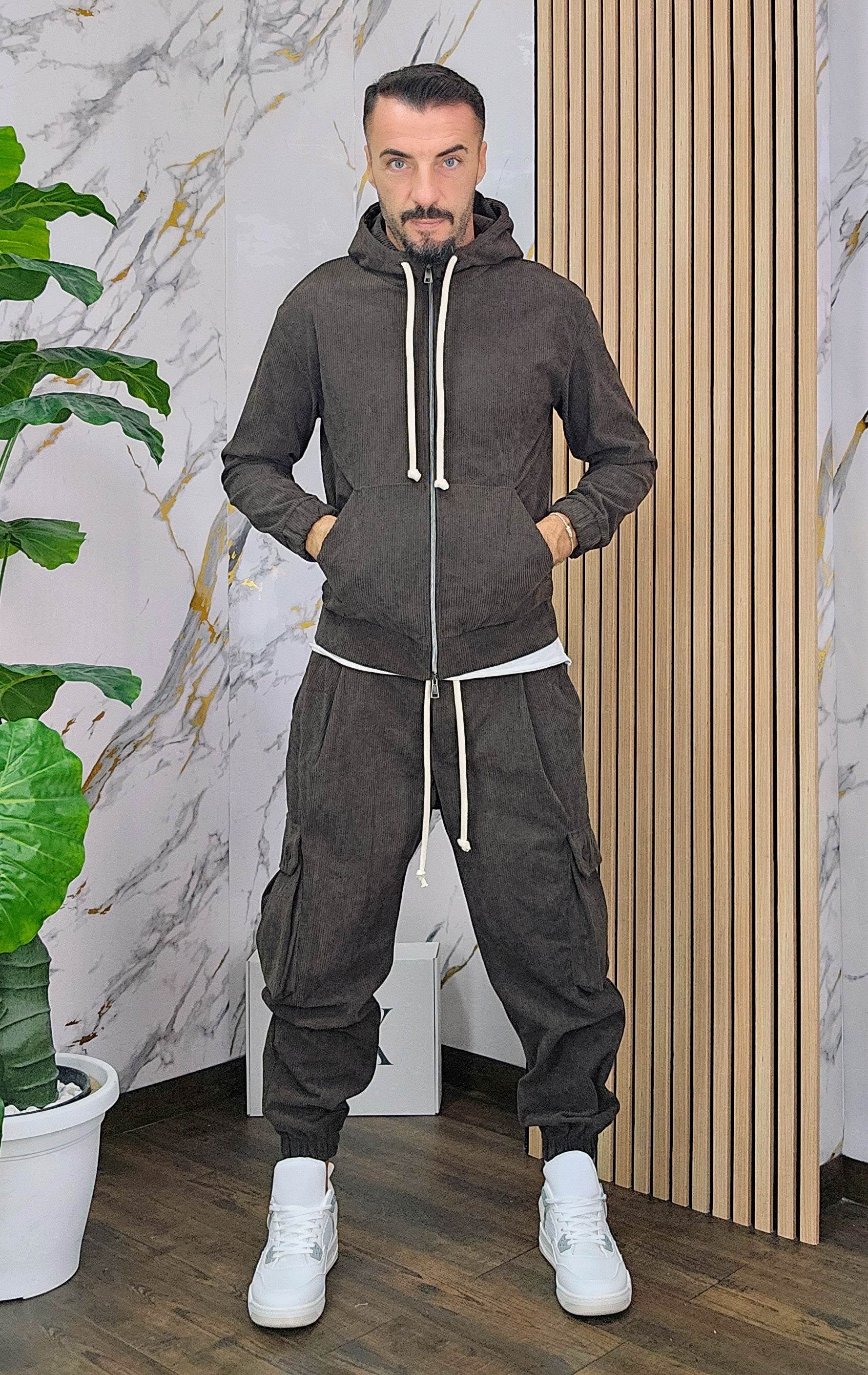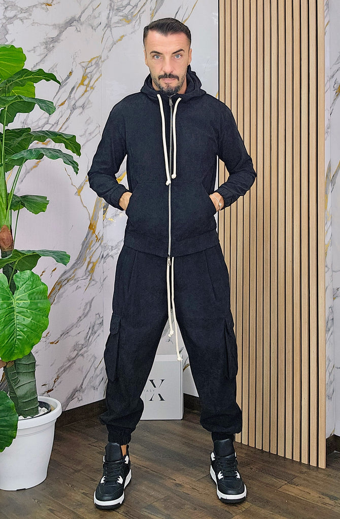 Tuta a costine in velluto rasato con chiusura zip centrale 2 tasche alla felpa doppio cursore cappuccio regolabile pantalone cargo con elastico alla caviglia, il modello in foto è alto 1.82x76kg è indossa una taglia S.Prodotto Made in Italy