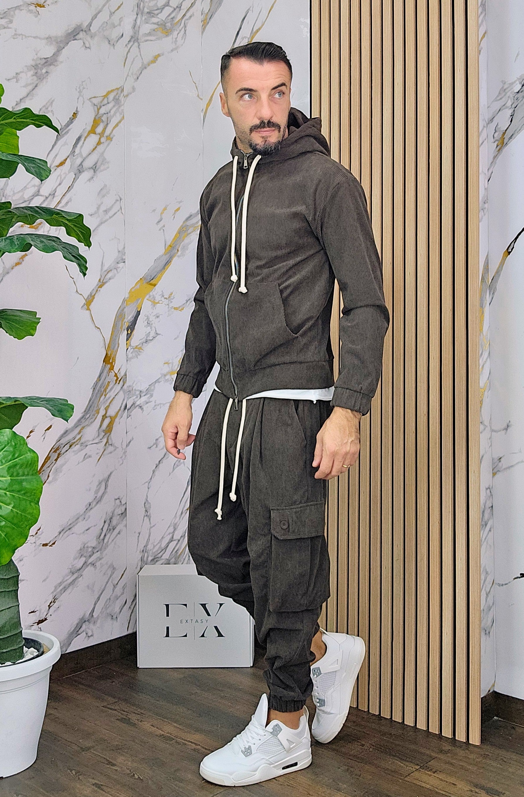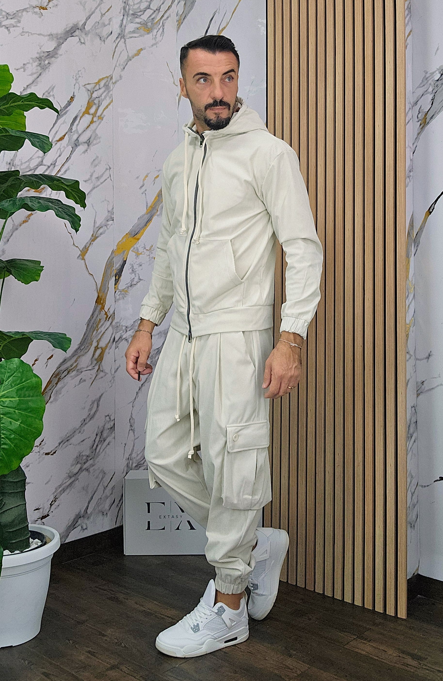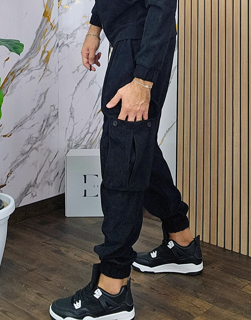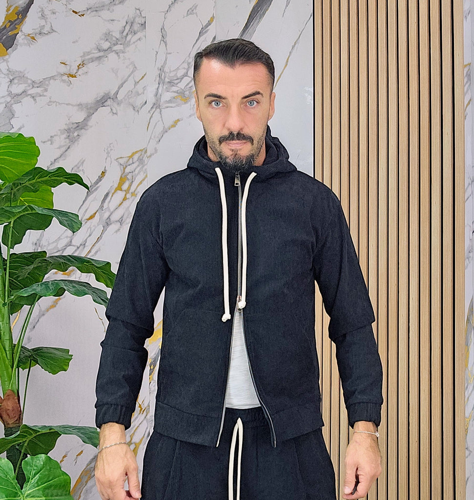 Tuta a costine in velluto rasato con chiusura zip centrale 2 tasche alla felpa doppio cursore cappuccio regolabile pantalone cargo con elastico alla caviglia, il modello in foto è alto 1.82x76kg è indossa una taglia S.Prodotto Made in Italy