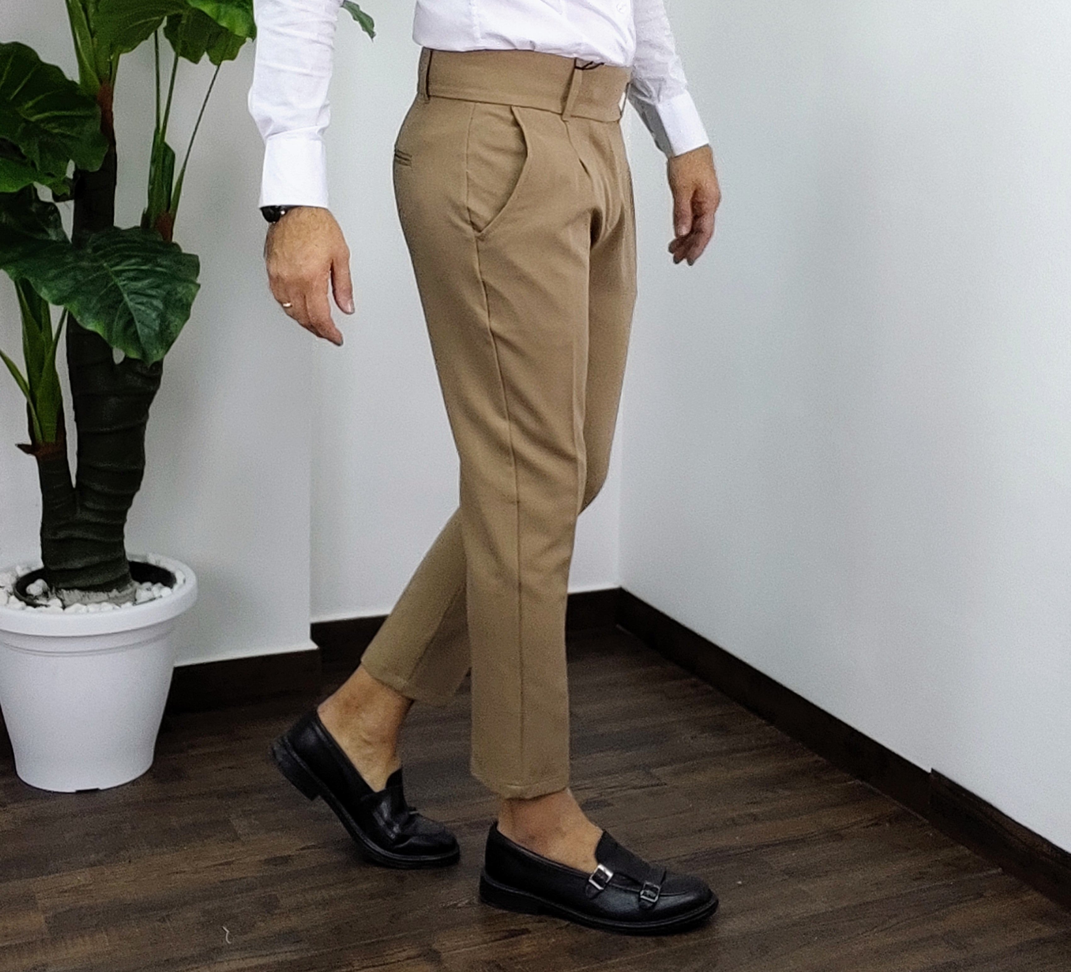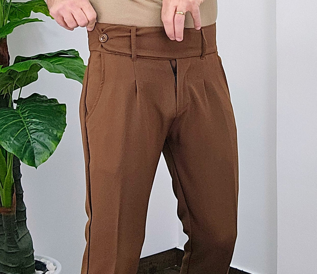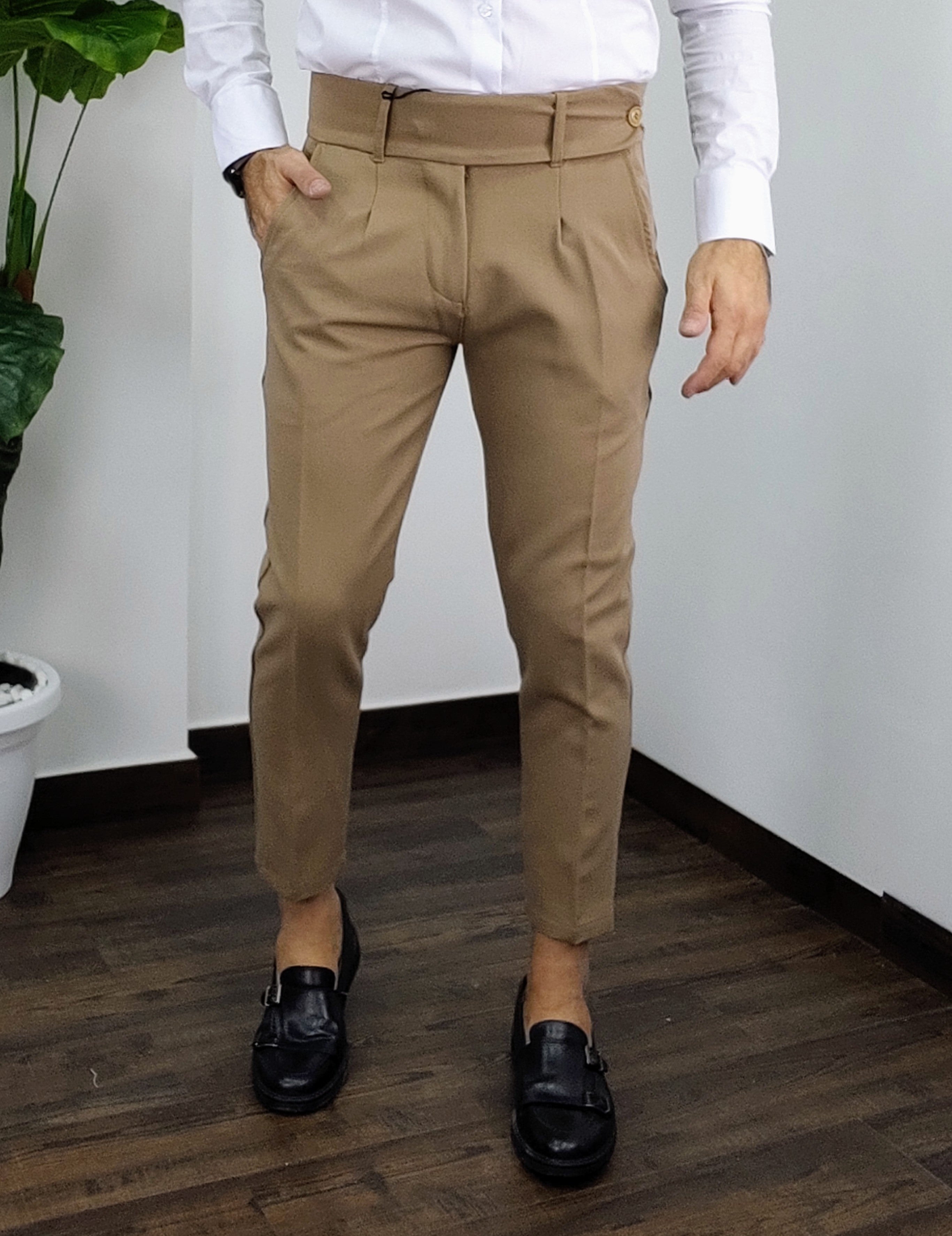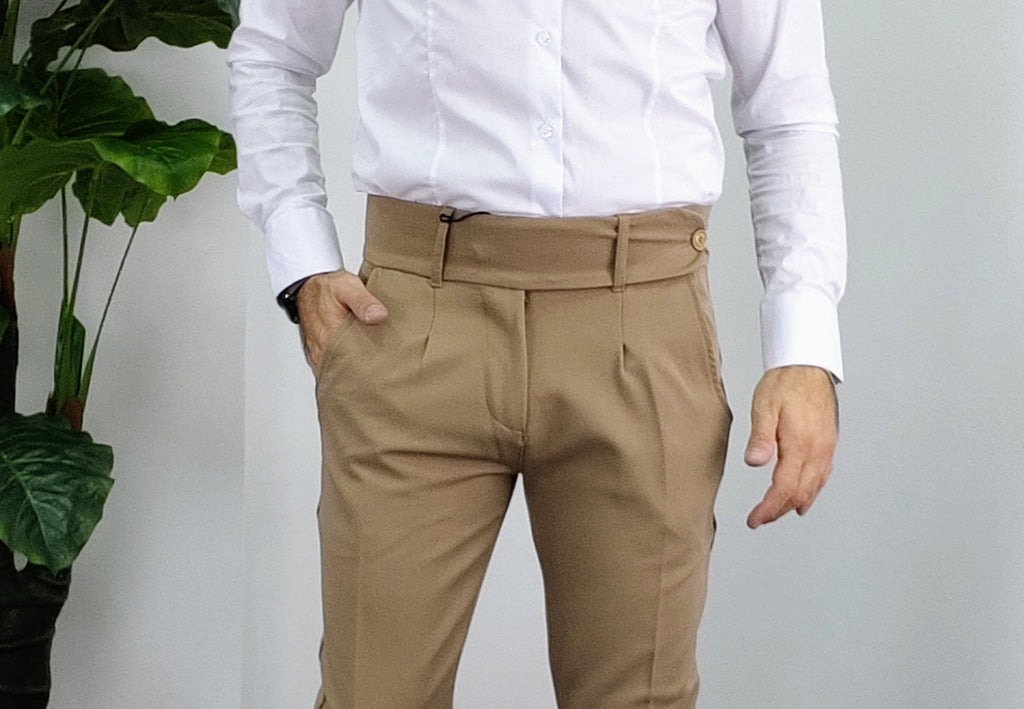 Pantalone vita alta con chiusura laterale ad un bottone modello Capri.Vestibilita'regular taglie dalla 44 alla 54.il modello in foto è Alto 1.82x76kg e indossa una taglia 48.Manifattura Made in Italy.
