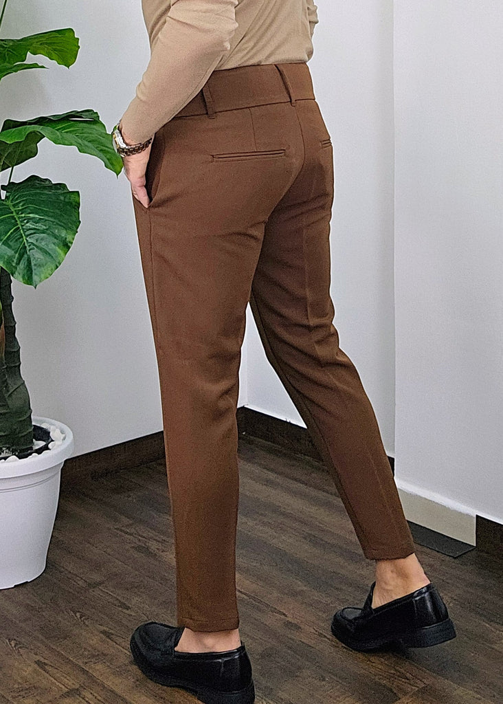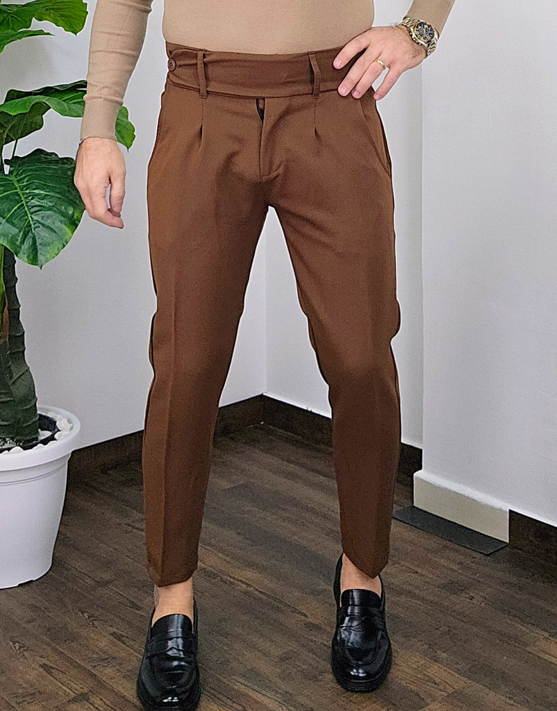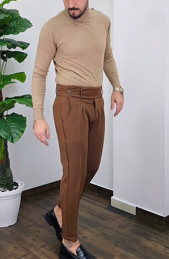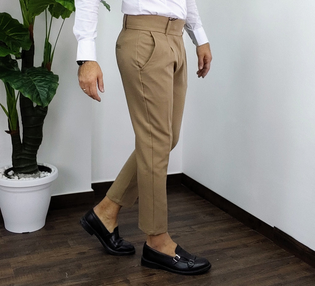 Pantalone vita alta con chiusura laterale ad un bottone modello Capri.Vestibilita'regular taglie dalla 44 alla 54.il modello in foto è Alto 1.82x76kg e indossa una taglia 48.Manifattura Made in Italy.