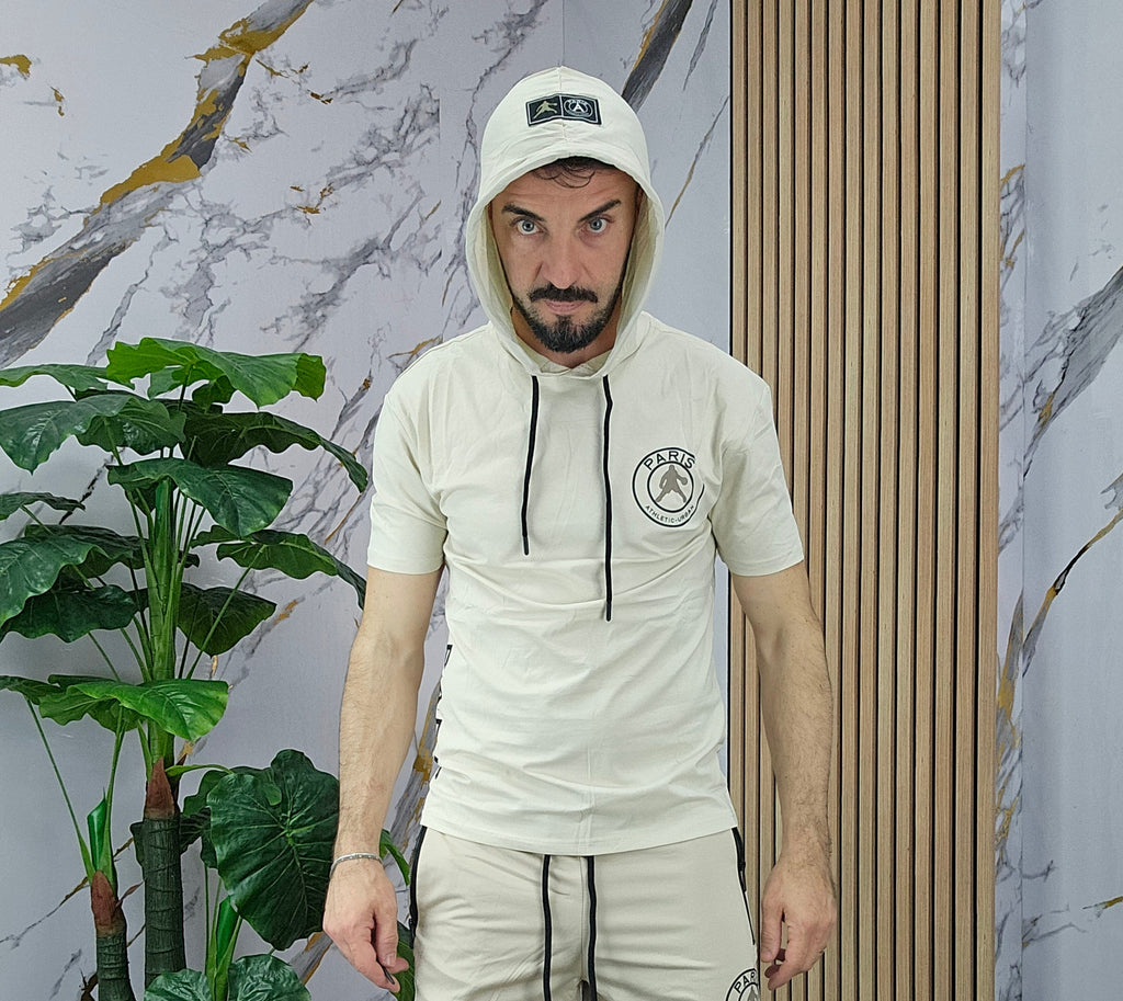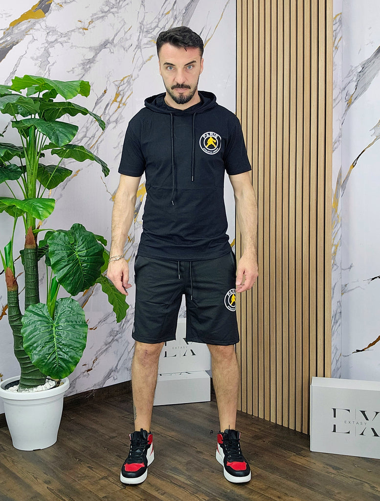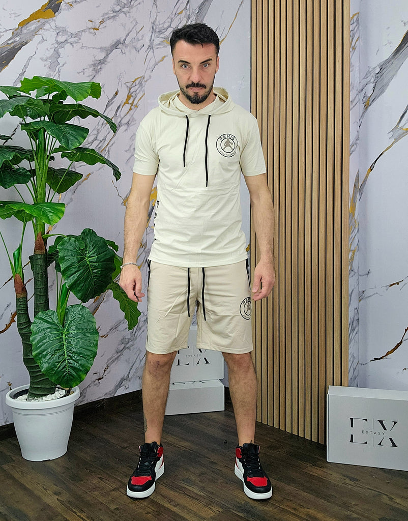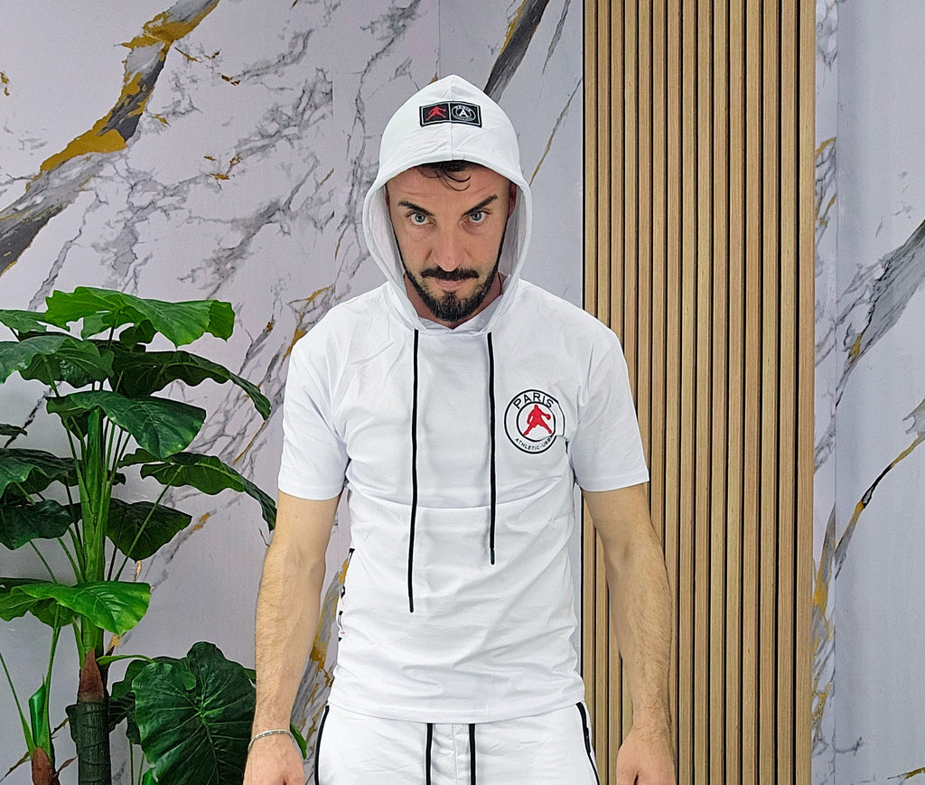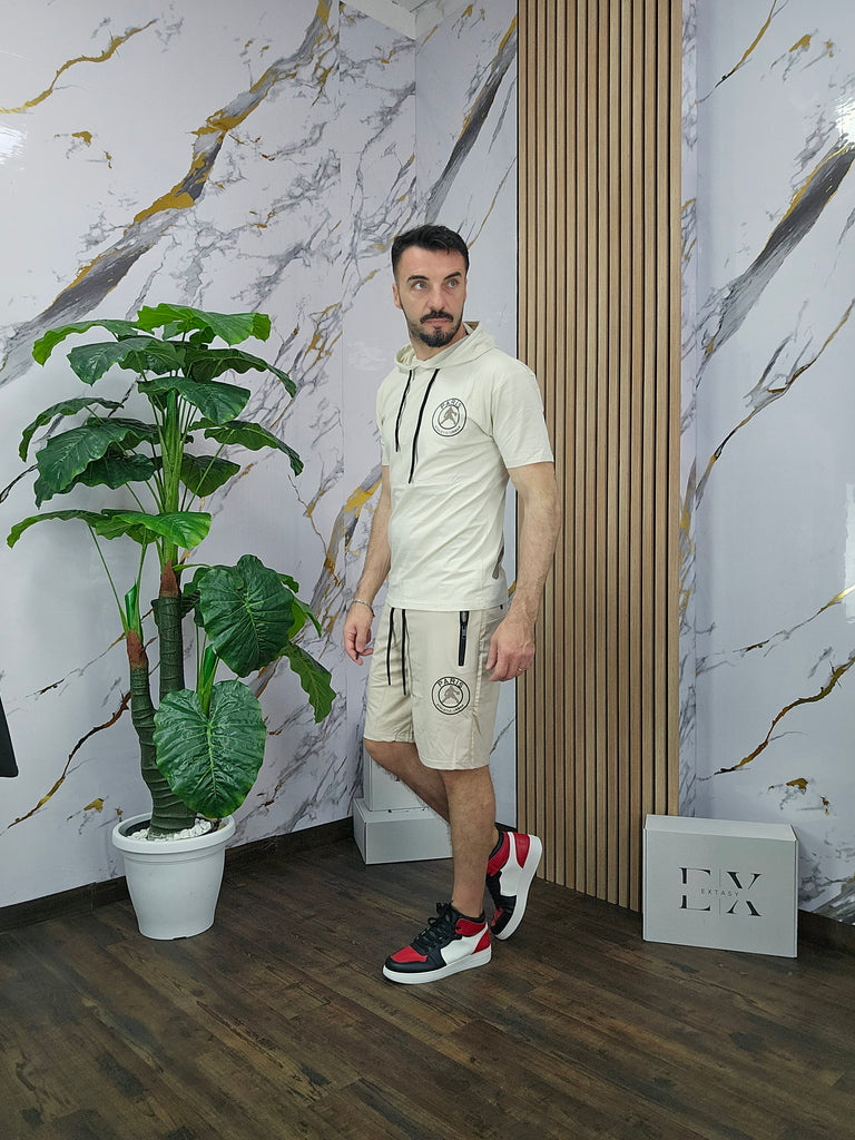 Completo corto con stampe scritta cucita al cappuccio bermuda con 2 tasche chiusura zip dalla M alla XXL, il modello in foto è alto 1.82x76kg è indossa una taglia M.Prodotto Made in Italy