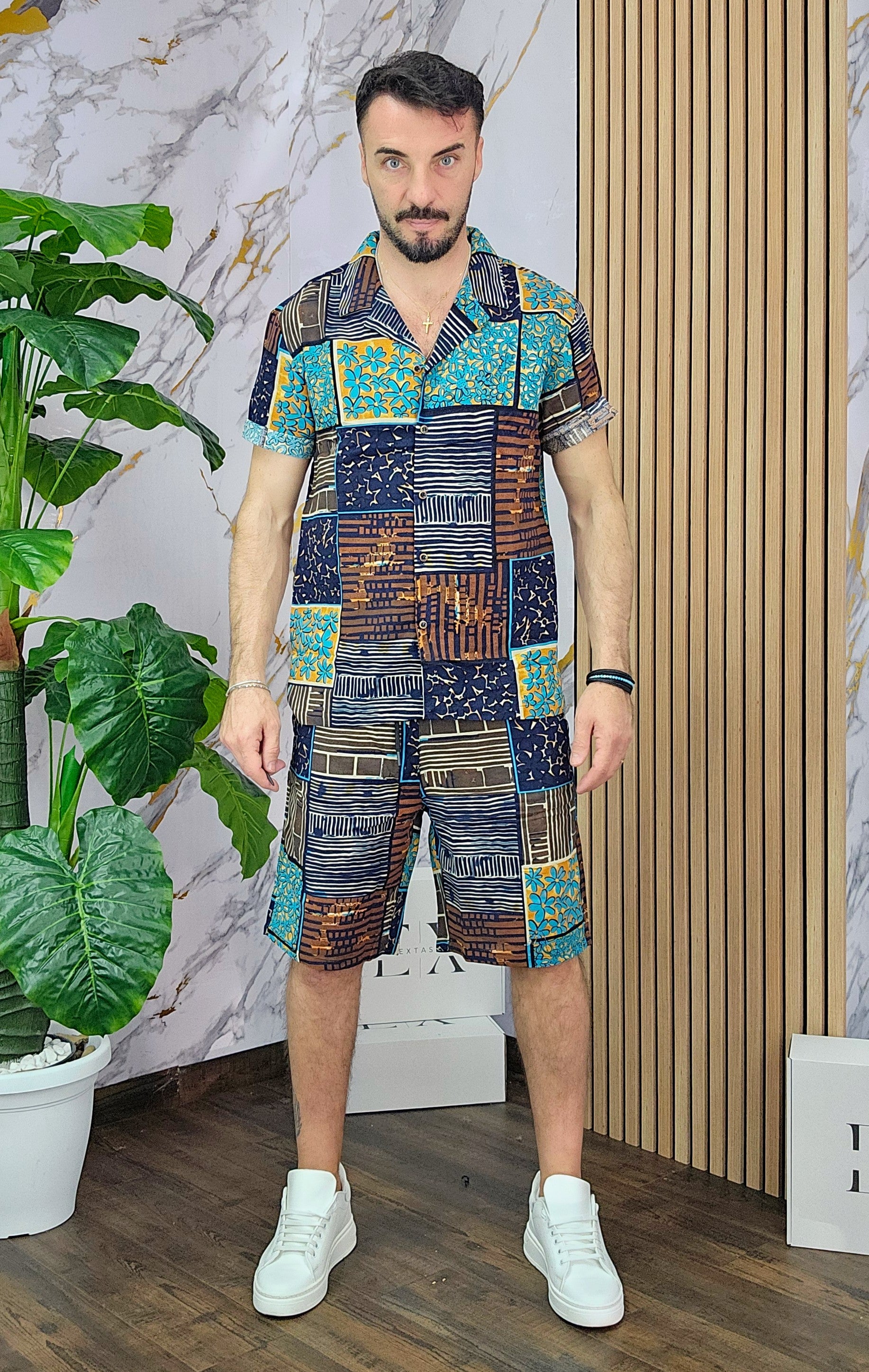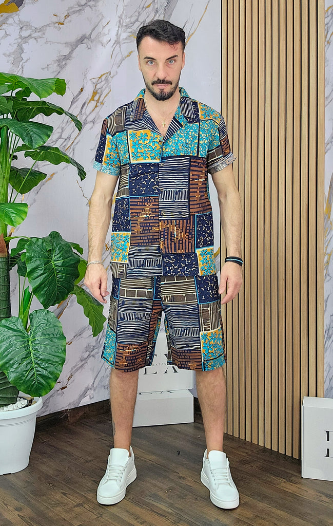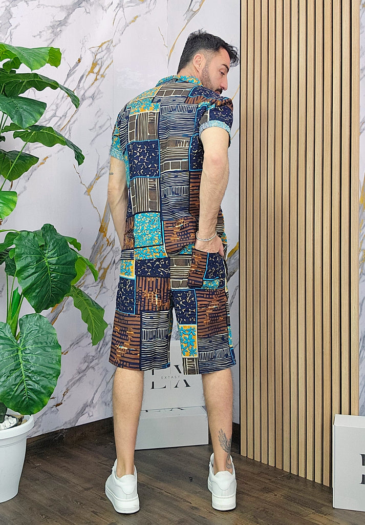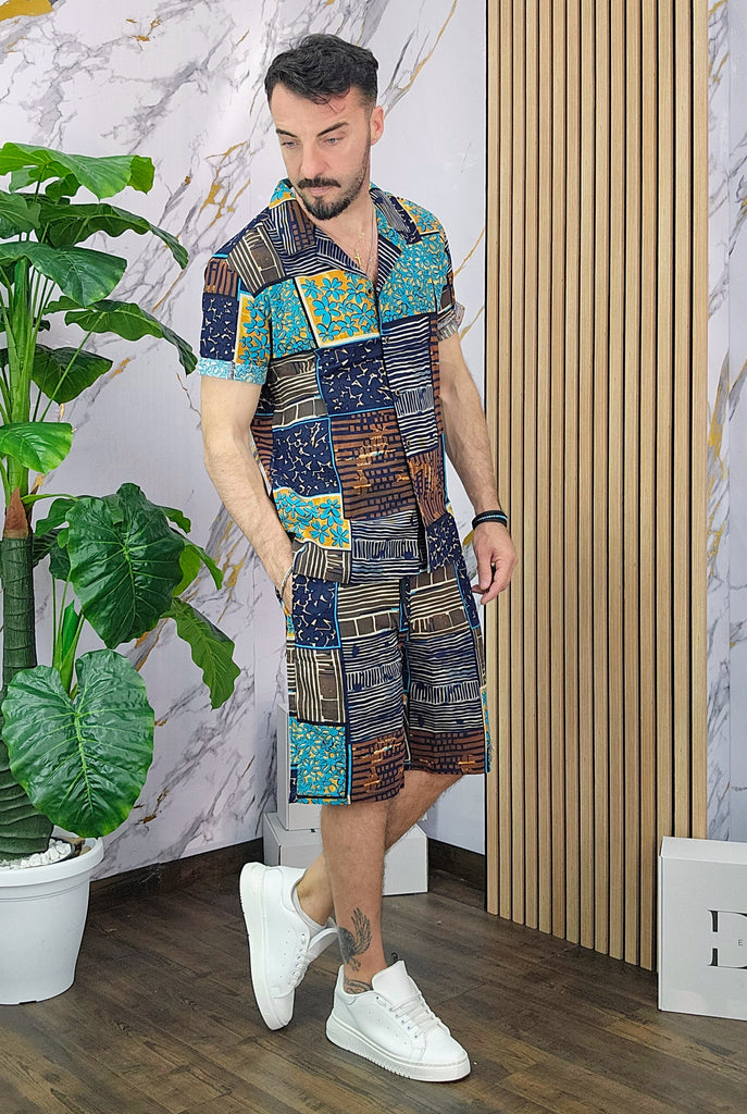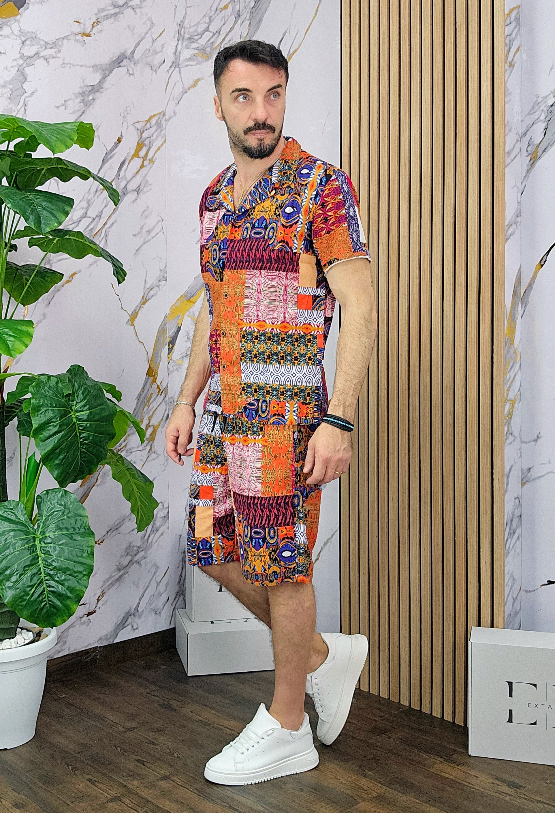 Coordinato a fantasia in misto lino cotone vestibilità regolare composto da camicia e bermuda con taschino sul retro dalla S alla XXL, il modello in foto è alto 1.82x76kg è indossa una taglia S.Prodotto Made in Italy