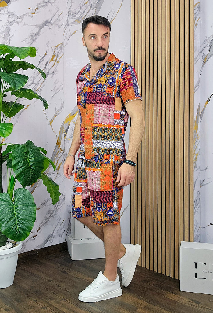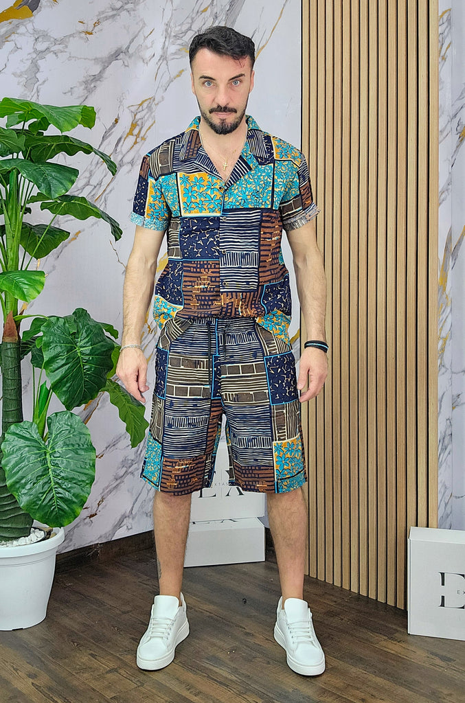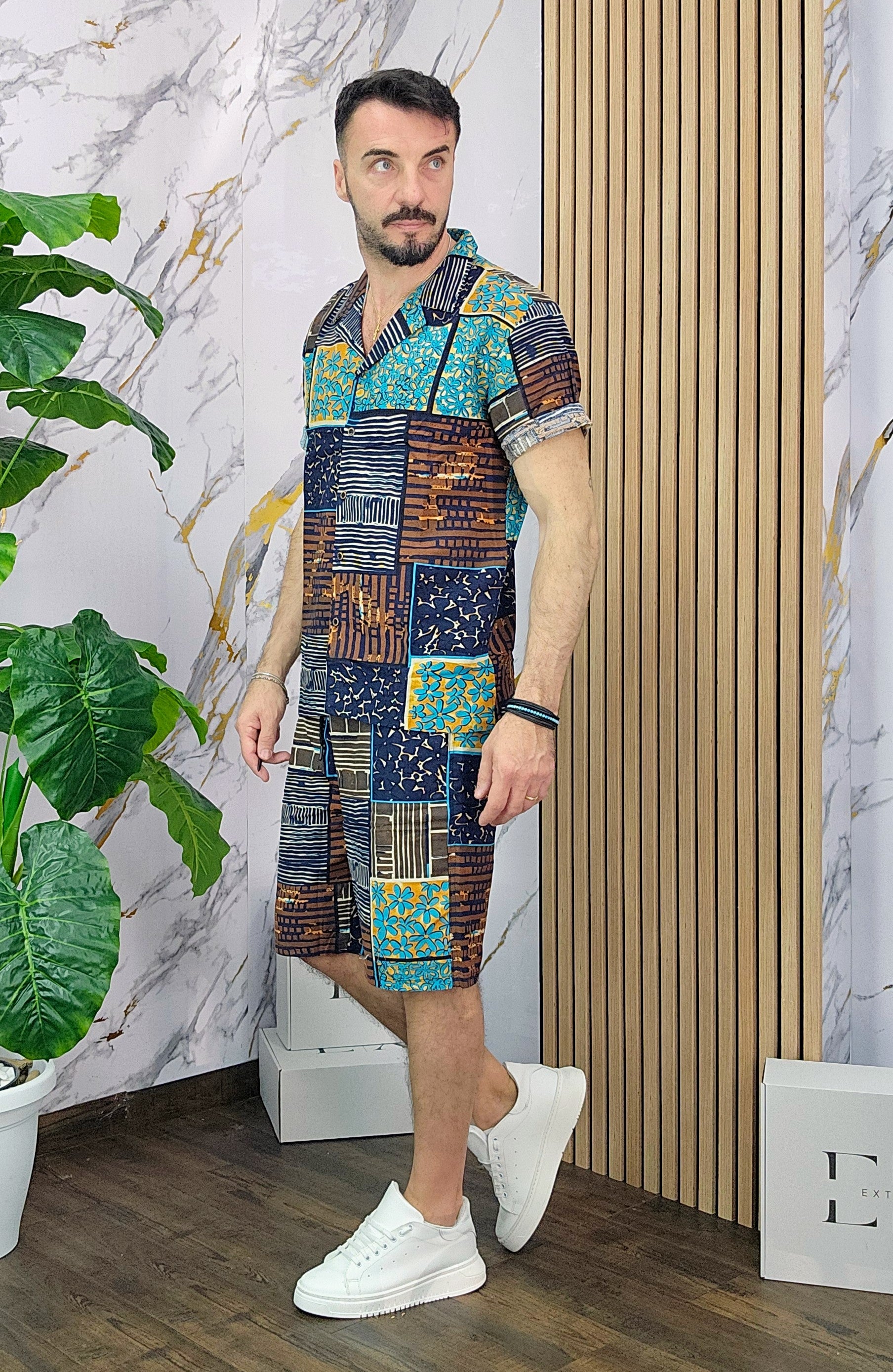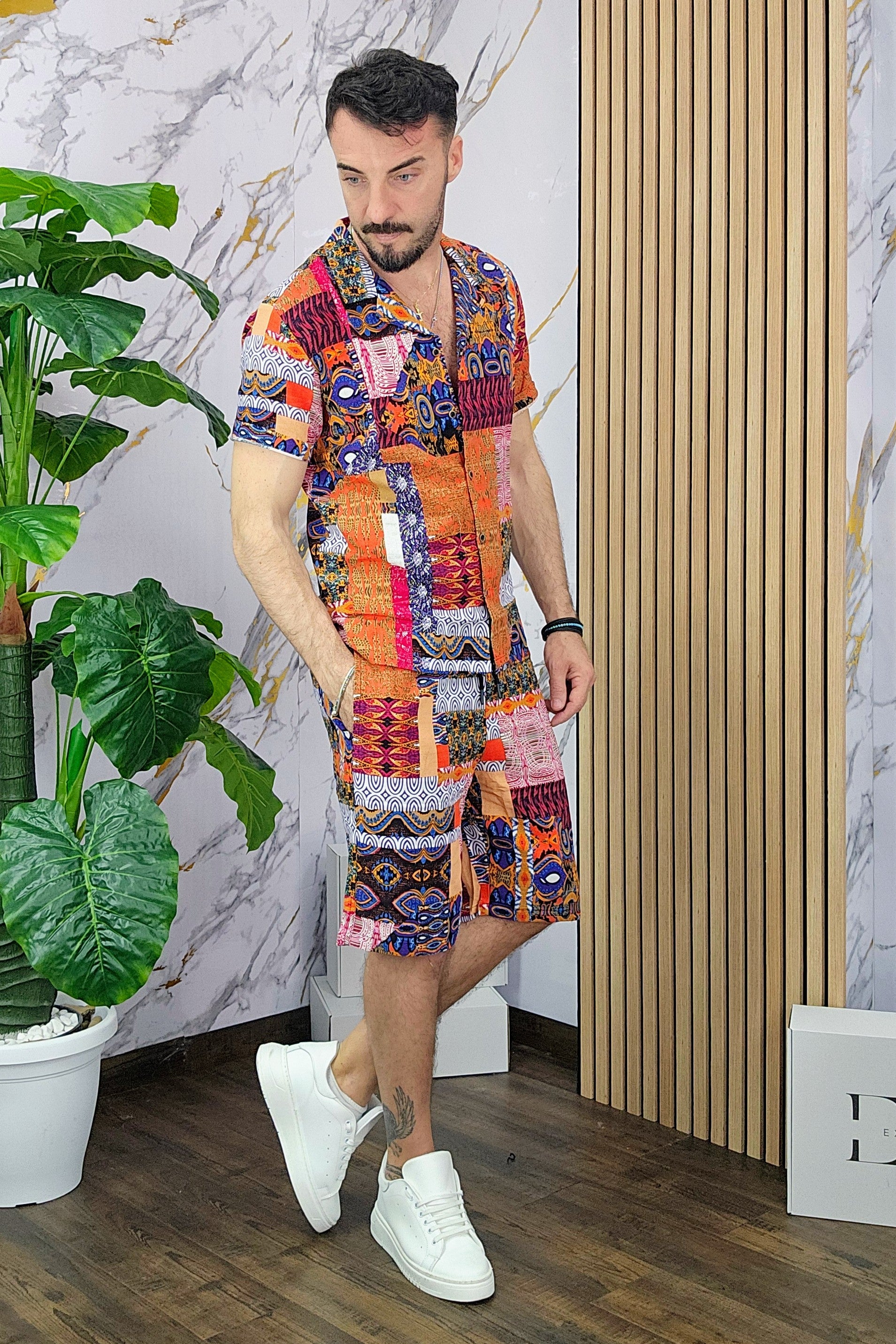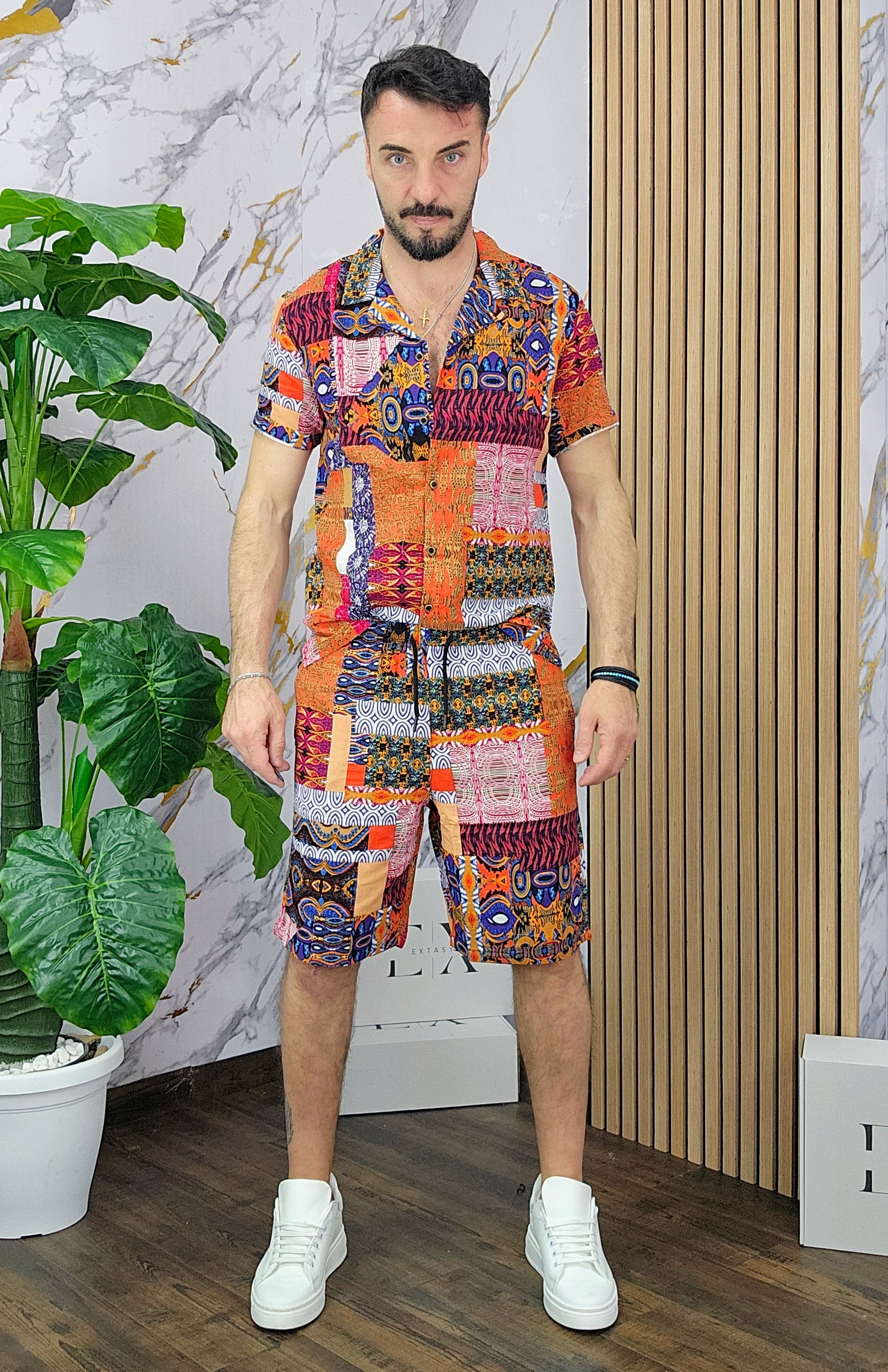 Coordinato a fantasia in misto lino cotone vestibilità regolare composto da camicia e bermuda con taschino sul retro dalla S alla XXL, il modello in foto è alto 1.82x76kg è indossa una taglia S.Prodotto Made in Italy