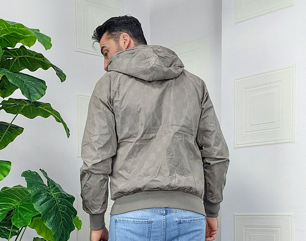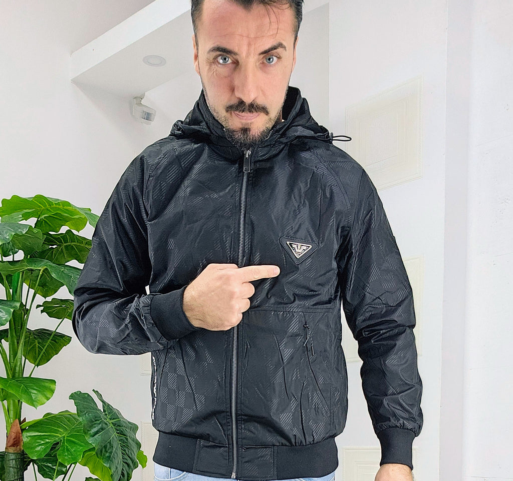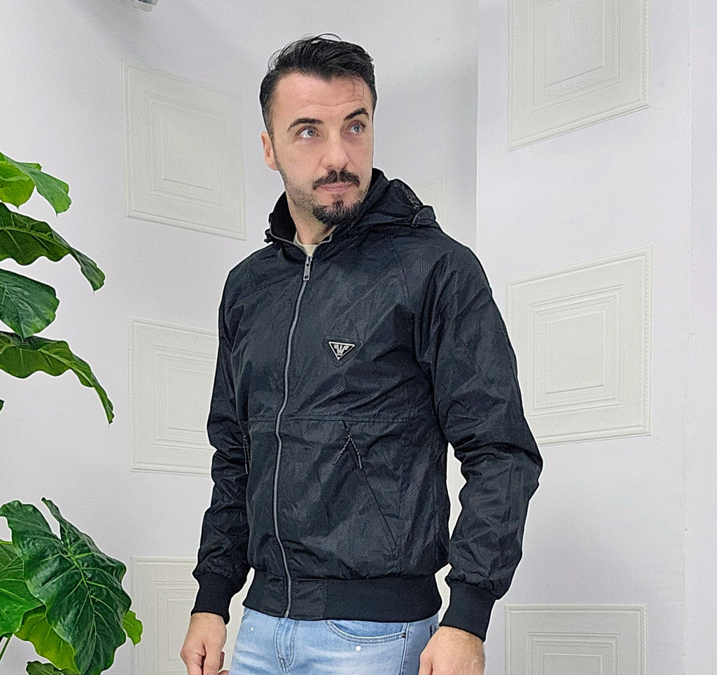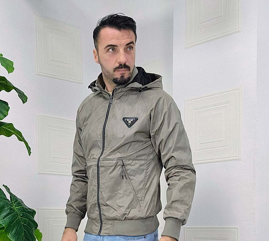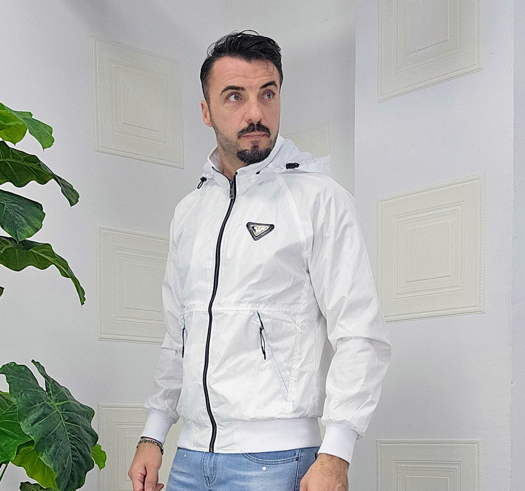 Giubbino primaverile vestibilità comoda antipioggia antivento chiusura zip centrale 2 chiusura zip laterale cappuccio regolabile estraibile effetto logo esterno targhetta in metallo lato cuore scritta cucita sul laterale dalla M alla XXL, il modello in foto è alto 1.82x76kg è indossa una taglia M.Prodotto Made in Italy
